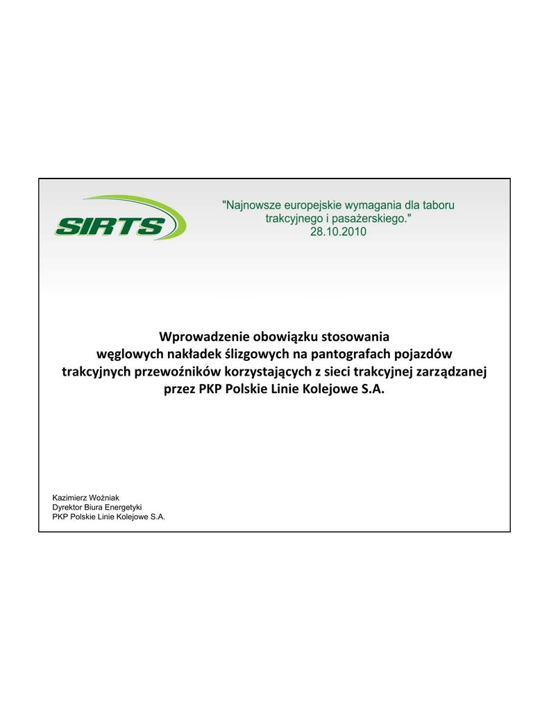 Wprowadzenie obowiązku stosowania węglowych nakładek ślizgowych na pantografach pojazdów trakcyjnych przewoźników korzystających z sieci trakcyjnej zarządzanej przez PKP Polskie Linie Kolejowe S.A. Kazimierz Woźniak Dyrektor Biura Energetyki PKP Polskie Linie Kolejowe S.A. Porównanie materiałów na nakładki ślizgowe Nakładka ślizgowa miedziana Tarcie miedzianych nakładek ślizgowych o przewody jezdne przewodzące jednocześnie prąd elektryczny, powoduje wzajemne uszkadzanie powierzchni trących. Obserwuje się między innymi występowanie niekorzystnych zjawisk: -zwiększenie zużycia zarówno powierzchni nakładek jak i przewodów jezdnych - łuszczenie się powierzchni zarówno przewodu jak i nakładki, - erozję punktową, - wyrywanie i przenoszenie cząstek materiału, - osadzanie się skroplin nadtopionego metalu. Zjawiska te pogarszają warunki współpracy w punkcie odbioru energii i powodują znaczne przyspieszenie zużycia powierzchni trących, czyli nakładki ślizgowej pantografu i sieci jezdnej. Nakładka ślizgowa węglowa Wśród materiałów stałych przewodzących prąd elektryczny i posiadających najlepsze właściwości smarne są związki grafitu (węgla). W efekcie silnej przyczepności cząstek grafitu do powierzchni metalu, w wyniku współpracy nakładki ślizgowej wykonanej z materiału na bazie węgla, na powierzchni przewodu jezdnego utworzona zostaje warstwa grafitu która powoduje: - obniżenie współczynnika tarcia pomiędzy nakładką i przewodem jezdnym, - zwiększa się odporność na działanie wyższych temperatur, - poprawiają się własności przewodzące prąd trakcyjny w miejscu styku i co najważniejsze – zmniejsza się w widoczny sposób zużycie zarówno nakładki stykowej jak i przewodu jezdnego. Porównanie zużycia przewodów jezdnych i czas eksploatacji sieci jezdnej z uwagi na stosowane materiały nakładek ślizgowych Materiał nakładki odbieraka prądu Węgiel Brąz spiekany Miedź Aluminium Wybrane przykłady zużywania się miedzianych przewodów jezdnych. Podstawy prawne wymiany nakładek ślizgowych Wymogi TSI: TSI Energia dla sieci prądu stałego określa, że przewód jezdny powinien być tak zaprojektowany, aby był zgodny z materiałami nakładek, które są określone w specyfikacji TSI Pojazdy trakcyjne. Dopuszczone w TSI materiały stosowane na nakładki stykowe pantografów pojazdów trakcyjnych to: - czysty węgiel, - węgiel z domieszką metali, - kompozyt warstwowy węgla i miedzi, przy czym zawartość metali nie powinna przekraczać 40% masy nakładki. Przyjęcie takich regulacji oznacza, że: - nowa interoperacyjna sieć trakcyjna będzie przystosowana do miękkich nakładek zawierających węgiel, - nowe i zmodernizowane pojazdy będą mogły wejść do eksploatacji tylko z nakładkami węgla lub węgla z jego domieszkami, - ocenę zgodności, jako składnika interoperacyjności dla nowych wyrobów będą mogły uzyskać tylko nakładki na bazie węgla zgodne z TSI. Powyższe uwarunkowania mogłyby sprawić, że na sieci PKP PLK S.A. mogłyby być eksploatowane pojazdy nowe z nakładkami węglowymi i stare z miedzianymi, co ma poważne konsekwencje ekonomiczne, gdyż nakładki miedziane zużywają przewód jezdny doprowadzając go do porowatości. To z kolei powoduje bardzo szybkie zużywanie się w pojazdach trakcyjnych nakładek węglowych bardziej miękkich od miedzianych. Podstawy prawne wymiany nakładek ślizgowych Wymogi TSI – c.d.: W efekcie mogłoby dochodzić do następujących sytuacji: - dysponent nowego interoperacyjnego taboru będzie ponosił poważne straty w wyniku przyspieszonego zużywania się nakładek węglowych, - zarządca infrastruktury będzie ponosił duże straty w wyniku przyspieszonego zużywania się przewodu jezdnego, zwłaszcza w aspekcie inwestycji w nową sieć trakcyjną która nie wykaże wymaganej w projekcie inwestycyjnym żywotności. Problem ten (głównie kategorii ekonomicznej) został rozwiązany na innych sieciach kolejowych poprzez decyzje zarządców infrastruktury, którzy określili listę dopuszczonych do eksploatacji materiałów na nakładki stykowe pantografów. Aby zapewnić pełną interoperacyjność w tym zakresie oraz zachować minimum efektywności ekonomicznej konieczne jest wprowadzenie, jako warunku korzystania z infrastruktury zarządzanej przez PKP PLK S.A., obowiązku stosowania tylko nakładek stykowych wykonanych z materiałów węglowych. Powyższe uwarunkowania wykazały potrzebę podjęcia przez PKP Polskie Linie Kolejowe S.A. działań mających na celu wprowadzenie obowiązku stosowanie nakładek węglowych na pantografach elektrycznych pojazdów trakcyjnych przez przewoźników korzystających z sieci trakcyjnej PKP Polskie Linie Kolejowe S.A. Podstawy prawne wymiany nakładek ślizgowych Prawo krajowe: 1. Ustawa z dnia 28 marca 2003 r. o transporcie kolejowym (Dz. U. z 2007 r. Nr 16 poz. 94 ze zm.): - „Art. 20 Minister właściwy do spraw transportu określi, w drodze rozporządzenia, ogólne warunki techniczne eksploatacji pojazdów kolejowych, …” - „Art. 25d ust. 1. W przypadku gdy TSI nie zostały ogłoszone przez komisję europejską lub w przypadkach określonych w art. 25f, Prezes UTK ustala listę właściwych krajowych specyfikacji technicznych i dokumentów normalizacyjnych, których zastosowanie umożliwi spełnienie zasadniczych wymagań dotyczących interoperacyjności kolei. ust. 2 Listę, o której mowa w ust. 1 ogłasza się, w drodze obwieszczenia, w dzienniku urzędowym ministra właściwego do spraw transportu. - Art. 32 ust. 1 „Zarządca opracowuje regulamin określający w szczególności: pkt. 2. charakterystykę infrastruktury kolejowej przeznaczonej do udostępnienia przewoźnikom kolejowym oraz informację o warunkach dostępu do niej oraz pkt. 4. warunki korzystania z udostępnianej infrastruktury kolejowej. 2. Obwieszczenie Prezesa Urzędu Transportu Kolejowego Dz. Urzędowy Ministra Inf