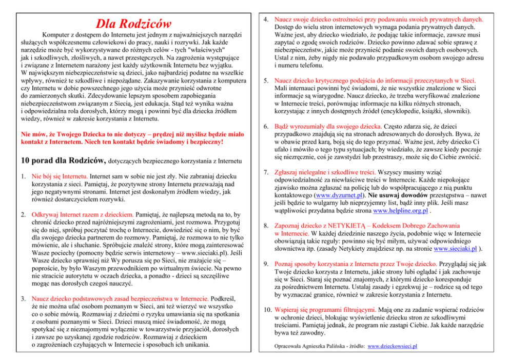Dla Rodziców Komputer z dostępem do Internetu jest jednym z najważniejszych narzędzi służących współczesnemu człowiekowi do pracy, nauki i rozrywki. Jak każde narzędzie może być wykorzystywane do różnych celów - tych "właściwych" jak i szkodliwych, złośliwych, a nawet przestępczych. Na zagrożenia występujące i związane z Internetem narażony jest każdy użytkownik Internetu bez wyjątku. W największym niebezpieczeństwie są dzieci, jako najbardziej podatne na wszelkie wpływy, również te szkodliwe i niepożądane. Zakazywanie korzystania z komputera czy Internetu w dobie powszechnego jego użycia może przynieść odwrotne do zamierzonych skutki. Zdecydowanie lepszym sposobem zapobiegania niebezpieczeństwom związanym z Siecią, jest edukacja. Stąd też wynika ważna i odpowiedzialna rola dorosłych, którzy mogą i powinni być dla dziecka źródłem wiedzy, również w zakresie korzystania z Internetu. Nie mów, że Twojego Dziecka to nie dotyczy – prędzej niż myślisz będzie miało kontakt z Internetem. Niech ten kontakt będzie świadomy i bezpieczny! 10 porad dla Rodziców, dotyczących bezpiecznego korzystania z Internetu 1. Nie bój się Internetu. Internet sam w sobie nie jest zły. Nie zabraniaj dziecku korzystania z sieci. Pamiętaj, że pozytywne strony Internetu przeważają nad jego negatywnymi stronami. Internet jest doskonałym źródłem wiedzy, jak również dostarczycielem rozrywki. 2. Odkrywaj Internet razem z dzieckiem. Pamiętaj, że najlepszą metodą na to, by chronić dziecko przed najróżniejszymi zagrożeniami, jest rozmowa. Przygotuj się do niej, spróbuj poczytać trochę o Internecie, dowiedzieć się o nim, by być dla swojego dziecka partnerem do rozmowy. Pamiętaj, że rozmowa to nie tylko mówienie, ale i słuchanie. Spróbujcie znaleźć strony, które mogą zainteresować Wasze pociechy (pomocny będzie serwis internetowy – www.sieciaki.pl). Jeśli Wasze dziecko sprawniej niż Wy porusza się po Sieci, nie zrażajcie się – poproście, by było Waszym przewodnikiem po wirtualnym świecie. Na pewno nie stracicie autorytetu w oczach dziecka, a ponadto - dzieci są szczęśliwe mogąc nas dorosłych czegoś nauczyć. 3. Naucz dziecko podstawowych zasad bezpieczeństwa w Internecie. Podkreśl, że nie można ufać osobom poznanym w Sieci, ani też wierzyć we wszystko co o sobie mówią. Rozmawiaj z dziećmi o ryzyku umawiania się na spotkania z osobami poznanymi w Sieci. Dzieci muszą mieć świadomość, że mogą spotykać się z nieznajomymi wyłącznie w towarzystwie przyjaciół, dorosłych i zawsze po uzyskanej zgodzie rodziców. Rozmawiaj z dzieckiem o zagrożeniach czyhających w Internecie i sposobach ich unikania. 4. Naucz swoje dziecko ostrożności przy podawaniu swoich prywatnych danych. Dostęp do wielu stron internetowych wymaga podania prywatnych danych. Ważne jest, aby dziecko wiedziało, że podając takie informacje, zawsze musi zapytać o zgodę swoich rodziców. Dziecko powinno zdawać sobie sprawę z niebezpieczeństw, jakie może przynieść podanie swoich danych osobowych. Ustal z nim, żeby nigdy nie podawało przypadkowym osobom swojego adresu i numeru telefonu. 5. Naucz dziecko krytycznego podejścia do informacji przeczytanych w Sieci. Mali internauci powinni być świadomi, że nie wszystkie znalezione w Sieci informacje są wiarygodne. Naucz dziecko, że trzeba weryfikować znalezione w Internecie treści, porównując informacje na kilku różnych stronach, korzystając z innych dostępnych źródeł (encyklopedie, książki, słowniki). 6. Bądź wyrozumiały dla swojego dziecka. Często zdarza się, że dzieci przypadkowo znajdują się na stronach adresowanych do dorosłych. Bywa, że w obawie przed karą, boją się do tego przyznać. Ważne jest, żeby dziecko Ci ufało i mówiło o tego typu sytuacjach; by wiedziało, że zawsze kiedy poczuje się niezręcznie, coś je zawstydzi lub przestraszy, może się do Ciebie zwrócić. 7. Zgłaszaj nielegalne i szkodliwe treści. Wszyscy musimy wziąć odpowiedzialność za niewłaściwe treści w Internecie. Każde niepokojące zjawisko można zgłaszać na policję lub do współpracującego z nią punktu kontaktowego (www.dyzurnet.pl). Nie usuwaj dowodów przestępstwa – nawet jeśli będzie to wulgarny lub nieprzyjemny list, bądź inny plik. Jeśli masz wątpliwości przydatna będzie strona www.helpline.org.pl . 8. Zapoznaj dziecko z NETYKIETĄ – Kodeksem Dobrego Zachowania w Internecie. W każdej dziedzinie naszego życia, podobnie więc w Internecie obowiązują takie reguły: powinno się być miłym, używać odpowiedniego słownictwa itp. (zasady Netykiety znajdziesz np. na stronie www.sieciaki.pl ). 9. Poznaj sposoby korzystania z Internetu przez Twoje dziecko. Przyglądaj się jak Twoje dziecko korzysta z Internetu, jakie strony lubi oglądać i jak zachowuje się w Sieci. Staraj się poznać znajomych, z którymi dziecko koresponduje za pośrednictwem Internetu. Ustalaj zasady i egzekwuj je – rodzice są od tego by wyznaczać granice, również w zakresie korzystania z Internetu. 10. Wspieraj się programami filtrującymi. Mają one za zadanie wspierać rodziców w ochronie dzieci, blokując wyświetlenie dziecku stron ze szkodliwymi treściami. Pamiętaj jednak, że program nie zastąpi Ciebie. Jak każde narzędzie bywa też zawodny. Opracowała Agnieszka Palińska - źródło: www.dzieckowsieci.pl Dla Dzieci Internet może być fajny i przydatny, ale są też w nim różne zagrożenia i niebezpieczeństwa, o których trzeba wiedzieć i pamiętać. Zapoznaj się z tymi zagrożeniami!!! Szkodliwe treści – to takie teksty, zdjęcia, filmy i nagrania, które są nielegalne lub przeznaczone tylko dla dorosłych. Kontakt z nimi może być dla Ciebie przykry, mogą Cię przestraszyć, zawstydzić lub spowodować, że poczujesz się źle. Pamiętaj, że możesz na nie natrafić zupełnie przypadkowo, to się zdarza 