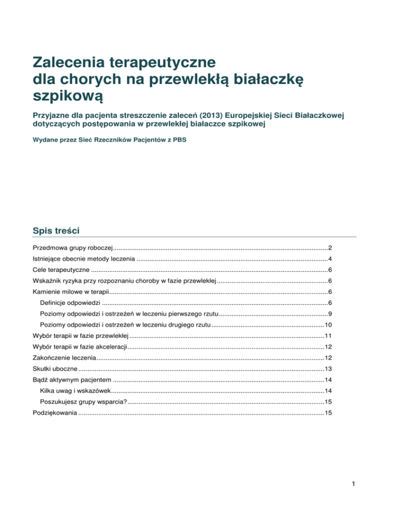 Zalecenia terapeutyczne dla chorych na przewlekłą białaczkę szpikową Przyjazne dla pacjenta streszczenie zaleceń (2013) Europejskiej Sieci Białaczkowej dotyczących postępowania w przewlekłej białaczce szpikowej Wydane przez Sieć Rzeczników Pacjentów z PBS Spis treści Przedmowa grupy roboczej ...................................................................................................................... 2 Istniejące obecnie metody leczenia ......................................................................................................... 4 Cele terapeutyczne .................................................................................................................................. 6 Wskaźnik ryzyka przy rozpoznaniu choroby w fazie przewlekłej ............................................................. 6 Kamienie milowe w terapii ........................................................................................................................ 6 Definicje odpowiedzi ............................................................................................................................ 6 Poziomy odpowiedzi i ostrzeżeń w leczeniu pierwszego rzutu ............................................................ 9 Poziomy odpowiedzi i ostrzeżeń w leczeniu drugiego rzutu .............................................................. 10 Wybór terapii w fazie przewlekłej ........................................................................................................... 11 Wybór terapii w fazie akceleracji ............................................................................................................ 12 Zakończenie leczenia ............................................................................................................................. 12 Skutki uboczne ....................................................................................................................................... 13 Bądź aktywnym pacjentem .................................................................................................................... 14 Kilka uwag i wskazówek ..................................................................................................................... 14 Poszukujesz grupy wsparcia? ............................................................................................................ 15 Podziękowania ....................................................................................................................................... 15 1 Przedmowa grupy roboczej Przewlekła białaczka szpikowa (PBS) jest chroniczną chorobą krwi i szpiku kostnego, której pierwotną przyczyną jest transformacja nowotworowa komórki macierzystej. Komórki macierzyste to swego rodzaju zarodki w szpiku kostnym, które podczas dojrzewania przekształcają się w trzy główne rodzaje komórek krwi: krwinki białe (leukocyty), krwinki czerwone (erytrocyty) i krwinki płytkowe (płytki krwi, trombocyty). Białaczkowe komórki macierzyste są nieprawidłowe i powodują nadmierną produkcję białych krwinek, które przedostają się do krwiobiegu i krążą w całym organizmie. U chorych zwykle powiększa się śledziona. W końcu dochodzi do zastąpienia przez komórki białaczkowe normalnych komórek w szpiku kostnym, co uniemożliwia wytwarzanie zdrowych komórek krwi. W miarę postępu choroby zmniejsza się liczba prawidłowych leukocytów i, oprócz tego, może wystąpić nadprodukcja niedojrzałych komórek leukemicznych, zwanych w żargonie medycznym blastami. W komórkach przewlekłej białaczki szpikowej część jednego chromosomu (numer 9) jest zamieniana na część innego chromosomu (numer 22), wskutek czego powstaje tak zwany chromosom Filadelfia (Philadelphia). W wyniku tego gen zwany Abl, który normalnie znajduje się na chromosomie 9, przemieszcza się i łączy z genem o nazwie BCR, który normalnie znajduje się na chromosomie 22. Ta fuzja (połączenie) genów BCR i Abl daje w rezultacie nieprawidłowy gen o podwyższonej i nieregulowanej ściśle aktywności kinazy tyrozynowej. Prowadzi to do zwiększenia liczby leukocytów i jest uważane za przyczynę przewlekłej białaczki szpikowej. Terapia ukierunkowana na zahamowanie aktywności kinazy tyrozynowej produkowanej przez gen BCR-Abl zrewolucjonizowała leczenie tej choroby na przestrzeni ostatnich piętnastu lat. Europejska Sieć Białaczkowa (European LeukemiaNet – ELN), badawcza sieć doskonałości finansowana przez Unię Europejską, w roku 2006, 2009 i 2013 wydała zalecenia dotyczące postępowania terapeutycznego. Wynikają one z konsensusu 32 ekspertów (z Europy, Ameryki, Azji i regionu Pacyfiku) w dziedzinie przewlekłej białaczki szpikowej, opartym na najlepszych danych naukowych dostępnych w momencie publikacji. Opracowane dla lekarzy zajmujących się tą chorobą, powinny być uznawane przez nich za standard opieki medycznej. Zalecenia odnoszące się do terapii przewlekłej białaczki szpikowej mogą być trudne do zrozumienia przez pacjentów. Sporządziliśmy ten poradnik bez używania specjalistycznego języka, aby chorzy otrzymali łatwe w odbiorze omówienie informacji w nich zawartych. Aktualizacja zaleceń ELN z roku 2013 bierze pod uwagę nowe leki przeciwbiałaczkowe, które niedawno stały się dostępne. Zdefiniowano istotne klinicznie punkty końcowe (czyli efekty leczenia), co umożliwia monitorowanie skuteczności terapii, oraz uwzględniono rolę testów diagnostycznych w kontroli jej przebiegu. Niniejszy informator koncentruje się tylko na treści wydania z 2013 roku i pozostaje ważny do chwili pojawienia się nowej i/lub zaktualizowanej wersji zaleceń terapeutycznych Europejskiej Sieci Białaczkowej. Mamy nadzieję, że to streszczenie będzie pomocnym narzędziem przy omawianiu z lekarzem możliwości postępowania w przewlekłej białaczce szpikowej – warto ten poradnik zabrać z sobą na nas