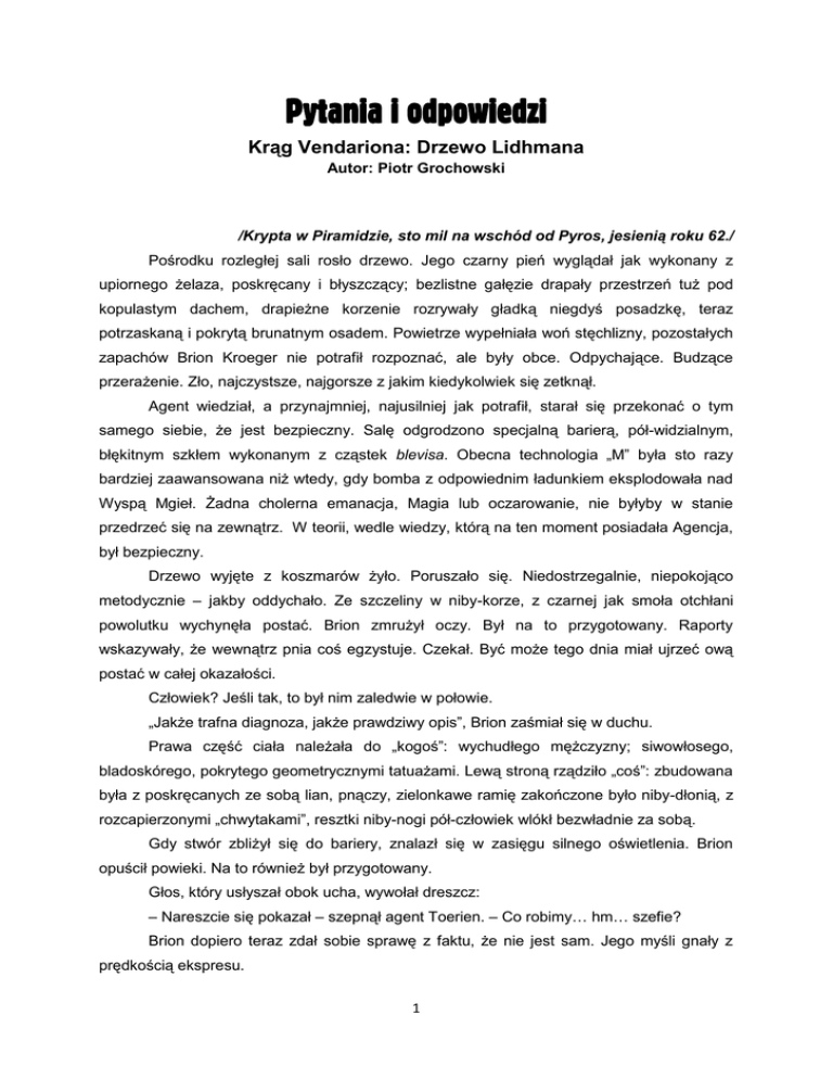 Pytania i odpowiedzi Krąg Vendariona: Drzewo Lidhmana Autor: Piotr Grochowski /Krypta w Piramidzie, sto mil na wschód od Pyros, jesienią roku 62./ Pośrodku rozległej sali rosło drzewo. Jego czarny pień wyglądał jak wykonany z upiornego żelaza, poskręcany i błyszczący; bezlistne gałęzie drapały przestrzeń tuż pod kopulastym dachem, drapieżne korzenie rozrywały gładką niegdyś posadzkę, teraz potrzaskaną i pokrytą brunatnym osadem. Powietrze wypełniała woń stęchlizny, pozostałych zapachów Brion Kroeger nie potrafił rozpoznać, ale były obce. Odpychające. Budzące przerażenie. Zło, najczystsze, najgorsze z jakim kiedykolwiek się zetknął. Agent wiedział, a przynajmniej, najusilniej jak potrafił, starał się przekonać o tym samego siebie, że jest bezpieczny. Salę odgrodzono specjalną barierą, pół-widzialnym, błękitnym szkłem wykonanym z cząstek blevisa. Obecna technologia „M” była sto razy bardziej zaawansowana niż wtedy, gdy bomba z odpowiednim ładunkiem eksplodowała nad Wyspą Mgieł. Żadna cholerna emanacja, Magia lub oczarowanie, nie byłyby w stanie przedrzeć się na zewnątrz. W teorii, wedle wiedzy, którą na ten moment posiadała Agencja, był bezpieczny. Drzewo wyjęte z koszmarów żyło. Poruszało się. Niedostrzegalnie, niepokojąco metodycznie – jakby oddychało. Ze szczeliny w niby-korze, z czarnej jak smoła otchłani powolutku wychynęła postać. Brion zmrużył oczy. Był na to przygotowany. Raporty wskazywały, że wewnątrz pnia coś egzystuje. Czekał. Być może tego dnia miał ujrzeć ową postać w całej okazałości. Człowiek? Jeśli tak, to był nim zaledwie w połowie. „Jakże trafna diagnoza, jakże prawdziwy opis”, Brion zaśmiał się w duchu. Prawa część ciała należała do „kogoś”: wychudłego mężczyzny; siwowłosego, bladoskórego, pokrytego geometrycznymi tatuażami. Lewą stroną rządziło „coś”: zbudowana była z poskręcanych ze sobą lian, pnączy, zielonkawe ramię zakończone było niby-dłonią, z rozcapierzonymi „chwytakami”, resztki niby-nogi pół-człowiek wlókł bezwładnie za sobą. Gdy stwór zbliżył się do bariery, znalazł się w zasięgu silnego oświetlenia. Brion opuścił powieki. Na to również był przygotowany. Głos, który usłyszał obok ucha, wywołał dreszcz: – Nareszcie się pokazał – szepnął agent Toerien. – Co robimy… hm… szefie? Brion dopiero teraz zdał sobie sprawę z faktu, że nie jest sam. Jego myśli gnały z prędkością ekspresu. 1 – Posłuchajcie mnie, Toerien, bardzo uważnie. Wszyscy obserwatorzy i nasłuchujący, każdy sporządzający w tym momencie jakikolwiek raport, mają zniknąć. Do zewnętrznej strefy. Sprzęt nasłuchowy ma być wyłączony. W Krypcie zostaję sam… Toerien wciągnął powietrze, ale nie zdecydował się odezwać. Zapewne wyraz twarzy Briona musiał był odpowiednio wymowny. – Wy także, agencie. Toerien zawahał się. Szeroko otworzył oczy i zanim odszedł odezwał się, wskazując głową w stronę drzewa: – Tak jest, szefie. Tyle, że w Krypcie nie będzie pan sam… Brion Kroeger milczał. *** /Miejsce starożytnego kultu Lumitów, wiosną roku 62./ Max Lidhman starał się zebrać myśli, opierając się plecami o chropowatą, porośnięta bluszczem ścianę. W prawej dłoni ściskał rękojeść rewolweru, w lewej bezużyteczną latarkę. Właśnie dotarło do niego, co stało się przed momentem. Stłukł szklaną końcówkę o czaszkę jednego ze swoich. Ale czy określenie „swoi” nadal pasowało do oszalałych agentów? Jakież licho siedziało w tych murach? Lumici, przez wieki drążący korytarze, wykonali pod górą prawdziwe podziemne miasto. Ale, zapewne, sami w nim nie zamieszkali. Przeznaczone było zmarłym, o czym świadczyły komnaty grobowe, ale i jako miejsce kultu. I ten przypadkowy wybuch, „podmuch” Losu, a może prędzej „wyziew” Otchłani, ukazał zewnętrznemu światu ów skarb. Pieprzone kompanie górnicze Underhillów i ich żądza zdobywania skarbów. „Doigrali się”, zawyrokował w duchu Lidhman. „Pytanie: czemu akurat ja mam się w tym teraz babrać?”. Jego najlepsi ludzie, zbierani przez miesiące, niektórzy latami, teraz stali się wrogami. Coś zdołało ich opętać, wtłoczyć im w oczy nienawiść, w żyły truciznę, w umysły morderczy plan. Przekleństwo musiało znajdować się w powietrzu, przecież każdy miał rękawiczki, zachowali wszelkie środki ostrożności. „Dlaczego więc, ja żyję, myślę, jestem sobą?”. Odetchnął. „To nie powietrze”. Wtedy pojawili się, na końcu korytarza, wyleźli zza rogu. Wysoki Hughes, przysadzisty Alan Crahms i niepozorny Berezowsky, na którego w centrali wołali „księgowy”. Hughes kucnął, opierając się na pająkowatych rękach, podparł się kolanami i zaczął dziwacznie wykręcać szyję, łapiąc powietrze, jak jakiś upiorny ogar. Pozostali dwaj wyciągnęli ręce w kierunku Lidhmana, po czym ruszyli, potykając się i obijając o ściany. 2 Max nie czekał, zerwał się do biegu, coś próbowało szarpnąć go za kostkę, ale nie śmiał spojrzeć w dół. Pociemniało mu przed oczami, mrugnął i wpadł do następnej części korytarza. Słyszał pościg, jego dawni towarzysze jęczeli i sapali… Przebiegając przez zdobiony portal,otarł się o ścianę i poczuł dotyk – pnącza, jakiś rodzaj roślin, poruszały się i próbowały go opleść. Wyrwał się, poślizgnął i trzasnął czołem w mur po drugiej stronie korytarza. Kolejny raz stracił wizję. Naprzemiennie jaśniało i ciemniało mu przed oczyma. Czuł dziwaczny smak w ustach, gryzło go w nosie… „Powietrze, to jednak jest w powietrzu”. Gdy uniósł powieki zobaczył salę – potężną, kopulastą przestrzeń. Pośrodku tkwiło drzewo. *** /Krypta w Piramidzie, jesienią roku 62./ Rozpoznał go od razu. To, co pozostało w nim ludzkiego, grymas na połowie zniekształ