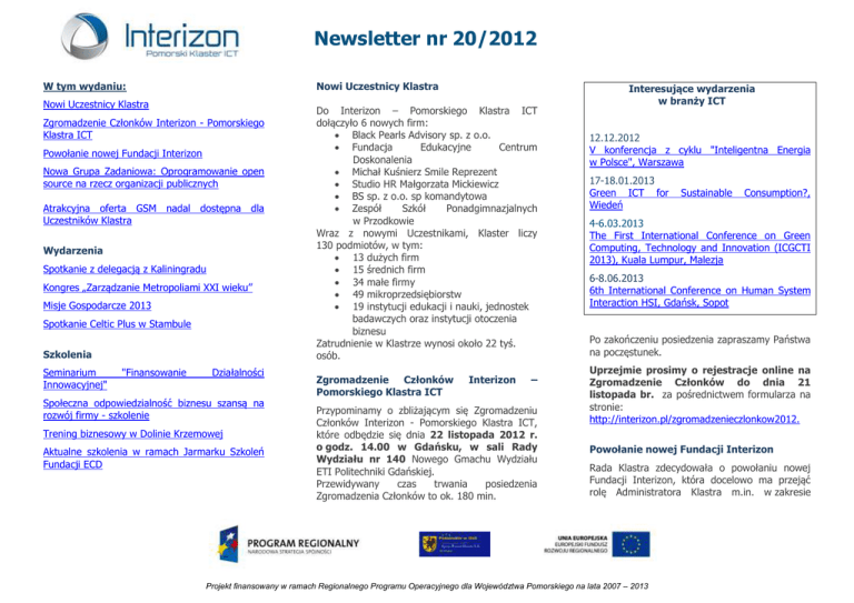 Newsletter nr 20/2012 W tym wydaniu: Nowi Uczestnicy Klastra Nowi Uczestnicy Klastra Zgromadzenie Członków Interizon - Pomorskiego Klastra ICT Powołanie nowej Fundacji Interizon Nowa Grupa Zadaniowa: Oprogramowanie open source na rzecz organizacji publicznych Atrakcyjna oferta GSM nadal dostępna dla Uczestników Klastra Wydarzenia Spotkanie z delegacją z Kaliningradu Kongres „Zarządzanie Metropoliami XXI wieku” Misje Gospodarcze 2013 Spotkanie Celtic Plus w Stambule Szkolenia Seminarium Innowacyjnej" "Finansowanie Działalności Społeczna odpowiedzialność biznesu szansą na rozwój firmy - szkolenie Trening biznesowy w Dolinie Krzemowej Aktualne szkolenia w ramach Jarmarku Szkoleń Fundacji ECD Do Interizon – Pomorskiego Klastra ICT dołączyło 6 nowych firm: Black Pearls Advisory sp. z o.o. Fundacja Edukacyjne Centrum Doskonalenia Michał Kuśnierz Smile Reprezent Studio HR Małgorzata Mickiewicz BS sp. z o.o. sp komandytowa Zespół Szkół Ponadgimnazjalnych w Przodkowie Wraz z nowymi Uczestnikami, Klaster liczy 130 podmiotów, w tym: 13 dużych firm 15 średnich firm 34 małe firmy 49 mikroprzedsiębiorstw 19 instytucji edukacji i nauki, jednostek badawczych oraz instytucji otoczenia biznesu Zatrudnienie w Klastrze wynosi około 22 tyś. osób. Zgromadzenie Członków Pomorskiego Klastra ICT Interizon – Przypominamy o zbliżającym się Zgromadzeniu Członków Interizon - Pomorskiego Klastra ICT, które odbędzie się dnia 22 listopada 2012 r. o godz. 14.00 w Gdańsku, w sali Rady Wydziału nr 140 Nowego Gmachu Wydziału ETI Politechniki Gdańskiej. Przewidywany czas trwania posiedzenia Zgromadzenia Członków to ok. 180 min. Interesujące wydarzenia w branży ICT 12.12.2012 V konferencja z cyklu "Inteligentna Energia w Polsce", Warszawa 17-18.01.2013 Green ICT for Wiedeń Sustainable Consumption?, 4-6.03.2013 The First International Conference on Green Computing, Technology and Innovation (ICGCTI 2013), Kuala Lumpur, Malezja 6-8.06.2013 6th International Conference on Human System Interaction HSI, Gdańsk, Sopot Po zakończeniu posiedzenia zapraszamy Państwa na poczęstunek. Uprzejmie prosimy o rejestracje online na Zgromadzenie Członków do dnia 21 listopada br. za pośrednictwem formularza na stronie: http://interizon.pl/zgromadzenieczlonkow2012. Powołanie nowej Fundacji Interizon Rada Klastra zdecydowała o powołaniu nowej Fundacji Interizon, która docelowo ma przejąć rolę Administratora Klastra m.in. w zakresie Projekt finansowany w ramach Regionalnego Programu Operacyjnego dla Województwa Pomorskiego na lata 2007 – 2013 Newsletter nr 20/2012 aktywnego animowania działań Uczestników Klastra. Fundacja będzie w całości kontrolowana przez Uczestników Klastra (poprzez Radę Klastra). Szczegóły dotyczące celów i zasad funkcjonowania nowej Fundacji Interizon zostaną przedstawione na najbliższym Posiedzeniu Zgromadzenia Członków Pomorskiego Klastra ICT w dniu 22.11.2012r. Nowa Grupa Zadaniowa: Oprogramowanie open source na rzecz organizacji publicznych W poniedziałek, 19 listopada, odbyło się pierwsze spotkanie nowej grupy zadaniowej o nazwie „Oprogramowanie open source na rzecz organizacji publicznych”. Podczas spotkania wybrano lidera grupy, którym został Pan Łukasz Budnik z firmy Kainos Software Poland sp. z o.o. Nowy Lider przedstawił m.in. koncepcję imprez, tzw. hackaton-ów, oraz plany związane z ich organizacją w Trójmieście. Kolejne spotkanie Grupy planowane jest 3 grudnia br. Więcej Atrakcyjna oferta GSM nadal dostępna dla Uczestników Klastra Przypominamy, że podmioty Klastra Interizon mogą korzystać ze specjalnej oferty Polskiej Telefonii Komórkowej - Centertel sp. z o.o. Uczestników Klastra, którzy jeszcze nie skorzystali z tej oferty, zachęcamy do zapoznania się z jej warunkami. Więcej Spotkanie z delegacją z Kaliningradu Misje Gospodarcze 2013 W dniu 30 listopada br. Interizon – Pomorski Klaster ICT będzie gościć delegację z Kaliningradu. Do Trójmiasta przyjedzie ok. 20 osób, przedstawiciele biznesu, uczelni wyższych i dziennikarze. W ramach wizyty planowane są m.in. prezentacje Klastra i firm należących do Klastra, prezentacja Wydziału ETI PG i zwiedzanie jego laboratoriów, oraz przedstawienie strony rosyjskiej i networking Prosimy o zgłaszanie chęci uczestnictwa w spotkaniu w formie mailowej na adres [email protected] do 27 listopada br. Polsko – Szwedzka Izba Gospodarcza zaprasza firmy z branży teleinformatycznej do udziału w wyjeździe na Targi ICT Innovations Expo, które odbędą się w Göteborg w dniach 22-23 stycznia 2013 r. Więcej o targach w Geteborgu Kongres „Zarządzanie Metropoliami XXI wieku” W dniach 26-27 listopada br. w ramach projektu Miasto Plus w Gdańsku odbędzie się Kongres „Zarządzanie Metropoliami XXI wieku”. Kongres poświęcony jest problematyce związanej z procesami zarządzania w miastach metropolitalnych i jednostkach samorząduterytorialnego zrzeszonych funkcjonalnie w obrębie obszarów metropolitalnych tych miast. W ramach wydarzenia odbędzie się kilkadziesiąt paneli tematycznych, podczas których wspólnie z decydentami miast metropolii polskich i innych ważnych ośrodków aglomeracyjnych będzie można się zastanowić nad tematyką nowoczesnego funkcjonowania miasta, modeli zarządzania miastem i innowacyjności. Wiecej Ponadto, Wydział Promocji Handlu i Inwestycji planuje w 2013r. organizację misji gospodarczej do Chin, do jednego z dwóch ośrodków high tech m.in. prowincji Jiangsu, która jest jedna z najbardziej zaawansowanych technologicznie części ChRL (odnawialne źródła energii i ICT). Spotkanie Celtic Plus w Stambule Uprzejmie informujemy, że 6 grudnia 2012r. odbędzie się w Stambule (Turcja) Celtic Plus Proposers’ Day. Na spotkaniu obecni będą przedstawiciele przemysłu i sektora MŚP z Turcji i innych zainteresowanych krajów, którzy spotkają się, aby przedyskutować możliwości potencjalnej współpra