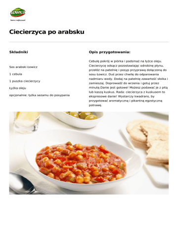 Ciecierzyca po arabsku Składniki Opis przygotowania: Cebulę pokrój w piórka i podsmaż na łyżce oleju. Sos arabski Łowicz 1 cebula 1 puszka ciecierzycy Łyżka oleju opcjonalnie: łyżka sezamu do posypania Ciecierzycę odsącz pozostawiając odrobinę płynu, przełóż na patelnię i posyp przyprawą dołączoną do sosu Łowicz. Duś przez chwilę do odparowania nadmiaru wody. Dodaj na patelnię zawartość słoika i zamieszaj. Doprowadź do wrzenia i gotuj przez minutę.Danie jest gotowe! Możesz podawać je z pitą lub kaszą kuskus. Rada: ciecierzyca z kuskusem to ekspresowe danie! Wystarczy kwadrans, by przygotować aromatyczną i pikantną egzotyczną potrawę. Powered by TCPDF (www.tcpdf.org)