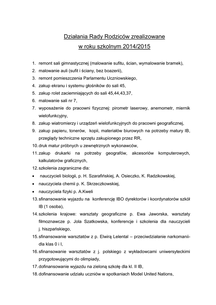 Działania Rady Rodziców zrealizowane w roku szkolnym 2014/2015 1. remont sali gimnastycznej (malowanie sufitu, ścian, wymalowanie bramek), 2. malowanie auli (sufit i ściany, bez boazerii), 3. remont pomieszczenia Parlamentu Uczniowskiego, 4. zakup ekranu i systemu głośników do sali 45, 5. zakup rolet zaciemniających do sali 45,44,43,37, 6. malowanie sali nr 7, 7. wyposażenie do pracowni fizycznej: pirometr laserowy, anemometr, miernik wielofunkcyjny, 8. zakup wiatromierzy i urządzeń wielofunkcyjnych do pracowni geograficznej, 9. zakup papieru, tonerów, kopii, materiałów biurowych na potrzeby matury IB, przeglądy techniczne sprzętu zakupionego przez RR, 10. druk matur próbnych u zewnętrznych wykonawców, 11. zakup drukarki na potrzeby geografów, akcesoriów komputerowych, kalkulatorów graficznych, 12. szkolenia zagraniczne dla: nauczycieli biologii, p. H. Szarafińskiej, A. Osieczko, K. Radzikowskiej, nauczyciela chemii p. K. Skrzeczkowskiej, nauczyciela fizyki p. A.Kweli 13. sfinansowanie wyjazdu na konferencję IBO dyrektorów i koordynatorów szkół IB (1 osoba), 14. szkolenia krajowe: warsztaty geograficzne p. Ewa Jaworska, warsztaty filmoznawcze p. Jola Szatkowska, konferencje i szkolenia dla nauczycieli j. hiszpańskiego, 15. sfinansowanie warsztatów z p. Elwirą Lelental – przeciwdziałanie narkomaniidla klas 0 i I, 16. sfinansowanie warsztatów z j. polskiego z wykładowcami uniwersyteckimi przygotowującymi do olimpiady, 17. dofinansowanie wyjazdu na zieloną szkołę dla kl. II IB, 18. dofinansowanie udziału uczniów w spotkaniach Model United Nations, 19. książki do biblioteki szkolnej: fizyka, chemia, biologia, niemiecki, angielski, chemia, j. hiszpański, opłacenie prenumeraty czasopism hiszpańskojęzycznych, historycznych, lektury, beletrystyka 20. opłacenie dostępu on-line do materiałów dydaktycznych dla nauczycieli psychologii, 21. opłacenie licencji dla uczniów klas IB do oprogramowani ManageBac (CAS) – praca on-line uczniów i nauczycieli, 22. zakup odczynników chemicznych i wyposażenia pracowni chemicznej – ekowalizka, 23. opłacenie zajęć laboratoryjnych z biologii (fotosynteza), warsztatów z genetyki, 24. opłacenie corocznego spotkania z konsultantem i doradcą dla uczniów planujących studia w Wielkiej Brytanii, 25. nagroda Primus Inter Pares, 26. Westerplatte – obchody rocznicy (kwiaty, przejazd), składki członkowskie dla szkół im. Obrońców Westerplatte, 27. finansowanie działalności Klubu Myśli Politycznej – poczęstunek w czasie spotkań z zaproszonymi gośćmi, gadżety, kwiaty itp., banery reklamowe, 28. sfinansowanie materiałów na Otrzęsiny klas I, 29. sfinansowanie działań Parlamentu Uczniowskiego, 30. sfinansowanie organizacji polonistycznego konkursu Żywego Słowa (nagrody, kwiaty), 31. dofinansowanie projektu – Diagnozy potrzeb uczniów klasy III D – pedagog szkolny, 32. obchody Dnia Niepodległości (nagrody dla uczniów), 33. dofinansowanie wyjść uczniów do kina na seanse filmowe, 34. dofinansowanie warsztatów artystycznych organizowanych w szkole przez uczniów, 35. dofinansowanie zajęć w ramach „Sprzątania świata”, 36. dofinansowanie konkursu „Mapolandii”, 37. dofinansowanie konkursu międzyszkolnego „Z polską polityka na Ty”, 38. dofinansowanie Dnia Hiszpańskiego – nagrody, poczęstunek, 39. dofinansowanie Nocy Matematycznej – nagrody dla uczestników, warsztaty, wykłady, poczęstunek, 40. nagrody w szkolnym konkursie Poezji Miłosnej, 41. współfinansowanie regionalnego Konkursu Wiedzy o Wlk. Brytanii oraz In Pursuit of Proficiency, 42. dofinansowanie konkursu TOPBOT – nagrody, materiały, 43. dofinansowanie projektu Topolówka dzieciom, 44. sfinansowanie Dnia Otwartego Topolówki (dekoracje, poczęstunek, gadżety, drobne nagrody) 45. sfinansowanie zajęć dla uczniów w ramach „Ferii z matematyką” w cyklu Rok Matematyki na Pomorzu, 46. dofinansowanie wyjazdu klasy O H do Hiszpanii, 47. dofinansowanie wyjazdu uczniów do Whitgift w UK, 48. dofinansowanie Group4Project w Szwecji, 49. dofinansowanie wymiany polsko-niemieckiej, 50. sfinansowanie udziału uczniów w konferencjach i konkursach z przedsiębiorczości i ekonomii, 51. dofinansowanie festynu z okazji Dnia Dziecka dla okolicznych szkół podstawowych, 52. sfinansowanie zajęć CAS dla uczniów klasy preIB, 53. sfinansowanie materiałów reklamowych III LO – banery, koszulki, kubki, pendrivy, kalendarzyki, 54. Kółka dla uczniów: j. rosyjski - olimpiada, nauka geografia - olimpiada międzynarodowa, matura ekonomia matematyka preIB, III H, matura, olimpiada, konkursy, j. polski matura ,olimpiada, j. angielski – warsztaty twórczego pisania, biologia matura, historia - olimpiada, matura, koło filmowe, j. niemiecki olimpiada, sport: siłownia, koszykówka, siatkówka, pływalnia, fitness, piłka nożna, 55. nagrody dla uczniów na zakończenie roku szkolnego dla wszystkich klas, 56. dofinansowanie wyjazdu na konferencję w Moskwie dla Michała Piłata – najlepszego maturzysty, 57. zakup podstawowych leków do gabinetu lekarskiego, 58. zapomogi losowe,