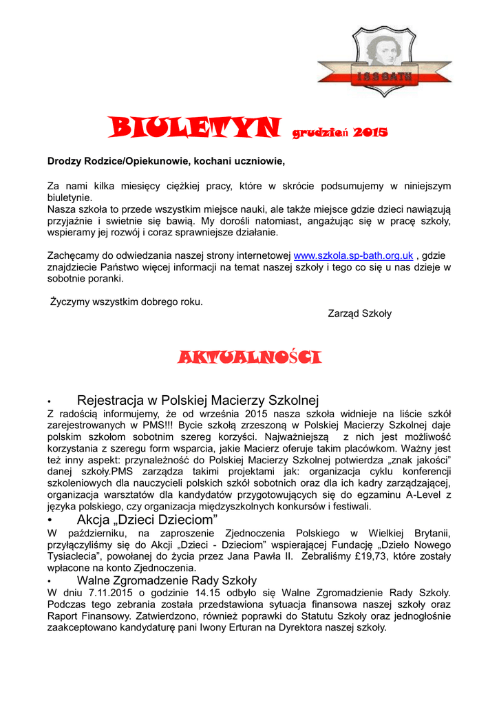 BIULETYN grudzień 2015 Drodzy Rodzice/Opiekunowie, kochani uczniowie, Za nami kilka miesięcy ciężkiej pracy, które w skrócie podsumujemy w niniejszym biuletynie. Nasza szkoła to przede wszystkim miejsce nauki, ale także miejsce gdzie dzieci nawiązują przyjaźnie i swietnie się bawią. My dorośli natomiast, angażując się w pracę szkoły, wspieramy jej rozwój i coraz sprawniejsze działanie. Zachęcamy do odwiedzania naszej strony internetowej www.szkola.sp-bath.org.uk , gdzie znajdziecie Państwo więcej informacji na temat naszej szkoły i tego co się u nas dzieje w sobotnie poranki. Życzymy wszystkim dobrego roku. Zarząd Szkoły AKTUALNOŚCI • Rejestracja w Polskiej Macierzy Szkolnej Z radością informujemy, że od września 2015 nasza szkoła widnieje na liście szkół zarejestrowanych w PMS!!! Bycie szkołą zrzeszoną w Polskiej Macierzy Szkolnej daje polskim szkołom sobotnim szereg korzyści. Najważniejszą z nich jest możliwość korzystania z szeregu form wsparcia, jakie Macierz oferuje takim placówkom. Ważny jest też inny aspekt: przynależność do Polskiej Macierzy Szkolnej potwierdza „znak jakości” danej szkoły.PMS zarządza takimi projektami jak: organizacja cyklu konferencji szkoleniowych dla nauczycieli polskich szkół sobotnich oraz dla ich kadry zarządzającej, organizacja warsztatów dla kandydatów przygotowujących się do egzaminu A-Level z języka polskiego, czy organizacja międzyszkolnych konkursów i festiwali. • Akcja „Dzieci Dzieciom” W październiku, na zaproszenie Zjednoczenia Polskiego w Wielkiej Brytanii, przyłączyliśmy się do Akcji „Dzieci - Dzieciom” wspierającej Fundację „Dzieło Nowego Tysiaclecia”, powołanej do życia przez Jana Pawła II. Zebraliśmy £19,73, które zostały wpłacone na konto Zjednoczenia. • Walne Zgromadzenie Rady Szkoły W dniu 7.11.2015 o godzinie 14.15 odbyło się Walne Zgromadzienie Rady Szkoły. Podczas tego zebrania została przedstawiona sytuacja finansowa naszej szkoły oraz Raport Finansowy. Zatwierdzono, również poprawki do Statutu Szkoły oraz jednogłośnie zaakceptowano kandydaturę pani Iwony Erturan na Dyrektora naszej szkoły. • Wizyta przedstawicielki Polskiej Macierzy Szkolnej Dnia 7 listopada 2015 naszą szkołę odwiedziła pani Marzena Kłonowska-Hatzaras z Polskiej Macierzy Szkolnej w Londynie. Pani Marzena sprawdziła dokumentacje szkoły, rozmawiała z nauczycielami, a także przeprowadziła hospitację lekcji. Wizyta ta była bardzo miłym doświadczeniem i otrzymaliśmy pozytywny komentarz ze strony PMS. „Szkoła jest placówką nową, budującą rosnące zaufanie środowiska lokalnego do szkoły i pozytywną jej ocenę w oczach polskich rodziców. Progres dzieci w zakresie językowym i rozwój dzieci z niepełnosprawnością, są najbardziej satysfakcjonującym dla kadry osiagnięciem młodej szkoły..... Szkoła posiada wszystkie niezbędne procedury i zapewnia bezpieczeństwo dzieci w czasie zajęć...... Nauczyciele majądo dyspozycji tablice interaktywne i je wykorzystują, - co stanowi duży atut w uatrakcyjnianiu zajęć lekcyjnych i angażowaniu uczniów w lekcje.... Miałam ogromną przyjemność zapoznać się z działalnością szkoły oraz poznać osoby wkładające wiele wysiłku i zaangażowania w jej rozwój.” • Sprzedaż artykułów świątecznych Do końca naszego semestru szkolnego, będziemy prowadzić sprzedaż kartek świątecznych, wykonanych przez uczniów naszej szkoły. Nasi wolontariusze są w kościele świętego Jana Ewangelisty w Bath od niedzieli 8.11.2015 w każdą niedzielę po porannejangielskiej mszy świetej oraz po polskiej mszy świętej. Sprzedaż bedziemy także prowadzić w soboty po zajęciach szkolnych. Zapraszamy do odwiedzania naszych stolików, a chętnych wolontariuszy zachęcamy do pomocy, w prowadzeniu tego dzieła. • Jasełka i wizyta Mikołaja Serdecznie zapraszamy na tradycyjne już w naszej szkole spotkanie przedświąteczne. Jasełka odbęda się w dniu 12.12.2015 o godzinie 13.00, po przedstawieniu odwiedzi nas święty Mikołaj. Planujemy, także świąteczny poczęstunek. Rodziców chętnych do przygotowania potraw na świąteczny poczęstunek prosimy o zapisywanie się na listę dostępną w holu szkoły. Zapraszamy również rodzeństwo naszych uczniów na spotkanie z Mikołajem, cena paczki £5 (dla dzieci nie uczęszczających do szkoły). Zapisy i wpłaty u pani Sylwii Buchan. • Opłata za II semestr W II semestrze przypada 10 sobót, opłata powinna zostać uregulowana do 12.12.2015. Za jedną sobotę: £6 jedno dziecko, £9 dwoje dzieci, natomiast £1 za każde następne dziecko; • Ankieta dotycząca dostępu do świadczeń socjalnych. Pragniemy serdecznie zaprosić wszytkich do wzięcia udziału w badaniu, którego celem jest przeprowadzenie diagnozy koordynacji systemów zabezpieczenia społecznego w Europie, w ramach projektu Mobile Welfare in a Transnational Europe: An Analysis of Portability Regimes of Social Security Rights (TRANSWELL) realizowanego przez Departament Socjologii i Polityki Społecznej na Uniewersytecie w Bath i współfinansowanego przez Economic and Social Research Council w ramach programu NORFACE Research Programme on Migration. Badanie składa się z ankiety poświęconej problemom jakie immigranci napotykają podczas starania się o świadczenia socjalne w UK [takie jak: urlop macierzyński/tacierzyński/wychowawczy/chorobowy; emerytury; zasiłek dla bezrobotnych oraz zasiłek na dziecko/dzieci]. Ankieta w języku polskim składa się z pytań zamkniętych i jej przeprowadzenie nie powinno trwać dłużej niż 15 minut. Wasz udział w ankiecie pomoże w uzyskaniu rzetelnych i wyczerpujących informacji dotyczących problemów jakie immigranci napotykają podczas starania się o świadczenia socjalne w UK. Udział w ankiecie jest anonimowy! Jeśli ktoś z Państwa jest zainteresowany udziałem w badaniu, prosimy o kontakt telefoniczny 078907353