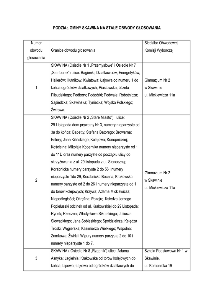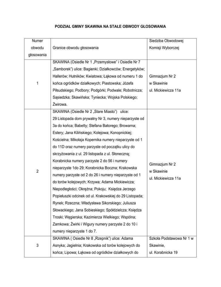 PODZIAŁ GMINY SKAWINA NA STAŁE OBWODY GŁOSOWANIA Numer obwodu Siedziba Obwodowej Granice obwodu głosowania Komisji Wyborczej głosowania SKAWINA (Osiedle Nr 1 „Przemysłowe” i Osiedle Nr 7 „Samborek”) ulice: Bagienki; Działkowców; Energetyków; 1 Hallerów; Hutników; Kwiatowa; Łąkowa od numeru 1 do Gimnazjum Nr 2 końca ogródków działkowych; Piastowska; Józefa w Skawinie Piłsudskiego; Podbory; Podgórki; Podwale; Robotnicza; ul. Mickiewicza 11a Sąsiedzka; Skawińska; Tyniecka; Wojska Polskiego; Żwirowa. SKAWINA (Osiedle Nr 2 „Stare Miasto”) ulice: 29 Listopada dom prywatny Nr 3, numery nieparzyste od 3a do końca; Babetty; Stefana Batorego; Browarna; Estery; Jana Kilińskiego; Kolejowa; Konopnickiej; Kościelna; Mikołaja Kopernika numery nieparzyste od 1 do 11D oraz numery parzyste od początku ulicy do skrzyżowania z ul. 29 listopada z ul. Słoneczną; Korabnicka numery parzyste 2 do 56 i numery 2 nieparzyste 1do 29; Korabnicka Boczna; Krakowska numery parzyste od 2 do 26 i numery nieparzyste od 1 do torów kolejowych; Krzywa; Adama Mickiewicza; Gimnazjum Nr 2 w Skawinie ul. Mickiewicza 11a Niepodległości; Okrężna; Pokoju; Księdza Jerzego Popiełuszki odcinek od ul. Krakowskiej do 29 Listopada; Rynek; Rzeczna; Władysława Sikorskiego; Juliusza Słowackiego; Jana Sobieskiego; Spółdzielcza; Księdza Troski; Węgierska; Kazimierza Wielkiego; Wspólna; Zamkowa; Żwirki i Wigury numery parzyste 2 do 10 i numery nieparzyste 1 do 7. 3 SKAWINA ( Osiedle Nr 8 „Rzepnik”) ulice: Adama Szkoła Podstawowa Nr 1 w Asnyka; Jagielnia; Krakowska od torów kolejowych do Skawinie, końca; Lipowa; Łąkowa od ogródków działkowych do ul. Korabnicka 19 końca; Łanowa odcinek na północ od torów kolejowych; Nad Wodą; Feliksa Pachla; Pisary; Polna; Przemysłowa; O.Adama F. Studzińskiego; Szwedzka; Torowa; Torowa Boczna; Za Górą; Zielona; mjr Jana Żychonia; SKAWINA ( 2. Osiedle Nr 3 „Kościuszki”) ulice: Ignacego 4 Daszyńskiego; Jarosława Dąbrowskiego; Aleksandra Zespół Szkół Głowackiego; Tadeusza Kościuszki; Józefa Ignacego Ogólnokształcących Kraszewskiego; Plac doktora Jerzego Polańskiego; w Skawinie, Józefa Poniatowskiego; Kazimierza Pułaskiego; Stefana ul. Żwirki i Wigury 17 Żeromskiego. SKAWINA ( 1.Osiedle Nr 3 „Kościuszki” i Osiedle Nr 9 „Radziszowskie”) ulice: 29 listopada bloki numer 1 i 3, numery parzyste od 2 do 24; Armii Krajowej; Dębca; Falbówki; Konstantego Ildefonsa Gałczyńskiego; 5 Gościnna; Groble; Konstytucji 3 Maja; Marka Kublińskiego; Księdza Jerzego Popiełuszki numery parzyste od 2 do końca; Nad Potokiem; Feliksa Pukły; Szkoła Podstawowa Nr 2 w Skawinie, ul. Żwirki i Wigury 17 Radziszowska; Różana; Spacerowa; Spokojna; Szkolna; Willowa; Wyrwisko; Żwirki i Wigury od numeru 12 do końca. SKAWINA ( 1.Osiedle Nr 4 „Ogrody”) ulice: Jaśminowa; Kopernika numery 2 do 2A, 2D do 2F, ul. Kopernika 6 numery parzyste od 4 do 30A; ul. Kopernika 13 – 17; ul. Wesoła cała, ul. Słoneczna nr 2,4,6; ul. 29 Listopada od numeru 26 do końca numery parzyste. Zespół Szkół TechnicznoEkonomicznych w Skawinie, ul. Kopernika 13 SKAWINA ( 2.Osiedle Nr 4 „Ogrody”) ul. Słoneczna nr 1, Zespół Szkół Techniczno7 1A-D, nr 3-9 nieparzyste; ul. Ogrody domy prywatne, ul. Ekonomicznych Ogrody 7, 9, 11,17 w Skawinie, ul. Kopernika 13 8 SKAWINA ( 3.Osiedle Nr 4 „Ogrody”) ul. Ogrody 8, 10, Spółdzielnia Mieszkaniowa 16, 18, 24, 26, 26A, ul. Marii Skłodowskiej-Curie cała; ul. Lokatorsko - Własnościowa Słoneczna 8, 10, 12, 16 w Skawinie, ul. Ogrody 31 SKAWINA ( 4.Osiedle Nr 4 „Ogrody”) ul. Słoneczna domy prywatne od nr 15A do końca; ul. Słoneczna 11, 9 11A, 13,14, 15, 17, 18, 19, 27, 29, 31, 33, 35; ul. Księdza Jerzego Popiełuszki nr nieparzyste 7 – 13, ul. Księdza Jerzego Popiełuszki od nr 15 do końca Centrum Wspierania Rodziny, Urząd Miasta i Gminy w Skawinie, ul. Popiełuszki 17 Gimnazjum Nr 1 10 11 SKAWINA ( 1. Osiedle Nr 6 „Bukowskie”) ulice: w Skawinie, Bukowska od 1 do 11B; Jana Pawła II. ul. Witosa 4 SKAWINA ( 2.Osiedle Nr 6 „Bukowskie”) ulice: Gimnazjum Nr 1 Altanowa, Bukowska od 12 do końca; Monte Casino; Na w Skawinie, Stoku; Witosa ul. Witosa 4 SKAWINA (Osiedle Nr 5 „Korabniki) ulice: Brzozowa; Batalionów Chłopskich; Cicha; Graniczna; Jodłowa; Kalinowa; Kasztanowa; Kopernika numery nieparzyste od 17A do końca; Kopernika numery parzyste od 32 do 12 Szkoła Podstawowa Nr 4 w końca; Korabnicka numery nieparzyste od 29A do końca; Skawinie, Korabnicka numery parzyste od 56A do końca; Leśna; ul. Wyspiańskiego 5 Łanowa odcinek na południe od torów kolejowych; Pasternik; Sadowa; Wiklinowa; Stanisława Wyspańskiego. Sołectwa: JURCZYCE, RADZISZÓW ulice: Brzegi, Chorzyny, Drożdżownik, Górki, Górna, Jarzębinowa, 13 Jaśminowa, Kolejowa, Kolorowa, Leniecka, Lipowa, Łanowa, Podwale, Prosta, Przemysłowa, Różana, Słoneczna, Torowa, Wąska, Wąwozowa, Zacisze, Zespół Szkół Publicznych w Radziszowie, ul. Szkolna 7 Zawodzie, Zimnowiec, 14 15 16 17 Sołectwo: WOLA RADZISZOWSKA Dom Ludowy w Woli Radziszowskiej Sołectwa: KRZĘCIN, GRABIE, POLANKA HALLERA Szkoła Podstawowa w Krzęcinie Sołectwo : JAŚKOWICE, Dom Ludowy w Jaśkowicach Sołectwa : FACIMIECH, WIELKIE DROGI Zespół Placówek Edukacyjno-OpiekuńczoWychowawczych w Wielkich Drogach 18 19 20 Sołectwo: ZELCZYNA Szkoła Podstawowa w Zelczynie Sołectwo: POZOWICE Szkoła Podstawowa w Pozowicach Sołectwa : RZOZÓW, GOŁUCHOWICE Szkoła Podstawowa w Rzozowie Sołectwo : BOREK SZLACHECKI 21 Zespół Placówek Oświatowych w Borku Szlacheckim, Sołectwo: KOPANKA, 22 Zespół Placówek Oświatowych w Kopance Sołectwo: RADZISZÓW ulice: posesje bez ulicy, Cicha, Jagodowa, Jagodowa Boczna, Jana Pawła II, Kamienna, 23 Kęciki, Kościelna, Krótka, Kwiatowa, Leśna, Łąkowa, Zespół Szkół Publicznych Modrzewiowa, Nad Pasieką, Nad Potokiem, Podlesie, w Radziszowie, Pod Górą, Polna, Rynek, Siedliska, S