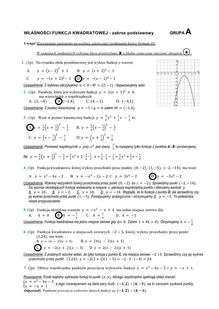 WŁASNOŚCI FUNKCJI KWADRATOWEJ - zakres podstawowy GRUPA A Uwaga! Rozwiązania zapisujemy na osobnej, estetycznej i podpisanej kartce formatu A5. W zadaniach zamkniętych wybraną literę przekreślamy X a błędne oznaczenie otaczamy okręgiem X . 1. (1p) Na rysunku obok przedstawiony jest wykres funkcji o wzorze: = A. –2 = − C. + 2 + 1 = B. –1 = − D. <0i Uzasadnienie: Z wykresu odczytujemy: + 2 − 2 − 1 –1 = 2, −1 i dopasowujemy wzór. 2. (1p) Parabola, która jest wykresem funkcji = 2 ma wierzchołek o współrzędnych: A. 1, −4 B. −1,4 C. 4, −1 = −1 i Uzasadnienie: Z postaci kanonicznej = = C. = + − − − B. = D. = Uzasadnienie: Ponieważ współczynnik = Np. + − = − + przy = −1,4 . + − to: − + jest równy +2∙ ∙ ∙ + 4, D. −4,1 = 4 zatem 3. (1p) Wzór w postaci kanonicznej funkcji A. + 1 + ∙ − to rozwijamy tylko funkcje z punktów A i B i porównujemy. = + − . 4. (1p) Funkcja kwadratowa, której wykres przechodzi przez punkty 0, −2 , 1, −5 , −2, −14 , ma wzór: A. = −4 −2 = − B. − 2 − 2 C. = 3 −2 D. = −3 −2 Uzasadnienie: Wykresy wszystkich funkcji przechodzą przez punkt 0, −2 bo ! = −2 . Sprawdźmy punkt −2, −14 . Do wzorów określających funkcje wstawiamy w miejsce pierwszą współrzędną punktu i obliczamy wartość . A. = 10, B. = −2, C. = 10, D. = −14. Wygląda, że to funkcja z punktu D, ale sprawdźmy czy jej wykres przechodzi przez punkt 1, −5 . Postępujemy analogicznie i otrzymujemy D. = −5. To potwierdza nasze przypuszczenie. 5. (1p) Funkcja określona wzorem A. " = 0 B. " = − = − − C. " = + " ma jedno miejsce zerowe dla: D. " = −1 Uzasadnienie: Funkcja kwadratowa ma jedno miejsce zerowe gdy ∆= 0. Zatem 1 + 4" = 0 . Otrzymujemy " = − . 6. (1p) Funkcja kwadratowa o miejscach zerowych −2 i 5, której wykres przechodzi przez punkt 1,24 , ma wzór: A. = − 2 + 5 B. = 24 − 2 + 5 C. = −2 + 2 − 5 D. = 2 − 2 + 5 Uzasadnienie: Z podanych wzorów widać, że tylko funkcja z punktu C. ma miejsca zerowe −2 i 5. Sprawdźmy czy jej wykres przechodzi przez punkt 1,24 : = −2 1 + 2 1 − 5 = −2 ∙ 3 ∙ −4 = 24. 7. (2p) Oblicz współrzędne punktów przecięcia wykresów funkcji = −4 −3 i = − + 1. Rozwiązanie: Punkt wspólny wykresów funkcji to punkt , , którego współrzędne spełniają układ równań: = − 4 − 3+ * , a jego rozwiązaniem są dwie pary liczb: −,, - i ., −/ , są to zarazem szukane punkty. = − + 1 Odpowiedź: Punktami przecięcia wykresów danych funkcji są: −,, - i ., −/ . 8. (4p) Dana jest funkcja kwadratowa = − − . a) Oblicz współrzędne wierzchołka paraboli, która jest wykresem tej funkcji. b) Oblicz miejsca zerowe tej funkcji. c) Narysuj wykres tej funkcji. d) Zbadaj monotoniczność tej funkcji. Rozwiązanie: a) Ze wzorów na =− ∆= 1 + 3 = 4, 4 0 1 i = , =− ∆ 1 obliczamy współrzędne wierzchołka: = −1 zatem 2 = 6 , - , −, , b) √∆= 2, = =− ∨ = = , c) d) Znamy współrzędne wierzchołka paraboli oraz współczynnik a możemy określić monotoniczność funkcji. Funkcja jest malejąca dla ∈ −∞, + 9 oraz funkcja jest rosnąca dla ∈ : + , +−∞ . Odpowiedź: a) Wierzchołkiem jest punkt 2 = , , , −, , / b) Pierwiastkami równania są ; = − ∨ ; = c) Wykres obok d) Funkcja jest malejąca dla ∈ −∞, + 9 oraz funkcja jest rosnąca dla ∈ : + , +−∞ . 9. (3p) Rozwiąż nierówności: a) −2 > 32 b) − = + = ≤0 c) −2 + 10 − 8 > 0 Rozwiązanie: a) −2 > 32 lewa strona nierówności jest niedodatnia a prawa ujemna, zatem ; ∈ ∅, b) − = + = ≤ 0, przekształcamy − = odczytujemy Odpowiedź: a) ; ∈ ∅, − 3 ≤ 0 i z wykresu ∈ −∞,+ +09 ∪ :3+, ++∞ c) −2 + 10 − 8 > 0 znajdujemy miejsca zerowe i z wykresu odczytujemy ∈ 1+, +4 b) ; ∈ −∞+, +B9 ∪ :/+, ++∞ = 1∨ =4 c) ; ∈ ,+, +. 10. (5p) Drut o długości 100 !C chcemy wygiąć w prostokątną ramkę. Oblicz, jakie wymiary powinna mieć ta ramka, aby prostokąt, który ogranicza, miał największe pole. Rozwiązanie: a) 2 + 2 = 100 oraz D = ∙ . Wyznaczamy y i wstawiamy do wzoru funkcji na pole: D dla = = ∙ 50 − czyli D = − + 50 . Funkcja ta przyjmuje wartość największą =E gdzie = − = 25 i wtedy = 25 F = 25. ∙ 4 Odpowiedź: Prostokąt ten jest kwadratem o boku ; = -G HI.