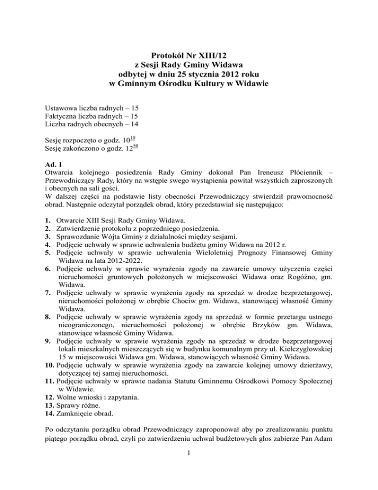 Protokół Nr XIII/12 z Sesji Rady Gminy Widawa odbytej w dniu 25 stycznia 2012 roku w Gminnym Ośrodku Kultury w Widawie Ustawowa liczba radnych – 15 Faktyczna liczba radnych – 15 Liczba radnych obecnych – 14 Sesję rozpoczęto o godz. 1010 Sesję zakończono o godz. 1250 Ad. 1 Otwarcia kolejnego posiedzenia Rady Gminy dokonał Pan Ireneusz Płóciennik – Przewodniczący Rady, który na wstępie swego wystąpienia powitał wszystkich zaproszonych i obecnych na sali gości. W dalszej części na podstawie listy obecności Przewodniczący stwierdził prawomocność obrad. Następnie odczytał porządek obrad, który przedstawiał się następująco: 1. 2. 3. 4. 5. Otwarcie XIII Sesji Rady Gminy Widawa. Zatwierdzenie protokołu z poprzedniego posiedzenia. Sprawozdanie Wójta Gminy z działalności między sesjami. Podjęcie uchwały w sprawie uchwalenia budżetu gminy Widawa na 2012 r. Podjęcie uchwały w sprawie uchwalenia Wieloletniej Prognozy Finansowej Gminy Widawa na lata 2012-2022. 6. Podjęcie uchwały w sprawie wyrażenia zgody na zawarcie umowy użyczenia części nieruchomości gruntowych położonych w miejscowości Widawa oraz Rogóźno, gm. Widawa. 7. Podjęcie uchwały w sprawie wyrażenia zgody na sprzedaż w drodze bezprzetargowej, nieruchomości położonej w obrębie Chociw gm. Widawa, stanowiącej własność Gminy Widawa. 8. Podjęcie uchwały w sprawie wyrażenia zgody na sprzedaż w formie przetargu ustnego nieograniczonego, nieruchomości położonej w obrębie Brzyków gm. Widawa, stanowiące własność Gminy Widawa. 9. Podjęcie uchwały w sprawie wyrażenia zgody na sprzedaż w drodze bezprzetargowej lokali mieszkalnych mieszczących się w budynku komunalnym przy ul. Kiełczygłowskiej 15 w miejscowości Widawa gm. Widawa, stanowiących własność Gminy Widawa. 10. Podjęcie uchwały w sprawie wyrażenia zgody na zawarcie kolejnej umowy dzierżawy, dotyczącej tej samej nieruchomości. 11. Podjęcie uchwały w sprawie nadania Statutu Gminnemu Ośrodkowi Pomocy Społecznej w Widawie. 12. Wolne wnioski i zapytania. 13. Sprawy różne. 14. Zamknięcie obrad. Po odczytaniu porządku obrad Przewodniczący zaproponował aby po zrealizowaniu punktu piątego porządku obrad, czyli po zatwierdzeniu uchwał budżetowych głos zabierze Pan Adam 1 Kucper – radny powiatowy, który przybliży zebranym obecną sytuację w powiecie. Następnie ze względu, iż żaden z radnych nie wniósł sprzeciwu do zgłoszonej propozycji zarządził głosowanie nad przyjęciem porządku obrad. W wyniku głosowania za przyjęciem porządku obrad głosowało 14 radnych. Głosów przeciwnych i wstrzymujących się nie było. Porządek obrad XIII sesji został przyjęty jednogłośnie. Ad. 2 W kolejnym punkcie przystąpiono do zatwierdzania protokółu z poprzedniego posiedzenia Rady Gminy. Przewodniczący poinformował, iż protokół liczy pięć stron. Następnie zapytał, czy zachodzi konieczność jego odczytania. Z uwagi, iż żaden z radnych nie zgłosił potrzeby odczytywania protokołu oraz nie wysunięto żadnych uwag, Przewodniczący Rady zarządził głosowanie nad jego przyjęciem, po czym stwierdził, iż protokół został przyjęty jednogłośnie przez 14 radnych obecnych na sali obrad w chwili głosowania. Ad. 3 W następnym punkcie obrad Przewodniczący udzielił głosu Panu Jerzemu Sylwestrowi Woźniakowi – Wójtowi Gminy, który przedstawił sprawozdanie z działań prowadzonych w okresie międzysesyjnym. Przedstawione przez Pana Wójta sprawozdanie stanowi załącznik do niniejszego protokołu. Ad. 4 Do omówienia projektu uchwały w sprawie uchwalenia budżetu gminy poproszona została Pani Dorota Słowińska – Skarbnik Gminy, która zaznaczyła, iż niniejszy akt omówiony został na poszczególnych komisjach rady gminy. Następnie dodała, iż po uzyskaniu opinii z Regionalnej Izby Obrachunkowej, która również została przedłożona radym, zaszła konieczność wprowadzenia pewnych zmian, które następnie Pani Skarbnik szczegółowo omówiła. W toku dalszej wypowiedzi przedstawiła uzasadnienie do kolejnego projektu uchwały zaznaczając, iż z uwagi na, to że kwota dochodów a także finansowanie oraz suma zadłużenia uległy zmianie należy również zmodyfikować pewne zapisy w Wieloletniej Prognozie Finansowej. Następnie wymieniła oraz dość precyzyjnie omówiła kwestie, jakie ulegną zmianie we wspomnianym akcie. Następnie ze względu na brak jakichkolwiek zapytań do przedstawionego projektu uchwały Przewodniczący Rady odczytał jego treść i zarządził głosowanie. W wyniku przeprowadzonego głosowania Uchwała Nr XIII/97/12 w sprawie uchwalenia budżetu gminy Widawa na 2012 r. została przyjęta 14 głosami „za”, czyli jednogłośnie przez wszystkich radnych. Ad. 5 Z uwagi, iż kolejny projekt uchwały został omówiony w poprzednim punkcie i nie zgłoszono do niego żadnych uwag Przewodniczący odczytał jego treść i zarządził głosowanie. W wyniku przeprowadzonego głosowania Uchwała Nr XIII/98/12 w sprawie zmiany uchwalenia Wieloletniej Prognozy Finansowej Gminy Widawa na lata 2012-2022 została przyjęta 14 głosami „za”, czyli jednogłośnie przez wszystkich radnych. Przed przystąpieniem do kolejnego punktu porządku obrad głos zabrał Pan Adam Kucper – radny powiatowy, który odniósł się do obecnej sytuacji w powiecie a w szczególności 2 krytycznego uwarunkowania w dziedzinie oświaty jak również bardzo trudnym położeniu finansowym szpitala. Przedstawił zebranym przyczyny, które przeważyły o konieczności wprowadzenia pewnych działań mających na celu uzdrowienie trudnej sytuacji w oświacie. W toku dalszego wystąpienia przedstawił obecną sytuację finansową szpitala powiatowego, a następnie poinformował, jakie kroki zostały podjęte w kierunku jego dalszych losów, które umożliwiłyby jego funkcjonowanie na nieco innych zasadach niż do tej pory. Po wystąpieniu Pana Kucpra Przewodnic