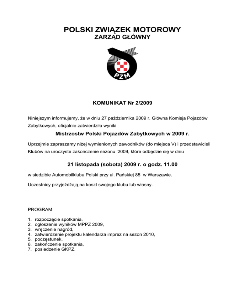 POLSKI ZWIĄZEK MOTOROWY ZARZĄD GŁÓWNY KOMUNIKAT Nr 2/2009 Niniejszym informujemy, że w dniu 27 października 2009 r. Główna Komisja Pojazdów Zabytkowych, oficjalnie zatwierdziła wyniki Mistrzostw Polski Pojazdów Zabytkowych w 2009 r. Uprzejmie zapraszamy niżej wymienionych zawodników (do miejsca V) i przedstawicieli Klubów na uroczyste zakończenie sezonu ’2009, które odbędzie się w dniu 21 listopada (sobota) 2009 r. o godz. 11.00 w siedzibie Automobilklubu Polski przy ul. Pańskiej 85 w Warszawie. Uczestnicy przyjeżdżają na koszt swojego klubu lub własny. PROGRAM 1. 2. 3. 4. 5. 6. 7. rozpoczęcie spotkania, ogłoszenie wyników MPPZ 2009, wręczenie nagród, zatwierdzenie projektu kalendarza imprez na sezon 2010, poczęstunek, zakończenie spotkania, posiedzenie GKPZ. 2 Mistrzostwa Polski Pojazdów Zabytkowych w 2009 r. Samochody W 2009 roku, w trzech kategoriach: pre 1945, post 1945, i post 1965 łącznie sklasyfikowano 165 zawodników z 16 klubów zrzeszonych w PZM. 1. Klasyfikacja indywidualna w kategorii samochodów pre 1945r. Miejsce Zawodnik Automobilklub Samochód Mistrz I Wicemistrz II Wicemistrz 4 5 6 7 8 9 10 11 12 13 14 15 16 17 18 19 20 Brenneke Piotr Popowicz Stanisław Kramarczyk Maria Ratyński Michał Kamieński Maciej Bartnicki Apolinary Milczek Jan Gierat Stanisław Gargul Ryszard Kamiński Piotr Dziewa Ryszard Kuczma Wiesław Roszkiewicz Andrzej Dzienio Romuald Stoch Marian Szczepanow Stanisław Gomuła Paweł Tabisz Stanisław Peszak Janusz Piotr Roszkiewicz A. Częstochowski Aero 30 Sport A. Stalowa Wola Fiat 508 A. Krakowski Polski Fiat 508 A. Lubelski Wanderer W24 A. Polski Fiat 500 Topolino A. Polski BMW 3/15 Dixi A. Lubelski BMW 315/1 A. Krakowski Java Minor I Europejska Asocjacja Automob.Packard 733 A. Śląski Willis Knight A. Lubelski Oldsmobile F32 Legnickie Tow. Automobilowe Hansa Lloyd Expres A. Wielkopolski Overland 91 A. Polski Aero 30 Tatrzański Klub Motorowy Mercedes 170V Roadster A. Krakowski Mercedes 170V A. Wielkopolski Peugeot 402 A. Opolski Essex A. Śląski Mercedes 170V Cabrio A A. Wielkopolski Overland 91 Rok prod. 1934 1937 1935 1938 1937 1929 1934 1937 1930 1929 1932 1935 1923 1937 1938 1938 1937 1924 1938 1923 2. Klasyfikacja indywidualna w kategorii samochodów post 1945r. Miejsce Zawodnik Automobilklub Samochód Rok prod. Mistrz Elsner Krzysztof A. Łódzki Porsche 356 1963 I Wicemistrz Skrzyczewski Mirosław A. Śląski Triumph Spitfire Mk I 1964 II Wicemistrz Chromik Grzegorz A. Beskidzki Fiat Millecento 1958 4 Morgas Wiesław A. Kielecki Triumph TR 3A 1959 5 Kamieński Paweł A. Polski Citroen BL 11 1954 6 Słyk Mariusz A. Beskidzki MG B 1963 7 Krzysztofik Ryszard A. Świętokrzyski MG TD M12 1952 8 Oklesiński Mirosław A. Lubelski Mercedes 1958 9 Ziółkowski Grzegorz A. Wielkopolski DKW Auto Union 1000 Roadster 1962 10 Żuk Marcin A. Śląski Ford Taunus 17M P3 1961 11 Jaraczewski Piotr A. Wielkopolski VW Wariant 1500S 1964 12 Szumski Michał A. Polski Ford Consul 315 1962 13 Kutnik Zygmunt A. Częstochowski BMW 501 1955 14 Dziewa Ryszard A. Lubelski Chevrolet Impala 1960 15 Zawadzki Jakub A. Rzeszowski Fiat 600 Multipla 1956 3 16 Roszkowski Oskar A. Ziemi Płockiej Mercedes W 111 230 S 1965 17 Andrzej Nocen A. Stargardzki Mercedes W 121 1959 18 Kosidło Dariusz A. Lubelski Opel Kapitan 215 1954 19 Jerzy Hodyra A. Ostrowski Skoda Spartak 440 1958 20 Hołubowicz Witold A. Wielkopolski Volvo Amazon 1962 3. Klasyfikacja indywidualna w kategorii samochodów post 1965r. Miejsce Zawodnik Automobilklub Samochód Rok prod. Mistrz Stryczak Marcin A. Częstochowski Porsche 911T Carrera 1976 I Wicemistrz Suwalski Marek A. Krakowski Mercedes 250 SL 1967 II Wicemistrz Piskorek Mirosław A. Lubelski Mercedes 350 SLC 1972 4 Małecki Piotr A. Wielkopolski Renault R10 1966 5 Hackenberg Marek A. Lubelski Porsche 928 1977 6 Hołojuch Grażyna A. Krakowski Fiat 124 Spider 1970 7 Keck Stanisław A. Wielkopolski Mercedes W 107 SL 1972 8 Korpas Gregor A. Śląski VW1303 LS Cabrio 1978 9 Dziewa Michał A. Lubelski Porsche 911 1973 10 Sziska Andrzej A. Łódzki Porsche 911 S Targa 1976 11 Soboń Grzegorz A. Lubelski Fiat 124 Spider 1975 12 Sentyrz Jan A. Krakowski Mercedes W 113 1967 13 Palacz Roman A. Wielkopolski Citroen DS 20 1971 14 Filas Karol A. Krakowski Skoda 1000MB 1968 15 Robak Robert A. Wielkopolski Mercedes W 112 300SE 1966 16 Kobylański Paweł A. Wielkopolski Fiat 500 L 1970 17 Płaczek Władysław A. Krakowski Fiat X1/9 1978 18 Ciużyński Wojciech A. Polski Austin Healey Mk III 1967 19 Piskorek Wojciech A. Lubelski Citroen DS ID20 1971 20 Feliks Zygfryd A. Śląski Hillman IMP 1968 Motocykle W 2009 roku sklasyfikowano łącznie 31 zawodników z 9 klubów zrzeszonych w PZM. 4. Klasyfikacja indywidualna w kategorii motocykli pre 1945 r. Miejsce Zawodnik Automobilklub Motocykl Rok prod. Mistrz Czekała Paweł KMW Rotor Zundapp KS750 1943 Wicemistrz Zinkiewicz Adam KMW Rotor Victoria KR 35 SN/WH 1942 3 Grochowski Arkadiusz A. Lubelski DKW BM200 1933 4 Pękala Magdalena KMW Rotor Victoria KR20 ZBL 1936 5 Awramiuk Andrzej Moto-Retro Białystok BMW R-12 1938 6 Lipiszko Wojciech Moto-Retro Białystok NSU OSL 250 1942 4 7 Gucwa Józef A. Podkarpacki DKW NZ 350 1944 8 Matysiak Mirosław A. Łódzki BMW R-2 1933 5. Klasyfikacja indywidualna w kategorii motocykli post 1945 r. Miejsce Zawodnik Automobilklub Motocykl Rok prod. Mistrz Stasik Andrzej KMW Rotor Jawa Perak 1949 I Wicemistrz Wiśniewski Piotr KMW Rotor Yamaha RD-350 1973 II Wicemistrz Lubarski Arkadiusz A. Ziemi Płockiej SHL M11 1965 4 Grzęda Piotr A. Śląski Junak M10 1963 5 Woziński Mariusz KMW Rotor MZ ES 250 1959 6 Lipka Adam KMW Rotor BMW R90 1974 7 Sobolewski Tomasz A. Łódzki SHL M06T 1961 8 Siemiński Michał A. Kielecki AWO 425 1956 9 Maciejewski Mariusz A. Śląski Jawa 353 1958 10 Borowicz Robert A. Wielkopolski WSK 125 1971 11 Jakubczak Tomasz KMW Rotor Horex Regina 01 1951 12 Maciejewski Mariusz A. Śląski Jawa 353 1958 13 Lubarski Arkadiusz A. Ziemi P