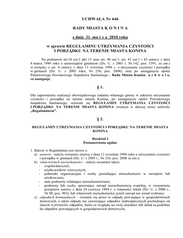 UCHWAŁA Nr 646 RADY MIASTA K O N I N A z dnia 31 ma r c a 2010 roku w sprawie REGULAMINU UTRZYMANIA CZYSTOŚCI I PORZĄDKU NA TERENIE MIASTA KONINA Na podstawie art.18 ust.2 pkt 15 oraz art. 40 ust.1, art. 41 ust.1 i 42 ustawy z dnia 8 marca 1990 roku o samorządzie gminnym (Dz. U. z 2001 r. Nr 142, poz. 1591, ze zm.) w związku z art. 4 ustawy z dnia 13 września 1996 r. o utrzymaniu czystości i porządku w gminach (Dz. U. z 2005 roku, Nr 236, poz. 2008), oraz po zasięgnięciu opinii Państwowego Powiatowego Inspektora Sanitarnego - Rada Miasta Konina u c h w a l a, co następuje: § 1. Dla zapewnienia realizacji obowiązkowego zadania własnego gminy w zakresie utrzymania czystości i porządku na terenie miasta Konina, po zasięgnięciu opinii Powiatowego Inspektora Sanitarnego, uchwala się REGULAMIN UTRZYMANIA CZYSTOŚCI I PORZĄDKU NA TERENIE MIASTA KONINA zwanym w dalszej treści uchwały „Regulaminem”. § 2. REGULAMIN UTRZYMANIA CZYSTOŚCI I PORZĄDKU NA TERENIE MIASTA KONINA Rozdział I Postanowienia ogólne 1. Ilekroć w Regulaminie jest mowa o: a) ustawie - naleŜy rozumieć ustawę z dnia 13 września 1996 roku o utrzymaniu czystości i porządku w gminach (Dz. U. z 2005 r., Nr 236, poz. 2008 ze zm.); b) właścicielach nieruchomości – naleŜy rozumieć takŜe: - współwłaścicieli, - uŜytkowników wieczystych, - jednostki organizacyjne i osoby posiadające nieruchomości w zarządzie lub uŜytkowaniu, - inne podmioty władające nieruchomościami, - podmioty lub osoby sprawujące zarząd nieruchomością wspólną, w rozumieniu przepisów ustawy z dnia 24 czerwca 1994 r. o własności lokali (Dz. U. z 2000 r., Nr 80, poz. 903), lub właścicieli nieruchomości, jeŜeli zarząd nie został wybrany; c) odpadach komunalnych – rozumie się przez to odpady powstające w gospodarstwach domowych, a takŜe odpady nie zawierające odpadów niebezpiecznych pochodzące od innych wytwórców odpadów, które ze względu na swój charakter lub skład są podobne do odpadów powstających w gospodarstwach domowych; 2 d) bioodpadach (odpadach ulegających biodegradacji) – rozumie się przez to odpady, które ulegają rozkładowi tlenowemu i beztlenowemu przy udziale mikroorganizmów; e) odpadach zmieszanych – rozumie się odpady komunalne nie gromadzone selektywnie; f) odpadach wielkogabarytowych – rozumie się odpady komunalne, które wskutek swoich rozmiarów lub wagi nie mogą być gromadzone w pojemnikach; g) odpadach niebezpiecznych – rozumie się odpady, których definicje określa ustawa o odpadach; h) zbieraniu odpadów – rozumie się przez to kaŜde działanie, w szczególności umieszczanie w pojemnikach, segregowanie i magazynowanie odpadów, które ma na celu przygotowanie ich do transportu do miejsc odzysku lub unieszkodliwiania; i) poziomach selekcji - naleŜy przez to rozumieć, Ŝe zgodnie z docelowymi zapisami Krajowego Planu Gospodarki Odpadami (KPGO), w kolejnych latach powinny być odbierane odpady selektywnie gromadzone w ilości określonych w KPGO; j) odbieraniu odpadów – rozumie się czynność polegającą na odbieraniu odpadów od właścicieli nieruchomości i przekazywaniu ich na wyznaczone w Regulaminie miejsce unieszkodliwiania, wykonywaną przez prowadzącego działalność na podstawie odrębnej decyzji Prezydenta Miasta Konina w zakresie odbierania odpadów; k) stacjach zlewnych – rozumie się przez to instalacje i urządzenia zlokalizowane przy oczyszczalni ścieków słuŜące do przyjmowania nieczystości ciekłych dowoŜonych pojazdami asenizacyjnymi ze zbiorników bezodpływowych; l) górnych stawkach opłat – naleŜy przez to rozumieć zgodne z treścią art. 6 ust. 2 ustawy górne stawki opłat ponoszonych przez właścicieli nieruchomości za usługi, wykonywane przez przedsiębiorcę posiadającego zezwolenie na prowadzenie działalności w zakresie odbierania odpadów komunalnych od właścicieli nieruchomości lub w zakresie opróŜniania zbiorników bezodpływowych i transportu nieczystości ciekłych; m) zbiornikach bezodpływowych – rozumie się przez to instalacje i urządzenia przeznaczone do gromadzenia nieczystości ciekłych w miejscu ich powstawania; n) zabudowie wielorodzinnej – naleŜy przez to rozumieć zabudowę budynkami wielomieszkaniowymi i wielolokalowymi, o wielu wejściach, liczącymi więcej niŜ dwie kondygnacje; o) zabudowie jednorodzinnej – naleŜy przez to rozumieć budynki wolnostojące lub w zabudowie szeregowej, mieszczące najwyŜej kilka lokali mieszkalnych; p) zwierzętach domowych – naleŜy przez to rozumieć zwierzęta przebywające wraz z człowiekiem w jego domu lub innym odpowiednim pomieszczeniu oraz nie trzymane dla celów hodowlanych. 2. Warunki udzielania zezwoleń na świadczenie usług odbierania odpadów komunalnych, opróŜniania zbiorników bezodpływowych i transportu nieczystości ciekłych określa ustawa O utrzymaniu czystości i porządku w gminie oraz Zarządzenie Prezydenta Miasta Konina określające warunki i wymagania, jakie powinien spełnić przedsiębiorca ubiegający się o takie zezwolenie lub wykonujący wymienione usługi. 3. Regulamin obowiązuje w szczególności: a) właścicieli nieruchomości; b) nadzorujących budowy; c) przedsiębiorców uŜytkujących tereny słuŜące komunikacji publicznej; d) wszystkich posiadaczy terenów, do których tytuł prawny posiada miasto Konin; e) mieszkańców oraz osoby przebywające czasowo na terenie miasta Konina. 4. Regulamin ustala szczegółowe wymagania i warunki utrzymania czystości i porządku na terenie miasta Konina. 3 Rozdział II Zadania miasta 1. 2. 3. 4. 5. Miasto Konin zapewniając na swoim terenie utrzymanie czystości i porządku stworzy niezbędne warunki do: a) utrzymania i eksploatacji instalacji i urządzeń do unieszkodliwiania odpadów komunalnych zmieszanych i selektywnie gromadzonych; b) utrzymania i eksploatacji stacji zlewnych przyjmujących nieczystości ciekłe z nieruchomości