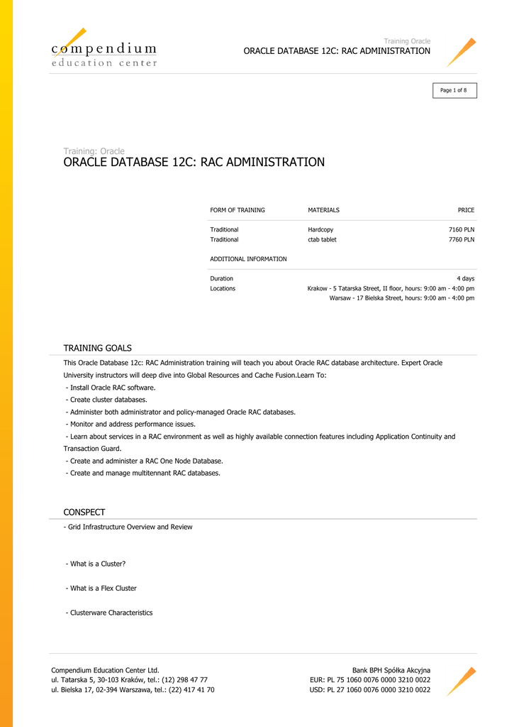 Training Oracle ORACLE DATABASE 12C: RAC ADMINISTRATION Page 1 of 8 Training: Oracle ORACLE DATABASE 12C: RAC ADMINISTRATION FORM OF TRAINING MATERIALS PRICE Traditional Hardcopy 7160 PLN Traditional ctab tablet 7760 PLN ADDITIONAL INFORMATION Duration Locations 4 days Krakow - 5 Tatarska Street, II floor, hours: 9:00 am - 4:00 pm Warsaw - 17 Bielska Street, hours: 9:00 am - 4:00 pm TRAINING GOALS This Oracle Database 12c: RAC Administration training will teach you about Oracle RAC database architecture. Expert Oracle University instructors will deep dive into Global Resources and Cache Fusion.Learn To: - Install Oracle RAC software. - Create cluster databases. - Administer both administrator and policy-managed Oracle RAC databases. - Monitor and address performance issues. - Learn about services in a RAC environment as well as highly available connection features including Application Continuity and Transaction Guard. - Create and administer a RAC One Node Database. - Create and manage multitennant RAC databases. CONSPECT - Grid Infrastructure Overview and Review - What is a Cluster? - What is a Flex Cluster - Clusterware Characteristics Compendium Education Center Ltd. ul. Tatarska 5, 30-103 Kraków, tel.: (12) 298 47 77 ul. Bielska 17, 02-394 Warszawa, tel.: (22) 417 41 70 Bank BPH Spółka Akcyjna EUR: PL 75 1060 0076 0000 3210 0022 USD: PL 27 1060 0076 0000 3210 0022 Training Oracle ORACLE DATABASE 12C: RAC ADMINISTRATION Page 2 of 8 - Oracle Clusterware - Hardware and Software Concepts (High level) - RAC Databases Overview & Architecture - Overview of Oracle RAC - RAC One Node - Cluster-Aware Storage Solutions - Benefits of Using RAC - Scaleup and Speedup - I/O Throughput Balanced - Global Resources - RAC and Flex ASM - Installing and Configuring Oracle RAC - Installing the Oracle Database Software - Installation options - Creating the Cluster Database - Post-installation Tasks - Single Instance to RAC Conversion - Cleaning Up Unsuccessful Installs Compendium Education Center Ltd. ul. Tatarska 5, 30-103 Kraków, tel.: (12) 298 47 77 ul. Bielska 17, 02-394 Warszawa, tel.: (22) 417 41 70 Bank BPH Spółka Akcyjna EUR: PL 75 1060 0076 0000 3210 0022 USD: PL 27 1060 0076 0000 3210 0022 Training Oracle ORACLE DATABASE 12C: RAC ADMINISTRATION Page 3 of 8 - Oracle RAC Administration - Parameters and RAC - SPFILE, Identical and Unique Parameters - Instance Startup, Shutdown and Quiesce - Undo Tablespaces - Use Enterprise Manager Cluster Database Pages - RAC Alerts - RAC Metrics - Session management on RAC instances - RAC Backup and Recovery - Instance Failure And Recovery In RAC - LMON and SMON - Redo Threads and Archive Log Configurations and Admin - Parameter Settings Affecting Parallel Recovery and MTTR - Instance Failure And Recovery In RAC - LMON and SMON - RAC and the Fast Recovery Area - RMAN Configuration - RMAN Admin For RAC: Channels, Instances, Backup Distribution - RMAN Restore And Recovery RAC Considerations Compendium Education Center Ltd. ul. Tatarska 5, 30-103 Kraków, tel.: (12) 298 47 77 ul. Bielska 17, 02-394 Warszawa, tel.: (22) 417 41 70 Bank BPH Spółka Akcyjna EUR: PL 75 1060 0076 0000 3210 0022 USD: PL 27 1060 0076 0000 3210 0022 Training Oracle ORACLE DATABASE 12C: RAC ADMINISTRATION Page 4 of 8 - RAC Global Resource Management and Cache Fusion - Globally Managed Resources and Management - Library Cache Management - Row cache management - Buffer cache fusion - Buffer Cache Management Requirements - Accessing single blocks in RAC - Multi-block read considerations in RAC - Undo and read consistency considerations in RAC - RAC Monitoring and Tuning - OCPU and Wait Time Latencies - Wait Events for RAC - Common RAC Tuning - Session and System Statistics - RAC specific V$ Views - Automatic Database Diagnostic Monitor for RAC - Managing High Availability of Services in a RAC Environment Compendium Education Center Ltd. ul. Tatarska 5, 30-103 Kraków, tel.: (12) 298 47 77 ul. Bielska 17, 02-394 Warszawa, tel.: (22) 417 41 70 Bank BPH Spółka Akcyjna EUR: PL 75 1060 0076 0000 3210 0022 USD: PL 27 1060 0076 0000 3210 0022 Training Oracle ORACLE DATABASE 12C: RAC ADMINISTRATION Page 5 of 8 - Oracle Services - Services for Policy - and Administrator-Managed Databases - Creating Services - Managing Services - Use Services with Client Applications - Services and Connection Load Balancing - Services and Transparent Application Failover - Services and the Resource Manager - Managing High Availability of Connections - Types of Workload Distribution - Client-Side Load Balancing - Server-Side Load Balancing - Runtime Connection Load Balancing and Connection Pools - Fast Application Notification - The Load Balancing Advisory FAN Event - Server-Side Callouts - Configuring the Server-Side ONS - Upgrading and Patching RAC Compendium Education Center Ltd. ul. Tatarska 5, 30-103 Kraków, tel.: (12) 298 47 77 ul. Bielska 17, 02-394 Warszawa, tel.: (22) 417 41 70 Bank BPH Spółka Akcyjna EUR: PL 75 1060 0076 0000 3210 0022 USD: PL 27 1060 0076 0000 3210 0022 Training Oracle ORACLE DATABASE 12C: RAC ADMINISTRATION Page 6 of 8 - Overview of Upgrades and Patching - Release and Patch Set Upgrades - PSU, CPU and Interim Patches - Merge Patches - Performing Out Of Place Database Upgrades - Planning and Preparing for Upgrade - Performing Out of Place Release Install or Upgrade - Post Upgrade Tasks - Application Continuity - What is AC? - What problem does it solve? - Benefits of AC - How AC works - AC Architecture - Side Effects - Restrictions - Application requirements - Quality of Service Management Compendium Education Center Ltd. ul. Tatarska 5, 30-103 Kraków, tel.: (12) 298 47 77 ul. Bielska 17, 02-394 Warszawa, tel.: (22) 417 41 70 Bank BPH Spółka Akcyjna EUR: PL 75 1060 0076 0000 3210 0022 USD: PL 27 1060 0076 0000 3210 0022 Training Oracle ORACLE DATABASE 12C: RAC ADMINISTRATION Page 7 of 8 - QOS Management concepts - Describe the benefits of using QoS Management - QoS Management comp