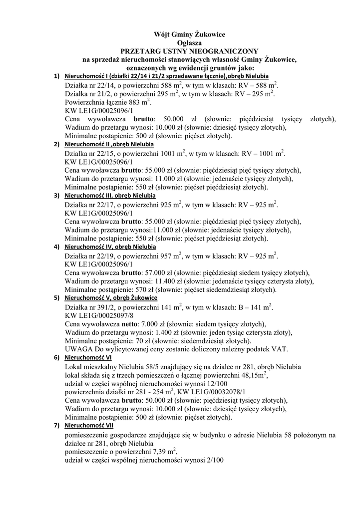 Wójt Gminy Żukowice Ogłasza PRZETARG USTNY NIEOGRANICZONY na sprzedaż nieruchomości stanowiących własność Gminy Żukowice, oznaczonych wg ewidencji gruntów jako: 1) Nieruchomość I (działki 22/14 i 21/2 sprzedawane łącznie),obręb Nielubia Działka nr 22/14, o powierzchni 588 m2, w tym w klasach: RV – 588 m2. Działka nr 21/2, o powierzchni 295 m2, w tym w klasach: RV – 295 m2. Powierzchnia łącznie 883 m2. KW LE1G/00025096/1 Cena wywoławcza brutto: 50.000 zł (słownie: pięćdziesiąt tysięcy Wadium do przetargu wynosi: 10.000 zł (słownie: dziesięć tysięcy złotych), Minimalne postąpienie: 500 zł (słownie: pięćset złotych). złotych), 2) Nieruchomość II ,obręb Nielubia Działka nr 22/15, o powierzchni 1001 m2, w tym w klasach: RV – 1001 m2. KW LE1G/00025096/1 Cena wywoławcza brutto: 55.000 zł (słownie: pięćdziesiąt pięć tysięcy złotych), Wadium do przetargu wynosi: 11.000 zł (słownie: jedenaście tysięcy złotych), Minimalne postąpienie: 550 zł (słownie: pięćset pięćdziesiąt złotych). 3) Nieruchomość III, obręb Nielubia Działka nr 22/17, o powierzchni 925 m2, w tym w klasach: RV – 925 m2. KW LE1G/00025096/1 Cena wywoławcza brutto: 55.000 zł (słownie: pięćdziesiąt pięć tysięcy złotych), Wadium do przetargu wynosi:11.000 zł (słownie: jedenaście tysięcy złotych), Minimalne postąpienie: 550 zł (słownie: pięćset pięćdziesiąt złotych). 4) Nieruchomość IV, obręb Nielubia Działka nr 22/19, o powierzchni 957 m2, w tym w klasach: RV – 925 m2. KW LE1G/00025096/1 Cena wywoławcza brutto: 57.000 zł (słownie: pięćdziesiąt siedem tysięcy złotych), Wadium do przetargu wynosi: 11.400 zł (słownie: jedenaście tysięcy czterysta złoty), Minimalne postąpienie: 570 zł (słownie: pięćset siedemdziesiąt złotych). 5) Nieruchomość V, obręb Żukowice Działka nr 391/2, o powierzchni 141 m2, w tym w klasach: B – 141 m2. KW LE1G/00025097/8 Cena wywoławcza netto: 7.000 zł (słownie: siedem tysięcy złotych), Wadium do przetargu wynosi: 1.400 zł (słownie: jeden tysiąc czterysta złoty), Minimalne postąpienie: 70 zł (słownie: siedemdziesiąt złotych). UWAGA Do wylicytowanej ceny zostanie doliczony należny podatek VAT. 6) Nieruchomość VI Lokal mieszkalny Nielubia 58/5 znajdujący się na działce nr 281, obręb Nielubia lokal składa się z trzech pomieszczeń o łącznej powierzchni 48,15m2, udział w części wspólnej nieruchomości wynosi 12/100 powierzchnia działki nr 281 - 254 m2, KW LE1G/00032078/1 Cena wywoławcza brutto: 50.000 zł (słownie: pięćdziesiąt tysięcy złotych), Wadium do przetargu wynosi: 10.000 zł (słownie: dziesięć tysięcy złotych), Minimalne postąpienie: 500 zł (słownie: pięćset złotych). 7) Nieruchomość VII pomieszczenie gospodarcze znajdujące się w budynku o adresie Nielubia 58 położonym na działce nr 281, obręb Nielubia pomieszczenie o powierzchni 7,39 m2, udział w części wspólnej nieruchomości wynosi 2/100 powierzchnia działki nr 281 - 254 m2, KW LE1G/00032078/1 Cena wywoławcza brutto: 5.000 zł (słownie: siedem tysięcy pięćset czterdzieści cztery złotych), Wadium do przetargu wynosi: 1.000 zł (słownie: jeden tysiąc złotych), Minimalne postąpienie: 50 zł (słownie: pięćdziesiąt złotych). W dniu 29.10.2012 odbył się przetarg dla nieruchomości I,II,III i IV zakoczony wynikiem negatywnym. W dniu 4.01.2013 odbył się przetarg dla nieruchomości I,II,III,IV,V,VI,VII zakończony wynikiem negatywnym. Nieruchomości I,II,III i IV posiadają podstawowe przeznaczenie w M.P.Z.P. jako tereny projektowanej zabudowy mieszkaniowej jednorodzinnej, oznaczone na rysunku planu symbolem „MN”. Nieruchomość V posiada podstawowe przeznaczenie w M.P.Z.P. jako teren zadrzewienia oraz zakrzaczenia terenów po wyburzonych zagrodach, sadach, gruntach rolnych i nieużytkach, oznaczony na rysunku planu jako „RLz” Nieruchomość VI i VII znajduje się na terenie oznaczonym z M.P.Z.P. jako teren przeznaczony dla zabudowy mieszkaniowej jednorodzinnej i zagrodowej oraz dla usług, zarówno występujących łącznie z zabudową mieszkaniową, jak i samodzielnie, oznaczony na rysunku planu jako „MP” UWAGA Nabywca ponosi koszty przygotowania przetargu i sporządzenia aktu notarialnego (tj. sporządzenia operatu szacunkowego, ogłoszeń w prasie, przygotowania niezbędnej dokumentacji, sporządzenia aktu notarialnego oraz wpisów w księgach wieczystych). Nabywca nieruchomości wpłaci ustaloną kwotę wynikającą z poniesionych kosztów na wskazane przez Urząd Gminy konto najpóźniej w dniu przepisu notarialnego. Informacje o wysokości kosztów przygotowania można uzyskać w Urzędzie Gminy Żukowice. Nieruchomości, będące przedmiotem przetargu, są wolne od długów i ciężarów. Przetarg odbędzie się w dniu 25 lutego 2013 r. o godz. 10.00 w sali narad Urzędu Gminy Żukowice. Wadium należy wpłacić na konto Urzędu Gminy Żukowice nr 85 8649 1044 2001 0000 2222 0002, prowadzone przez Bank Spółdzielczy Legnica O/Gaworzyce, Filia Żukowice w terminie do dnia 20 lutego 2013 roku, z odpowiednim wyprzedzeniem tak, aby środki pieniężne znalazły się na rachunku bankowym UG Żukowice w ww. terminie z podaniem nr nieruchomości, której wadium dotyczy. Wadium wpłacone przez uczestnika przetargu, który przetarg wygrał, zostanie zaliczone w poczet ceny nabycia nieruchomości. Pozostałym osobom, wpłacone wadium, zostanie niezwłocznie zwrócone przelewem na konto w terminie nie dłuższym niż 3 dni po odwołaniu, zamknięciu, unieważnieniu przetargu lub zakończeniu przetargu wynikiem negatywnym. Przetarg jest ważny bez względu na liczbę uczestników przetargu, jeżeli przynajmniej jeden uczestnik zaoferował co najmniej jedno minimalne postąpienie powyżej ceny wywoławczej. Warunkiem przystąpienia do przetargu jest: okazanie dowodu wniesienia wadium, w przypadku osób fizycznych okazanie dowodu osobistego, w p