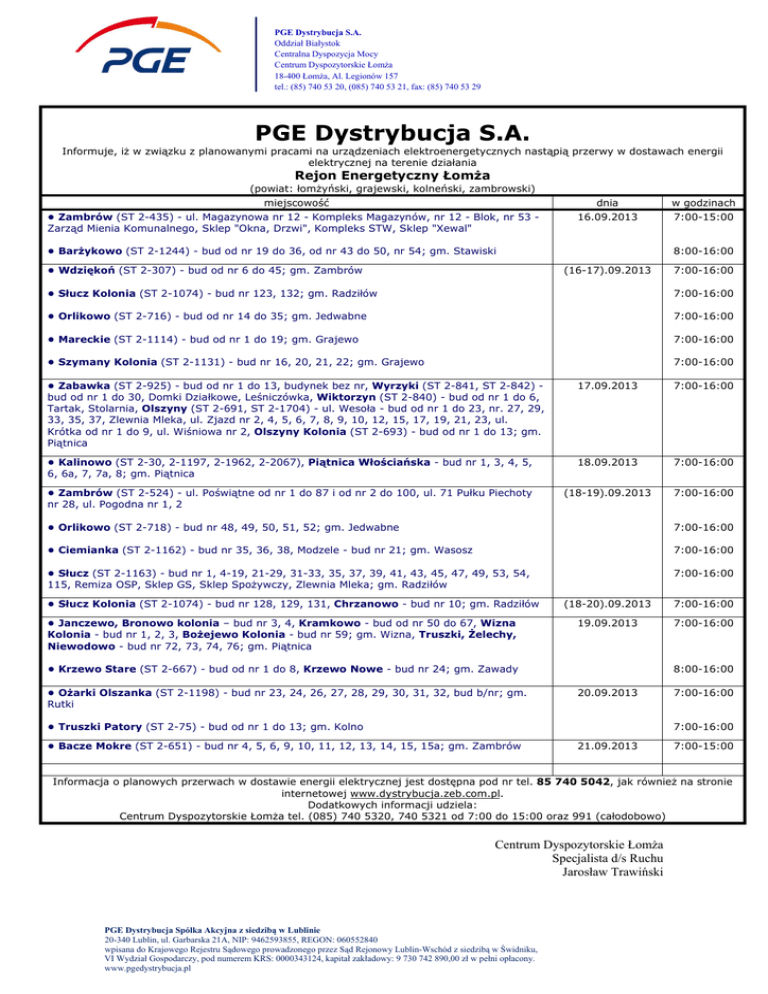 PGE Dystrybucja S.A. Oddział Białystok Centralna Dyspozycja Mocy Centrum Dyspozytorskie Łomża 18-400 Łomża, Al. Legionów 157 tel.: (85) 740 53 20, (085) 740 53 21, fax: (85) 740 53 29 PGE Dystrybucja S.A. Informuje, iż w związku z planowanymi pracami na urządzeniach elektroenergetycznych nastąpią przerwy w dostawach energii elektrycznej na terenie działania Rejon Energetyczny Łomża (powiat: łomżyński, grajewski, kolneński, zambrowski) miejscowość • Zambrów (ST 2-435) - ul. Magazynowa nr 12 - Kompleks Magazynów, nr 12 - Blok, nr 53 Zarząd Mienia Komunalnego, Sklep "Okna, Drzwi", Kompleks STW, Sklep "Xewal" dnia w godzinach 16.09.2013 7:00-15:00 • Barżykowo (ST 2-1244) - bud od nr 19 do 36, od nr 43 do 50, nr 54; gm. Stawiski • Wdziękoń (ST 2-307) - bud od nr 6 do 45; gm. Zambrów 8:00-16:00 (16-17).09.2013 7:00-16:00 • Słucz Kolonia (ST 2-1074) - bud nr 123, 132; gm. Radziłów 7:00-16:00 • Orlikowo (ST 2-716) - bud od nr 14 do 35; gm. Jedwabne 7:00-16:00 • Mareckie (ST 2-1114) - bud od nr 1 do 19; gm. Grajewo 7:00-16:00 • Szymany Kolonia (ST 2-1131) - bud nr 16, 20, 21, 22; gm. Grajewo 7:00-16:00 • Zabawka (ST 2-925) - bud od nr 1 do 13, budynek bez nr, Wyrzyki (ST 2-841, ST 2-842) bud od nr 1 do 30, Domki Działkowe, Leśniczówka, Wiktorzyn (ST 2-840) - bud od nr 1 do 6, Tartak, Stolarnia, Olszyny (ST 2-691, ST 2-1704) - ul. Wesoła - bud od nr 1 do 23, nr. 27, 29, 33, 35, 37, Zlewnia Mleka, ul. Zjazd nr 2, 4, 5, 6, 7, 8, 9, 10, 12, 15, 17, 19, 21, 23, ul. Krótka od nr 1 do 9, ul. Wiśniowa nr 2, Olszyny Kolonia (ST 2-693) - bud od nr 1 do 13; gm. Piątnica 17.09.2013 7:00-16:00 • Kalinowo (ST 2-30, 2-1197, 2-1962, 2-2067), Piątnica Włościańska - bud nr 1, 3, 4, 5, 6, 6a, 7, 7a, 8; gm. Piątnica 18.09.2013 7:00-16:00 • Zambrów (ST 2-524) - ul. Poświątne od nr 1 do 87 i od nr 2 do 100, ul. 71 Pułku Piechoty nr 28, ul. Pogodna nr 1, 2 (18-19).09.2013 7:00-16:00 • Orlikowo (ST 2-718) - bud nr 48, 49, 50, 51, 52; gm. Jedwabne 7:00-16:00 • Ciemianka (ST 2-1162) - bud nr 35, 36, 38, Modzele - bud nr 21; gm. Wasosz 7:00-16:00 • Słucz (ST 2-1163) - bud nr 1, 4-19, 21-29, 31-33, 35, 37, 39, 41, 43, 45, 47, 49, 53, 54, 115, Remiza OSP, Sklep GS, Sklep Spożywczy, Zlewnia Mleka; gm. Radziłów 7:00-16:00 • Słucz Kolonia (ST 2-1074) - bud nr 128, 129, 131, Chrzanowo - bud nr 10; gm. Radziłów • Janczewo, Bronowo kolonia – bud nr 3, 4, Kramkowo - bud od nr 50 do 67, Wizna Kolonia - bud nr 1, 2, 3, Bożejewo Kolonia - bud nr 59; gm. Wizna, Truszki, Żelechy, Niewodowo - bud nr 72, 73, 74, 76; gm. Piątnica (18-20).09.2013 7:00-16:00 19.09.2013 7:00-16:00 • Krzewo Stare (ST 2-667) - bud od nr 1 do 8, Krzewo Nowe - bud nr 24; gm. Zawady • Ożarki Olszanka (ST 2-1198) - bud nr 23, 24, 26, 27, 28, 29, 30, 31, 32, bud b/nr; gm. Rutki 8:00-16:00 20.09.2013 • Truszki Patory (ST 2-75) - bud od nr 1 do 13; gm. Kolno 7:00-16:00 7:00-16:00 • Bacze Mokre (ST 2-651) - bud nr 4, 5, 6, 9, 10, 11, 12, 13, 14, 15, 15a; gm. Zambrów 21.09.2013 7:00-15:00 Informacja o planowych przerwach w dostawie energii elektrycznej jest dostępna pod nr tel. 85 740 5042, jak również na stronie internetowej www.dystrybucja.zeb.com.pl. Dodatkowych informacji udziela: Centrum Dyspozytorskie Łomża tel. (085) 740 5320, 740 5321 od 7:00 do 15:00 oraz 991 (całodobowo) Centrum Dyspozytorskie Łomża Specjalista d/s Ruchu Jarosław Trawiński PGE Dystrybucja Spółka Akcyjna z siedzibą w Lublinie 20-340 Lublin, ul. Garbarska 21A, NIP: 9462593855, REGON: 060552840 wpisana do Krajowego Rejestru Sądowego prowadzonego przez Sąd Rejonowy Lublin-Wschód z siedzibą w Świdniku, VI Wydział Gospodarczy, pod numerem KRS: 0000343124, kapitał zakładowy: 9 730 742 890,00 zł w pełni opłacony. www.pgedystrybucja.pl