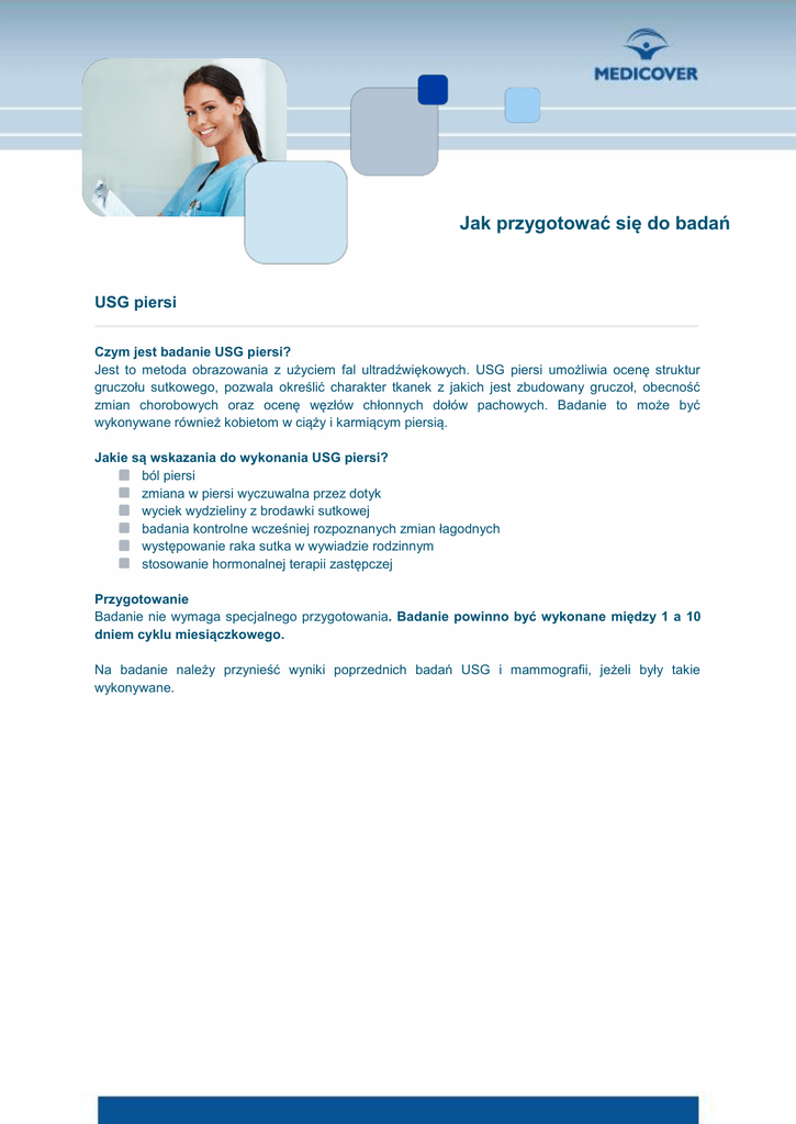Jak przygotować się do badań USG piersi Czym jest badanie USG piersi? Jest to metoda obrazowania z użyciem fal ultradźwiękowych. USG piersi umożliwia ocenę struktur gruczołu sutkowego, pozwala określić charakter tkanek z jakich jest zbudowany gruczoł, obecność zmian chorobowych oraz ocenę węzłów chłonnych dołów pachowych. Badanie to może być wykonywane również kobietom w ciąży i karmiącym piersią. Jakie są wskazania do wykonania USG piersi? ból piersi zmiana w piersi wyczuwalna przez dotyk wyciek wydzieliny z brodawki sutkowej badania kontrolne wcześniej rozpoznanych zmian łagodnych występowanie raka sutka w wywiadzie rodzinnym stosowanie hormonalnej terapii zastępczej Przygotowanie Badanie nie wymaga specjalnego przygotowania. Badanie powinno być wykonane między 1 a 10 dniem cyklu miesiączkowego. Na badanie należy przynieść wyniki poprzednich badań USG i mammografii, jeżeli były takie wykonywane.