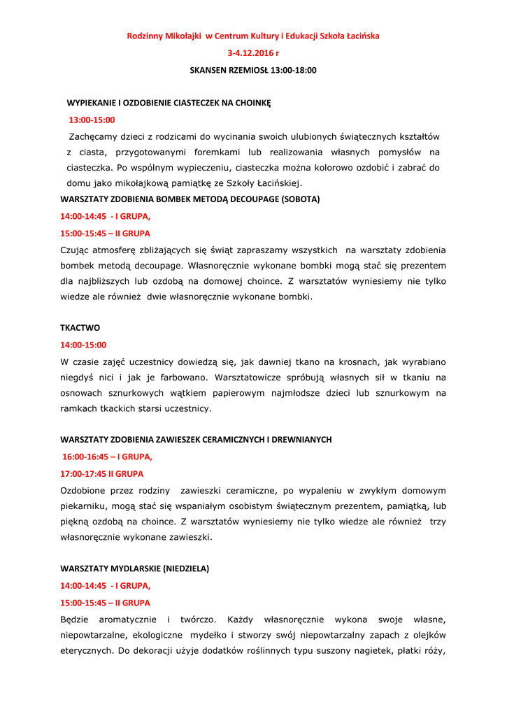 Rodzinny Mikołajki w Centrum Kultury i Edukacji Szkoła Łacińska 3-4.12.2016 r SKANSEN RZEMIOSŁ 13:00-18:00 WYPIEKANIE I OZDOBIENIE CIASTECZEK NA CHOINKĘ 13:00-15:00 Zachęcamy dzieci z rodzicami do wycinania swoich ulubionych świątecznych kształtów z ciasta, przygotowanymi foremkami lub realizowania własnych pomysłów na ciasteczka. Po wspólnym wypieczeniu, ciasteczka można kolorowo ozdobić i zabrać do domu jako mikołajkową pamiątkę ze Szkoły Łacińskiej. WARSZTATY ZDOBIENIA BOMBEK METODĄ DECOUPAGE (SOBOTA) 14:00-14:45 - I GRUPA, 15:00-15:45 – II GRUPA Czując atmosferę zbliżających się świąt zapraszamy wszystkich na warsztaty zdobienia bombek metodą decoupage. Własnoręcznie wykonane bombki mogą stać się prezentem dla najbliższych lub ozdobą na domowej choince. Z warsztatów wyniesiemy nie tylko wiedze ale również dwie własnoręcznie wykonane bombki. TKACTWO 14:00-15:00 W czasie zajęć uczestnicy dowiedzą się, jak dawniej tkano na krosnach, jak wyrabiano niegdyś nici i jak je farbowano. Warsztatowicze spróbują własnych sił w tkaniu na osnowach sznurkowych wątkiem papierowym najmłodsze dzieci lub sznurkowym na ramkach tkackich starsi uczestnicy. WARSZTATY ZDOBIENIA ZAWIESZEK CERAMICZNYCH I DREWNIANYCH 16:00-16:45 – I GRUPA, 17:00-17:45 II GRUPA Ozdobione przez rodziny zawieszki ceramiczne, po wypaleniu w zwykłym domowym piekarniku, mogą stać się wspaniałym osobistym świątecznym prezentem, pamiątką, lub piękną ozdobą na choince. Z warsztatów wyniesiemy nie tylko wiedze ale również trzy własnoręcznie wykonane zawieszki. WARSZTATY MYDLARSKIE (NIEDZIELA) 14:00-14:45 - I GRUPA, 15:00-15:45 – II GRUPA Będzie aromatycznie i twórczo. Każdy własnoręcznie wykona swoje własne, niepowtarzalne, ekologiczne mydełko i stworzy swój niepowtarzalny zapach z olejków eterycznych. Do dekoracji użyje dodatków roślinnych typu suszony nagietek, płatki róży, pyłki kwiatów. Z warsztatów wyniesiemy nie tylko wiedze ale również dwa własnoręcznie wykonane mydełka. KOLĘDOWANIE 15:00-17:00 By poczuć świąteczny klimat zapraszamy wszystkich do wspólnego kolędowania pod pięknie ustrojoną choinką, a dodatkowo podczas zajęć w Skansenie Rzemiosł, każdy uczestnik będzie mógł pomalować sobie buzię w świąteczny klimacie. Multicentrum 13:00-18:00 Zapraszamy wszystkie dzieci od 3 lat do wspaniałej przygody w interaktywnym zakątu Multicentrum gdzie nasze pociechy będą mogły wejść w kolorowy, świetlany obraz. Każdy ruch dziecka wywołuje natychmiastową reakcję na obrazie, czyniąc zabawę niesamowitą i ekscytującą. Jednocześnie z podłogi interaktywnej, może korzystać kilku graczy, co pozwala na rywalizację oraz grę zespołową. Oprócz tego dostępny będzie tablet multimedialny zawierający oprogramowanie edukacyjne dla najmłodszych miedzy innymi wirtualne pianino a starszych zapraszamy do zabawy z modelami 3D (dinozaury, planety, urządzenia do eksploracji kosmosu) Podczas zajęć w Multicentrum, nasz fotograf wykona chętnym świąteczne pamiątkowe zdjęcie. PLANETARIUM 13:00-18:00 Zapraszamy na seanse do planetarium! SEANSE ODBYWAĆ SIĘ BĘDĄ W GODZINACH: 13:00, 15:00, 17:00 MEDIATEKA 10:30-13:00 KREATYWNA PAPIEROPLASTYKA- Rodzinne warsztaty tworzenia ozdób choinkowych. Zapraszamy wszystkich chętnych (całe rodziny) do wspólnego tworzenia wspaniałych ozdób choinkowych z papieru oraz drobnych upominków do buta lub pod choinkę. KAWIARENKA JĘZYKOWA: 10.15 język angielski - poziom podstawowy, 13.00 język angielski poziom zaawansowany. (zajęcia stałe). Od początku grudnia ruszy też akcja bicia rekordu na najdłuższy łańcuch choinkowy z papieru. Jest to już III edycja tej zabawy. W zeszłym roku łańcuch mierzył 64 metry. Każdy może dołączyć swoje ogniwo...Zabawa będzie trwałą cały grudzień. Ceny biletów wstępu do skansenu rzemiosł (1 bilet na 1 dzień) i na seans w planetarium zgodnie z cennikiem dostępnym na stronie www.edu.kultura.malbork.pl (bilety indywidualne). Wstęp do Multicentrum i Mediateki – bezpłatny.
