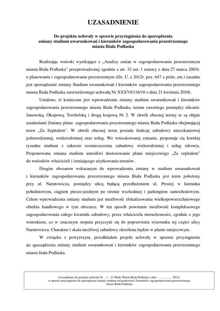 UZASADNIENIE Do projektu uchwały w sprawie przystąpienia do sporządzenia zmiany studium uwarunkowań i kierunków zagospodarowania przestrzennego miasta Biała Podlaska Realizując wnioski wynikające z „Analizy zmian w zagospodarowaniu przestrzennym miasta Biała Podlaska” przeprowadzonej zgodnie z art. 32 ust. 1 ustawy z dnia 27 marca 2003r. o planowaniu i zagospodarowaniu przestrzennym (Dz. U. z 2012r. poz. 647 z późn. zm.) zasadne jest sporządzenie zmiany Studium uwarunkowań i kierunków zagospodarowania przestrzennego miasta Biała Podlaska zatwierdzonego uchwałą Nr XXXVI/116/10 z dnia 21 kwietnia 2010r. Ustalono, iŜ konieczne jest wprowadzenie zmiany studium uwarunkowań i kierunków zagospodarowania przestrzennego miasta Biała Podlaska, terenu zawartego pomiędzy ulicami: Janowską, Okopową, Terebelską i drogą krajową Nr 2. W chwili obecnej tereny te są objęte ustaleniami Zmiany planu zagospodarowania przestrzennego miasta Biała Podlaska obejmującej teren „Za Szpitalem". W chwili obecnej teren posiada funkcję zabudowy mieszkaniowej jednorodzinnej, wielorodzinnej oraz usług. We wnioskowanej zmianie, proponuje się korektę rysunku studium z zakresie rozmieszczenia zabudowy wielorodzinnej i usług zdrowia. Proponowana zmiana studium umoŜliwi dostosowanie planu miejscowego „Za szpitalem” do wniosków właścicieli i istniejącego uŜytkowania terenów. Drugim obszarem wskazanym do wprowadzenia zmiany w studium uwarunkowań i kierunków zagospodarowania przestrzennego miasta Biała Podlaska jest teren połoŜony przy ul. Narutowicza, pomiędzy ulicą będącą przedłuŜeniem ul. Prostej w kierunku południowym, ciągiem pieszo-jezdnym po stronie wschodniej i parkingiem samochodowym. Celem wprowadzenia zmiany studium jest moŜliwość zlokalizowania wielkopowierzchniowego obiektu handlowego w tym obszarze. W ten sposób powstanie moŜliwość kompleksowego zagospodarowania całego kwartału zabudowy, przez właściciela nieruchomości, zgodnie z jego wnioskiem, co w znacznym stopniu przyczyni się do poprawienia wizerunku tej części ulicy Narutowicza. Charakter i skala moŜliwej zabudowy określona będzie w planie miejscowym. W związku z powyŜszym, przedkładam projekt uchwały w sprawie przystąpienia do sporządzenia zmiany studium uwarunkowań i kierunków zagospodarowania przestrzennego miasta biała Podlaska. Uzasadnienie do projektu uchwały Nr …/…/13 Rady Miasta Biała Podlaska z dnia …………… 2013r. w sprawie przystąpienia do sporządzenia zmiany studium uwarunkowań i kierunków zagospodarowania przestrzennego miasta Biała Podlaska