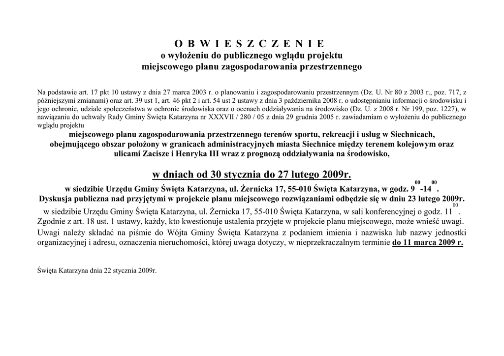 O B W I E S Z C Z E N I E o wyłoŜeniu do publicznego wglądu projektu miejscowego planu zagospodarowania przestrzennego Na podstawie art. 17 pkt 10 ustawy z dnia 27 marca 2003 r. o planowaniu i zagospodarowaniu przestrzennym (Dz. U. Nr 80 z 2003 r., poz. 717, z późniejszymi zmianami) oraz art. 39 ust 1, art. 46 pkt 2 i art. 54 ust 2 ustawy z dnia 3 października 2008 r. o udostępnianiu informacji o środowisku i jego ochronie, udziale społeczeństwa w ochronie środowiska oraz o ocenach oddziaływania na środowisko (Dz. U. z 2008 r. Nr 199, poz. 1227), w nawiązaniu do uchwały Rady Gminy Święta Katarzyna nr XXXVII / 280 / 05 z dnia 29 grudnia 2005 r. zawiadamiam o wyłoŜeniu do publicznego wglądu projektu miejscowego planu zagospodarowania przestrzennego terenów sportu, rekreacji i usług w Siechnicach, obejmującego obszar połoŜony w granicach administracyjnych miasta Siechnice między terenem kolejowym oraz ulicami Zacisze i Henryka III wraz z prognozą oddziaływania na środowisko, w dniach od 30 stycznia do 27 lutego 2009r. 00 00 w siedzibie Urzędu Gminy Święta Katarzyna, ul. śernicka 17, 55-010 Święta Katarzyna, w godz. 9 -14 . Dyskusja publiczna nad przyjętymi w projekcie planu miejscowego rozwiązaniami odbędzie się w dniu 23 lutego 2009r. 00 w siedzibie Urzędu Gminy Święta Katarzyna, ul. śernicka 17, 55-010 Święta Katarzyna, w sali konferencyjnej o godz. 11 . Zgodnie z art. 18 ust. 1 ustawy, kaŜdy, kto kwestionuje ustalenia przyjęte w projekcie planu miejscowego, moŜe wnieść uwagi. Uwagi naleŜy składać na piśmie do Wójta Gminy Święta Katarzyna z podaniem imienia i nazwiska lub nazwy jednostki organizacyjnej i adresu, oznaczenia nieruchomości, której uwaga dotyczy, w nieprzekraczalnym terminie do 11 marca 2009 r. Święta Katarzyna dnia 22 stycznia 2009r.