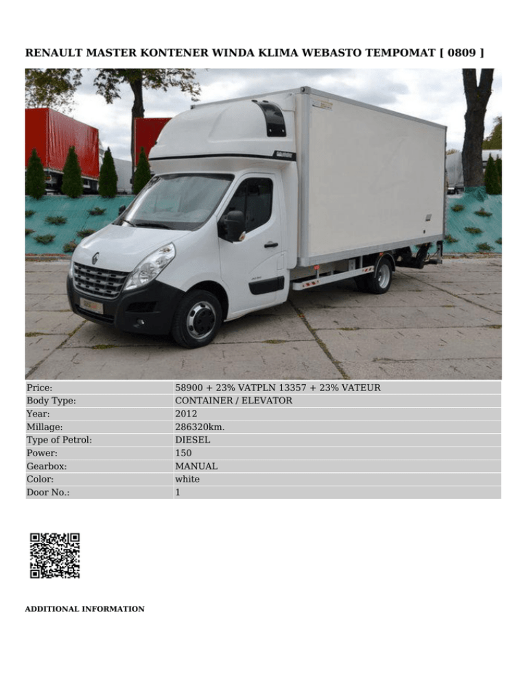 RENAULT MASTER KONTENER WINDA KLIMA WEBASTO TEMPOMAT [ 0809 ] Price: Body Type: Year: Millage: Type of Petrol: Power: Gearbox: Color: Door No.: ADDITIONAL INFORMATION 58900 + 23% VATPLN 13357 + 23% VATEUR CONTAINER / ELEVATOR 2012 286320km. DIESEL 150 MANUAL white 1 ● ● ● ● accident-free zarejestrowany w polsce stan bardzo dobry Kupiony w salonie w Polsce OPTIONAL EXTRAS ● ● ● ● ● ● ● ● ● ● ● ● ABS centralny zamek elektryczne lusterka immobiliser klimatyzacja komputer radio / cd tempomat wspomaganie kierownicy elektryczne szyby ogrzewanie postojowe halogeny DESCRIPTION OFFER NUMBER-0809 Bought in Poland Renault Master container, box with lift. Year of manufacture 2012, white color. Never crashed car, efficient 100% in perfect technical and visual condition. The interior is spacious and very well maintained. The ideal work engine, gearbox and suspension. Painting in very good condition. Auto with engine 2.3 dci 150HP. Auto ready to work immediately.DMC this car is 4.5 ton. Car equipped: aircondition, webasto, cruise control, pneumatic suspension and sleepcabin. Lift DHOLLANDIA. Equipment: - ABS - Driver airbag - Air Conditioning - Cruise control - Radio - Electric windows and mirrors - Central locking - Immobilizer - The computer - 6 speed - 3 seats - Multifunctional steering wheel - Armrest - lift DHOLLANDIA - Dimensions of the cargo area: length / 500 cm / Width / 226 cm / Height / 230 cm /