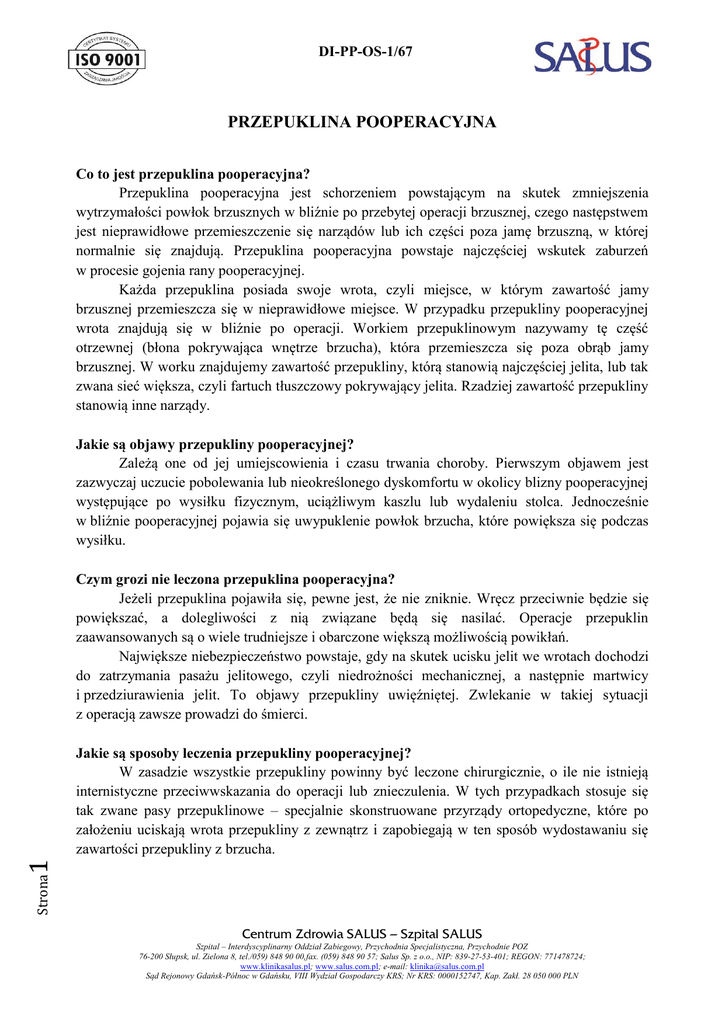 DI-PP-OS-1/67 PRZEPUKLINA POOPERACYJNA Co to jest przepuklina pooperacyjna? Przepuklina pooperacyjna jest schorzeniem powstającym na skutek zmniejszenia wytrzymałości powłok brzusznych w bliźnie po przebytej operacji brzusznej, czego następstwem jest nieprawidłowe przemieszczenie się narządów lub ich części poza jamę brzuszną, w której normalnie się znajdują. Przepuklina pooperacyjna powstaje najczęściej wskutek zaburzeń w procesie gojenia rany pooperacyjnej. Każda przepuklina posiada swoje wrota, czyli miejsce, w którym zawartość jamy brzusznej przemieszcza się w nieprawidłowe miejsce. W przypadku przepukliny pooperacyjnej wrota znajdują się w bliźnie po operacji. Workiem przepuklinowym nazywamy tę część otrzewnej (błona pokrywająca wnętrze brzucha), która przemieszcza się poza obrąb jamy brzusznej. W worku znajdujemy zawartość przepukliny, którą stanowią najczęściej jelita, lub tak zwana sieć większa, czyli fartuch tłuszczowy pokrywający jelita. Rzadziej zawartość przepukliny stanowią inne narządy. Jakie są objawy przepukliny pooperacyjnej? Zależą one od jej umiejscowienia i czasu trwania choroby. Pierwszym objawem jest zazwyczaj uczucie pobolewania lub nieokreślonego dyskomfortu w okolicy blizny pooperacyjnej występujące po wysiłku fizycznym, uciążliwym kaszlu lub wydaleniu stolca. Jednocześnie w bliźnie pooperacyjnej pojawia się uwypuklenie powłok brzucha, które powiększa się podczas wysiłku. Czym grozi nie leczona przepuklina pooperacyjna? Jeżeli przepuklina pojawiła się, pewne jest, że nie zniknie. Wręcz przeciwnie będzie się powiększać, a dolegliwości z nią związane będą się nasilać. Operacje przepuklin zaawansowanych są o wiele trudniejsze i obarczone większą możliwością powikłań. Największe niebezpieczeństwo powstaje, gdy na skutek ucisku jelit we wrotach dochodzi do zatrzymania pasażu jelitowego, czyli niedrożności mechanicznej, a następnie martwicy i przedziurawienia jelit. To objawy przepukliny uwięźniętej. Zwlekanie w takiej sytuacji z operacją zawsze prowadzi do śmierci. Strona 1 Jakie są sposoby leczenia przepukliny pooperacyjnej? W zasadzie wszystkie przepukliny powinny być leczone chirurgicznie, o ile nie istnieją internistyczne przeciwwskazania do operacji lub znieczulenia. W tych przypadkach stosuje się tak zwane pasy przepuklinowe – specjalnie skonstruowane przyrządy ortopedyczne, które po założeniu uciskają wrota przepukliny z zewnątrz i zapobiegają w ten sposób wydostawaniu się zawartości przepukliny z brzucha. Centrum Zdrowia SALUS – Szpital SALUS Szpital – Interdyscyplinarny Oddział Zabiegowy, Przychodnia Specjalistyczna, Przychodnie POZ 76-200 Słupsk, ul. Zielona 8, tel./059) 848 90 00,fax. (059) 848 90 57; Salus Sp. z o.o., NIP: 839-27-53-401; REGON: 771478724; www.klinikasalus.pl; www.salus.com.pl; e-mail: [email protected] Sąd Rejonowy Gdańsk-Północ w Gdańsku, VIII Wydział Gospodarczy KRS; Nr KRS: 0000152747, Kap. Zakł. 28 050 000 PLN DI-PP-OS-1/67 Jakie są przeciwwskazania do operacji? brak zgody pacjenta schorzenia będące przeciwwskazaniem do operacji lub znieczulenia ropne choroby skóry Na czym polega operacja? Operacja przepukliny pooperacyjnej polega na wzmocnieniu i rekonstrukcji słabszej części ściany brzucha. Istnieje szereg różnych metod ich zaopatrywania. Obecnie najczęściej stosuje się tzw. metody beznapięciowe z wszyciem siatek z tworzywa sztucznego. Pozwoliło to na dziesięciokrotne zmniejszenie liczby nawrotów przepukliny. Siatkę przyszywa się do odpowiednich struktur tak, by zamknąć wrota przepukliny, przez które pod skórę uwypuklają się narządy jamy brzusznej. Siatka po pewnym czasie zrasta się z otaczającymi tkankami stwarzając mocną zaporę przed nawrotem schorzenia Strona 2 Jakie mogą pojawić się komplikacje? Wskutek leczenia operacyjnego dojść może do powikłań, z których najczęstsze, to: Krwawienie z rany, najczęściej wymagające powtórnej operacji. Zakażenie rany, wymagające podawania antybiotyków, a niekiedy chirurgicznego otwarcia i drenażu rany. Niewielki odsetek pacjentów skarży się na trudne do sprecyzowania uczucie bólu, mrowienia lub pieczenia w okolicy operowanej. Jeśli takie dolegliwości wystąpią, to ustępują one lub znacznie zmniejszają swoje nasilenie w trakcie kilku miesięcy. Nawrót przepukliny, który występuje u 1 do 3 procent operowanych. Inne, rzadkie i trudne do przewidzenia powikłania Jak przygotować się do operacji? Jeśli chorujesz na schorzenia takie, jak cukrzyca, nadciśnienie tętnicze, choroba wieńcowa, zaburzenia rytmu serca, alergie lub, jeśli przyjmujesz leki zmniejszające krzepliwość krwi (aspiryna, acard, polocard, acenokumarol, sintrom, warfin), poinformuj o tym swojego chirurga i zgłoś się do swojego Lekarza Rodzinnego w celu odpowiedniego przygotowania do operacji. Jeśli przyjmujesz hormonalne środki antykoncepcyjne lub stosujesz hormonalną terapię zastępczą w okresie menopauzy – odstaw leki hormonalne (hormony płciowe) miesiąc przed operacją. Jeśli cierpisz na próchnicę zębów – zgłoś się do dentysty i wylecz zęby odpowiednio wcześniej. W przypadku stosowania na stałe leków – zabierz je ze sobą do szpitala w oryginalnych opakowaniach. Ostatni posiłek powinien być zjedzony najdalej sześć godzin przed operacją. Do szpitala prosimy zabrać dowód ubezpieczenia i skierowanie na operację (nie obowiązuje w przypadku operacji opłacanych prywatnie). W dniu zabiegu pacjent powinien wykonać dokładną poranną toaletę (kąpiel lub prysznic) całego ciała. Centrum Zdrowia SALUS – Szpital SALUS Szpital – Interdyscyplinarny Oddział Zabiegowy, Przychodnia Specjalistyczna, Przychodnie POZ 76-200 Słupsk, ul. Zielona 8, tel./059) 848 90 00,fax. (059) 848 90 57; Salus Sp. z o.o., NIP: 839-27-53-401; REGON: 771478724; www.klinikasalus.pl; www.salus.com.pl; e-mail: [email protect