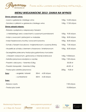 MENU WIELKANOCNE 2013- DANIA NA WYNOS Zimne zakąski rybne: - Łosoś w galarecie z białego wina 150g 15,00 zł/por. - Sandacz z piklami w galarecie z białego wina 150g 17,00 zł/por. Zimne zakąski mięsne: - Rolada z polędwicy wieprzowej z farszem z niebieskiego sera z orzechami z suszonymi pomidorami 100g 9,00 zł/por. - Indyk z owocami i pistacjami w maladze 100g 8,00 zł/por. - Indyk faszerowany ricottą i owocami żurawiny 100g 8,00 zł/por. - Schab z farszem boczkowo- majerankowym z suszoną śliwką 100g 7,00 zł/por. - Muszelki ze schabu z kremem chrzanowo- śmietanowym 100g 8,00 zł/por. - Szczególnie polecamy tradycyjną galantynę z kurczaka z farszem warzywnym, gotowaną w lnianej ściereczce - Sałatka jarzynowa zawijana w szynkę 140g 9,00zł/por. 100g 7,00 zł/por. - Pasztet z dziczyzny – foremka 0,5kg 55,00 zł - Pasztet staropolski – foremka 0,5kg 45,00 zł - Tradycyjna sałatka jarzynowa Sosy: 200g - angielski, tatarski 50ml - 4,00 zł/por. - cumberland 50ml - 4,50 zł/por. 9,00 zł Zupy: - Barszcz czysty 7,00 zł/por. - Tradycyjny żurek 10,00zł/por. Dania ciepłe: - Łosoś z rusztu – 200g filet z sosem maślanym 32,00 zł/por. - Domowe pierogi z mięsnym farszem cielęco- wieprzowym 18,00 zł/8szt - Pieczeń z sarny w sosie winno- śmietanowym 43,00zł/por. 300g *Jest możliwość zamówienia pieczonej szynki z sarny w całości - Pieczeń z królika w sosie śmietanowo- musztardowym 300g 40,00/por. - Kaczka pieczona z sosem (porcja to pół kaczki) 46,00/por. - Przepiórka pieczona macerowana szałwią i cytryną 1 szt. 31,00zł/szt. - Indyk w całości faszerowana bakaliami i wątróbką drobiową ok. 5 kg. 91,00 zł/ kg * zamówienia z pięciodniowym wyprzedzeniem - Szynka pieczona w całości w aromacie czerwonego wina, 89,00 zł/ kg miodu lipowego i dzikiego czosnku ok. 7 kg. * zamówienia z pięciodniowym wyprzedzeniem - Modra kapusta doprawiona suszoną śliwą i porzeczkami 200g 9,00zł/por. - Buraki zasmażane na masełku 200g 7,00zł/por. - Domowe pyzy drożdżowe 1,00 zł/szt. Ciasta: - Sernik Waldemara 60,00 zł/kg - Sernik z rosą 60,00 zł/kg Półmisek jednorazowy mały - 4,00 zł. Półmisek jednorazowy duży - 6,00 zł. W Wsszzyyssttkkiiee nnaasszzee ppoottrraaw wyy ssąą pprrzzyyggoottoow wyyw waannee zz nnaajjlleep psszzeejj jja akkoośśccii pprrood duukkttóów w,, bbeezz uużżyycciiaa uulleeppsszzaacczzyy ssm ma akkuu,, kkoonnsseerrw wa annttóów w ii bbaarrw wnniikkóów w.. ZZaakkąąsskkii m miięęssnnee oorraazz ppaasszztteettyy ssąą w wyyttw wa arrzzaannee w wyyłłą ącczznniiee zz m miięęssaa p piieerrw wsszzeejj jjaakkoośśccii,, nna a 110000gg pprroodduukkttuu zzuużżyyttoo m miinn 114400gg m miięęssaa.. D Doo nnaasszzyycchh w wyyppiieekkóów w nniiee ssttoossuujjeem myy jja ajjeekk w wp prroosszzkkuu ii w wzzm maaccnniiaacczzyy ssm maakkuu..