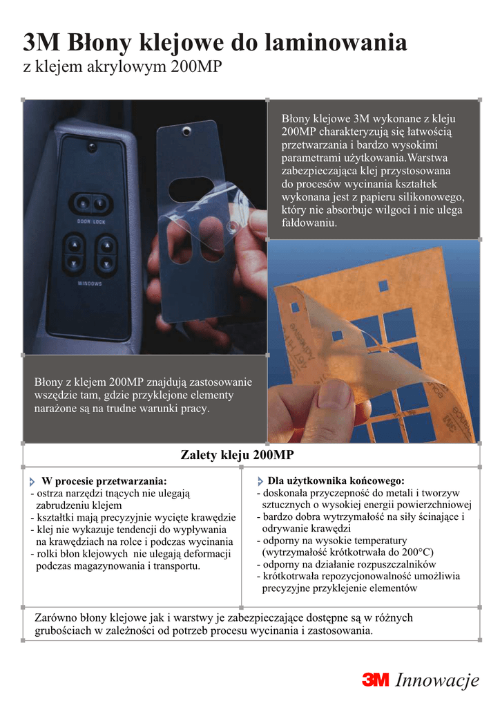 3M B³ony klejowe do laminowania z klejem akrylowym 200MP B³ony klejowe 3M wykonane z kleju 200MP charakteryzuj¹ siê ³atwoœci¹ przetwarzania i bardzo wysokimi parametrami u¿ytkowania.Warstwa zabezpieczaj¹ca klej przystosowana do procesów wycinania kszta³tek wykonana jest z papieru silikonowego, który nie absorbuje wilgoci i nie ulega fa³dowaniu. B³ony z klejem 200MP znajduj¹ zastosowanie wszêdzie tam, gdzie przyklejone elementy nara¿one s¹ na trudne warunki pracy. Zalety kleju 200MP W procesie przetwarzania: - ostrza narzêdzi tn¹cych nie ulegaj¹ zabrudzeniu klejem - kszta³tki maj¹ precyzyjnie wyciête krawêdzie - klej nie wykazuje tendencji do wyp³ywania na krawêdziach na rolce i podczas wycinania - rolki b³on klejowych nie ulegaj¹ deformacji podczas magazynowania i transportu. Dla u¿ytkownika koñcowego: - doskona³a przyczepnoœæ do metali i tworzyw sztucznych o wysokiej energii powierzchniowej - bardzo dobra wytrzyma³oœæ na si³y œcinaj¹ce i odrywanie krawêdzi - odporny na wysokie temperatury (wytrzyma³oœæ krótkotrwa³a do 200°C) - odporny na dzia³anie rozpuszczalników - krótkotrwa³a repozycjonowalnoœæ umo¿liwia precyzyjne przyklejenie elementów Zarówno b³ony klejowe jak i warstwy je zabezpieczaj¹ce dostêpne s¹ w ró¿nych gruboœciach w zale¿noœci od potrzeb procesu wycinania i zastosowania. 3 Innowacje Przyk³adowe zastosowania: samoprzylepne emblematy i elementy dekoracyjne p³yty czo³owe w panelach kontrolnych klawiatury membranowe Wybrane b³ony klejowe z klejem 200MP* Numer produktu Liner Gruboœæ kleju (mm) 467MP 7952MP 0,05 7962MP 7965MP Gruboœæ (mm) 58# PCK 0,1 Laminowanie etykiet, elewacji graficznych klejonych na g³adkie powierzchnie Format Maks. szer. x d³g. 1220mm x 165m 58/58# 0,1/0,1 Wersja 467MP w arkuszach PCK arkusze 610 x 910mm Wersja 467MP w arkuszach, z grubszym 58/86# 0,1/0,165 linerem, u³atwiaj¹cym wycinanie PCK arkusze 610 x 910mm rolki 1220mm x 165m 58/58# 0,1/0,1 Wersja 468MP w arkuszach PCK arkusze 610 x 910mm Wersja 468MP w arkuszach, z grubszym 58/86# 0,1/0,165 linerem, u³atwiaj¹cym wycinanie PCK arkusze 610 x 910mm 58# PCK 0,13 Opis rolki 468MP 7955MP Typ 0,1 Grubszy klej umo¿liwia zastosowania na fakturowanych powierzchniach * w celu uzyskania szczegó³owych informacji prosimy o bezpoœredni kontakt W ofercie 3M tak¿e: b³ony klejowe z klejem 300LSE przeznaczone do stosowania na powierzchniach niskoenergetycznych np. polietylen i polipropylen; szeroka gama cienkich taœm dwustronnie klej¹cych z ró¿nymi rodzajami kleju; kleje do nanoszenia metod¹ sitodruku. Wszystkie informacje, dane techniczne oraz zalecenia odnosz¹ce siê do produktów firmy 3M oparte s¹ na testach, które oceniamy jako wiarygodne; ze wzglêdu jednak na ró¿norodnoœæ materia³ów, pod³o¿y i odmiennych warunków pracy nie mo¿emy zagwarantowaæ ca³kowitej skutecznoœci aplikacji. U¿ytkownik ponosi ca³kowit¹ odpowiedzialnoœæ za decyzjê, czy dany produkt jest odpowiedni do zastosowania przy konkretnej aplikacji oraz za jej wykonanie. W przypadku dodatkowych pytañ prosimy o bezpoœredni kontakt: 3