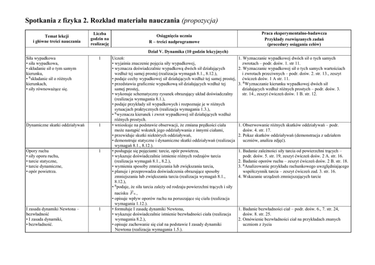 Spotkania z fizyka 2. Rozkład materiału nauczania (propozycja) Temat lekcji i główne treści nauczania Liczba godzin na realizację Osiągnięcia ucznia R – treści nadprogramowe Praca eksperymentalno-badawcza Przykłady rozwiązanych zadań (procedury osiągania celów) Dział V. Dynamika (10 godzin lekcyjnych) Siła wypadkowa • siła wypadkowa, • składanie sił o tym samym kierunku, • Rskładanie sił o różnych kierunkach, • siły równoważące się. 1 Dynamiczne skutki oddziaływań 1 Opory ruchu • siły oporu ruchu, • tarcie statyczne, • tarcie dynamiczne, • opór powietrza. 1 I zasada dynamiki Newtona – bezwładność • I zasada dynamiki, • bezwładność. 1 Uczeń: • wyjaśnia znaczenie pojęcia siły wypadkowej, • wyznacza doświadczalnie wypadkową dwóch sił działających wzdłuż tej samej prostej (realizacja wymagań 8.1., 8.12.), • podaje cechy wypadkowej sił działających wzdłuż tej samej prostej, • przedstawia graficznie wypadkową sił działających wzdłuż tej samej prostej, • wykonuje schematyczny rysunek obrazujący układ doświadczalny (realizacja wymagania 8.1.), • podaje przykłady sił wypadkowych i rozpoznaje je w różnych sytuacjach praktycznych (realizacja wymagania 1.3.), • Rwyznacza kierunek i zwrot wypadkowej sił działających wzdłuż różnych prostych. • wnioskuje na podstawie obserwacji, że zmiana prędkości ciała może nastąpić wskutek jego oddziaływania z innymi ciałami, • przewiduje skutki niektórych oddziaływań, • demonstruje statyczne i dynamiczne skutki oddziaływań (realizacja wymagań 8.1., 8.12.). • posługuje się pojęciami: tarcie, opór powietrza, • wykazuje doświadczalnie istnienie różnych rodzajów tarcia (realizacja wymagań 8.1., 8.2.), • wymienia sposoby zmniejszania lub zwiększania tarcia, • planuje i przeprowadza doświadczenia obrazujące sposoby zmniejszania lub zwiększania tarcia (realizacja wymagań 8.1., 8.12.), • Rpodaje, że siła tarcia zależy od rodzaju powierzchni trących i siły nacisku F N , • opisuje wpływ oporów ruchu na poruszające się ciała (realizacja wymagania 1.12.). • formułuje I zasadę dynamiki Newtona, • wykazuje doświadczalnie istnienie bezwładności ciała (realizacja wymagania 8.2.), • opisuje zachowanie się ciał na podstawie I zasady dynamiki Newtona (realizacja wymagania 1.5.). 1. Wyznaczanie wypadkowej dwóch sił o tych samych zwrotach – podr. dośw. 1. str 11. 2. Wyznaczanie wypadkowej sił o tych samych wartościach i zwrotach przeciwnych – podr. dośw. 2. str. 13., zeszyt ćwiczeń dośw. 1 A str. 11. 3. RWyznaczanie kierunku wypadkowej dwóch sił działających wzdłuż różnych prostych – podr. dośw. 3. str. 14., zeszyt ćwiczeń dośw. 1 B. str. 12. 1. Obserwowanie różnych skutków oddziaływań – podr. dośw. 4. str. 17. 2. Pokaz skutków oddziaływań (demonstracja z udziałem uczniów, analiza zdjęć). 1. Badanie zależności siły tarcia od powierzchni trących – podr. dośw. 5. str. 19, zeszyt ćwiczeń dośw. 2 A. str. 16. 2. Badanie oporów ruchu – zeszyt ćwiczeń dośw. 2 B. str. 18. 3. RAnalizowanie przykładu rachunkowego uwzględniającego współczynnik tarcia – zeszyt ćwiczeń zad. 3. str. 16. 4. Wskazanie urządzeń zmniejszających tarcie 1. Badanie bezwładności ciał – podr. dośw. 6., 7. str. 24, dośw. 8. str. 25. 2. Omówienie bezwładności ciał na przykładach znanych uczniom z życia Temat lekcji i główne treści nauczania II zasada dynamiki Newtona • II zasada dynamiki Newtona, • jednostka siły, • swobodne spadanie ciał. III zasada dynamiki Newtona • siły akcji i reakcji, • III zasada dynamiki Newtona, • zjawisko odrzutu. Pęd ciała. Zasada zachowania pędu • pęd, • jednostka pędu, • zasada zachowania pędu. Podsumowanie wiadomości z dynamiki R Sprawdzian wiadomości Liczba Osiągnięcia ucznia godzin na R – treści nadprogramowe realizację 2 • projektuje i wykonuje doświadczenia wykazujące zależność przyspieszenia od siły i masy (realizacja wymagań 8.1., 8.6., 8.7., 8.12.), • formułuje treść II zasady dynamiki Newtona, • opisuje zachowanie się ciał na podstawie II zasady dynamiki Newtona (realizacja wymagania 1.7.), • wyjaśnia, co to jest 1 N, • projektuje i przeprowadza doświadczenia badające swobodne spadanie ciał (realizacja wymagań 8.1., 8.12.), • posługuje się pojęciem przyspieszenia ziemskiego, • stosuje do obliczeń związek między masą ciała, przyspieszeniem i siłą (realizacja wymagania 1.8.), • posługuje się pojęciem siły ciężkości i oblicza jej wartość (realizacja wymagania 1.9.), • rozwiązuje zadania rachunkowe, rozróżniając wielkości dane i szukane (realizacja wymagań 8.3., 8.5.), • odczytuje dane z wykresu (realizacja wymagania 8.8.). 1 • podaje przykłady sił akcji i reakcji, • planuje i przeprowadza doświadczenie wykazujące istnienie sił akcji i reakcji (realizacja wymagań 8.1., 8.12.), • formułuje treść III zasady dynamiki Newtona, • opisuje wzajemne oddziaływanie ciał, posługując się III zasadą dynamiki Newtona (realizacja wymagania 1.10.), • opisuje zjawisko odrzutu i jego zastosowanie w technice, • demonstruje zjawisko odrzutu (realizacja wymagania 8.2.). 1 • Rposługuje się pojęciem pędu i zna jego jednostkę w układzie SI, • Rformułuje treść zasady zachowania pędu, • Rstosuje zasadę zachowania pędu w prostych przykładach, • Rrozwiązuje zadania z zastosowaniem zasady zachowania pędu. 1 1 Praca eksperymentalno-badawcza Przykłady rozwiązanych zadań (procedury osiągania celów) 1. Wykazanie, że ciało pod działaniem stałej niezrównoważonej siły porusza się ruchem jednostajnie przyspieszonym – podr. dośw. 9. str. 26, zeszyt ćwiczeń dośw. 3 A. str. 27. 2. Badanie zależności przyspieszenia od masy ciała i siły działającej na to ciało – podr. dośw. 10., 11. str. 26, 27.