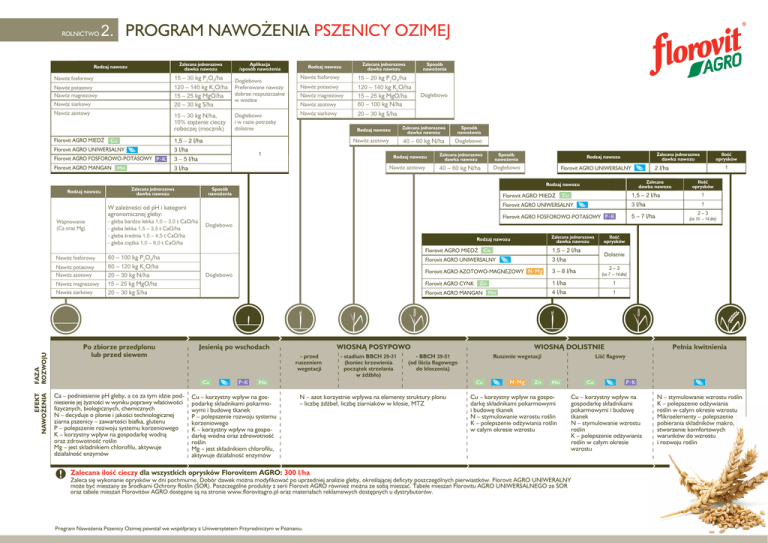 ROLNICTWO 2. PROGRAM NAWOŻENIA PSZENICY OZIMEJ Zalecana jednorazowa dawka nawozu Rodzaj nawozu Nawóz fosforowy 15 – 30 kg P2O5/ha Nawóz potasowy Nawóz magnezowy 120 – 140 kg K2O/ha 15 – 25 kg MgO/ha 20 – 30 kg S/ha Nawóz siarkowy Nawóz azotowy 15 – 30 kg N/ha, 10% stężenie cieczy roboczej (mocznik) Florovit AGRO MIEDŹ 1,5 – 2 l/ha Florovit AGRO UNIWERSALNY 3 l/ha Florovit AGRO FOSFOROWO-POTASOWY 3 – 5 l/ha Florovit AGRO MANGAN 3 l/ha Rodzaj nawozu Aplikacja /sposób nawożenia Doglebowo Preferowane nawozy dobrze rozpuszczalne w wodzie Doglebowo i w razie potrzeby dolistnie Rodzaj nawozu Zalecana jednorazowa dawka nawozu Sposób nawożenia Nawóz fosforowy 15 – 20 kg P2O5/ha Nawóz potasowy Nawóz azotowy 120 – 140 kg K2O/ha 15 – 25 kg MgO/ha 60 – 100 kg N/ha Nawóz siarkowy 20 – 30 kg S/ha Nawóz magnezowy Rodzaj nawozu Nawóz azotowy 1 Doglebowo Zalecana jednorazowa dawka nawozu Sposób nawożenia 40 – 60 kg N/ha Doglebowo Rodzaj nawozu Nawóz azotowy Zalecana jednorazowa dawka nawozu Zalecana jednorazowa dawka nawozu Sposób nawożenia 40 – 60 kg N/ha Doglebowo W zależności od pH i kategorii agronomicznej gleby: Wapnowanie (Ca oraz Mg) Nawóz fosforowy EFEKT NAWOŻENIA FAZA ROZWOJU Nawóz potasowy Nawóz azotowy - gleba bardzo lekka 1,0 – 3,0 t CaO/ha - gleba lekka 1,5 – 3,5 t CaO/ha - gleba średnia 1,0 – 4,5 t CaO/ha - gleba ciężka 1,0 – 6,0 t CaO/ha Nawóz siarkowy 20 – 30 kg S/ha Doglebowo Po zbiorze przedplonu lub przed siewem Jesienią po wschodach Ca – podniesienie pH gleby, a co za tym idzie podniesienie jej żyzności w wyniku poprawy właściwości fizycznych, biologicznych, chemicznych N – decyduje o plonie i jakości technologicznej ziarna pszenicy – zawartości białka, glutenu P – polepszenie rozwoju systemu korzeniowego K – korzystny wpływ na gospodarkę wodną oraz zdrowotność roślin Mg – jest składnikiem chlorofilu, aktywuje działalność enzymów Cu – korzystny wpływ na gospodarkę składnikami pokarmowymi i budowę tkanek P – polepszenie rozwoju systemu korzeniowego K – korzystny wpływ na gospodarkę wodna oraz zdrowotność roślin Mg – jest składnikiem chlorofilu, aktywuje działalność enzymów - stadium BBCH 29-31 (koniec krzewienia początek strzelania w źdźbło) 1 Florovit AGRO UNIWERSALNY 3 l/ha 1 Florovit AGRO FOSFOROWO-POTASOWY 5 – 7 l/ha Zalecana jednorazowa dawka nawozu Florovit AGRO UNIWERSALNY 3 l/ha Florovit AGRO AZOTOWO-MAGNEZOWY 3 – 8 l/ha Florovit AGRO CYNK 1 l/ha 1 Florovit AGRO MANGAN 4 l/ha 1 N – azot korzystnie wpływa na elementy struktury plonu – liczbę źdźbeł, liczbę ziarniaków w kłosie, MTZ Zalecana ilość cieczy dla wszystkich oprysków Florovitem AGRO: 300 l/ha 2–3 (co 7 – 14 dni) Cu – korzystny wpływ na gospodarkę składnikami pokarmowymi i budowę tkanek N – stymulowanie wzrostu roślin K – polepszenie odżywiania roślin w całym okresie wzrostu Pełnia kwitnienia Liść flagowy Cu – korzystny wpływ na gospodarkę składnikami pokarmowymi i budowę tkanek N – stymulowanie wzrostu roślin K – polepszenie odżywiania roślin w całym okresie wzrostu Zaleca się wykonanie oprysków w dni pochmurne. Dobór dawek można modyfikować po uprzedniej analizie gleby, określającej deficyty poszczególnych pierwiastków. Florovit AGRO UNIWERALNY może być mieszany ze Środkami Ochrony Roślin (ŚOR). Poszczególne produkty z serii Florovit AGRO również można ze sobą mieszać. Tabele mieszań Florovitu AGRO UNIWERSALNEGO ze ŚOR oraz tabele mieszań Florovitów AGRO dostępne są na stronie www.florovitagro.pl oraz materiałach reklamowych dostępnych u dystrybutorów. Program Nawożenia Pszenicy Ozimej powstał we współpracy z Uniwersytetem Przyrodniczym w Poznaniu. Dolistnie WIOSNĄ DOLISTNIE Ruszenie wegetacji 2–3 (co 10 – 14 dni) Ilość oprysków 1,5 – 2 l/ha - BBCH 39-51 (od liścia flagowego do kłoszenia) Ilość oprysków 1,5 – 2 l/ha Florovit AGRO MIEDŹ WIOSNĄ POSYPOWO - przed ruszeniem wegetacji 1 Florovit AGRO MIEDŹ Rodzaj nawozu 60 – 120 kg K2O/ha Nawóz magnezowy Zalecana dawka nawozu Doglebowo 60 – 100 kg P2O5/ha 20 – 30 kg N/ha 15 – 25 kg MgO/ha 2 l/ha Florovit AGRO UNIWERSALNY Rodzaj nawozu Sposób nawożenia Ilość oprysków Zalecana jednorazowa dawka nawozu Rodzaj nawozu N – stymulowanie wzrostu roślin K – polepszenie odżywiania roślin w całym okresie wzrostu Mikroelementy – polepszenie pobierania składników makro, stworzenie komfortowych warunków do wzrostu i rozwoju roślin