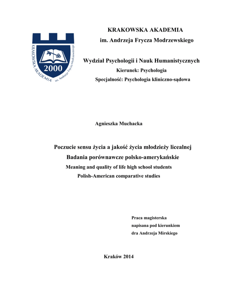 KRAKOWSKA AKADEMIA im. Andrzeja Frycza Modrzewskiego Wydział Psychologii i Nauk Humanistycznych Kierunek: Psychologia Specjalność: Psychologia kliniczno-sądowa Agnieszka Muchacka Poczucie sensu życia a jakość życia młodzieży licealnej Badania porównawcze polsko-amerykańskie Meaning and quality of life high school students Polish-American comparative studies Praca magisterska napisana pod kierunkiem dra Andrzeja Mirskiego Kraków 2014 Składam serdeczne podziękowanie wszystkim moim Wykładowcom za dzielenie się mądrością oraz wspaniałym moim Rodzicom za dobre rady, wsparcie i nieustanną motywację do nauki 2 Streszczenie Pytanie o sens życia pojawia się u człowieka wielokrotnie w ciągu jego życia. Szczególnego znaczenia nabiera ono w bardzo ważnym okresie życia, jakim jest okres adolescencji, kiedy rozwija się poczucie własnej tożsamości oraz system wartości, który może mieć wpływ na poczucie sensu życia. Wysokie lub niskie poczucie sensu życia może z kolei determinować podjęcie pracy nad sobą, wpływać na rozwijanie swoich możliwości i planów na bliższą i dalszą przyszłość. Praca ta powstała w wyniku moich zainteresowań tą problematyką. Szczególnie zainteresowało mnie to: czy i w jakim stopniu zróżnicowane kulturowo kręgi (Polska i USA) są czynnikami różnicującymi sposoby postrzegania świata przez młodzież z nich pochodzącą. Celem pracy było określenie współzależności pomiędzy poczuciem sensu a poczuciem jakości życia, krajem pochodzenia (Polska i USA) i płcią badanej młodzieży oraz wyjaśnienie faktu istnienia ewentualnych różnic w poszukiwanym i aktualnym poczuciu sensu życia u osób z dwóch badanych grup kulturowych. Badania zostały przeprowadzone na grupie 172 uczniów - 81 uczniów III Liceum Ogólnokształcącego w Krakowie, w tym 40 dziewcząt i 41 chłopców oraz 91 uczniów International High School w Nowym Yorku i William Howard Taft High School w Chicago w tym 59 dziewcząt i 32 chłopców, w wieku od 17 do 19 lat. Poziom poczucia sensu życia określany był przy pomocy skal Testu Sensu Życia (PLT) J. Crumbaugha i L.T. Maholicka oraz wybranych skal Kwestionariusza Poczucia Sensu Życia (MLQ), autorstwa M.F. Steger, P.Fraizer i Sh. Oishi. Przyjęte hipotezy badawcze zostały pozytywnie zweryfikowane. Abstract The question of the life meaning appears in a man many times during his life. It is of special importance in a very important period of life, which is the period of adolescence, when they develop a sense of their own identity and value system, the may have an impact on the meaning of life. High or low sense of meaning of life may inturn determine taking up the employment on themselves, affect development of their capabilities and plans for the near and distant future. This paper is the result of my interest in this issue. Particularly I became interested in: whether and to what extent culturally diverse circles (Poland and United States 3 of America) are the factors that differentiate the ways of perceiving the word through young people coming from them. The aim of the study was to determine the correlation between the seans of meaning and the sense of quality in life, the country of origin (Poland and United States of America) ad sex of the young people, as well as explanation the existence of any differences in the sought-after and the current sense of the meaning of life in people from two cultural studied groups. The research was conducted on a group of 172 students - 81 students from the III High School in Cracow, including 40 girls and 41 boys, and 91 students from International High School in New York and William Howard Taft High School in Chicago 59 girls and 32 boys, in age between 17 and 19 years old. The level of the sense of life was determined using scales of the tests: Sense of Life (PLT) J. Crumbaugha and L.T. Maholicka and selected scales of Meaning in Life Questionnaire (MLQ) by M.F. Steger, P. Fraizer and Sh. Oishi. Adopted hypotheses have been positively verified. 4 Spis treści Wstęp ........................................................................................................................................... 7 Rozdział I................................................................................................................................... 10 Teoretyczne podstawy badań własnych .................................................................................... 10 1. „Poczucie sensu życia” jako przedmiot badań naukowych ............................................... 10 1.1. Pojęcia „sens” i „życie” w aspekcie naukowym ............................................................ 11 1.2. Pojęcia „sens życia” i „poczucie sensu życia” w świetle teorii naukowych oraz w praktyce badawczej ............................................................................................................ 12 2. Kategoria jakość życia w refleksji teoretycznej i w badaniach empirycznych.................. 20 2.1. Kategoria jakość życia jako obiectum refleksji teoretycznej i badań empirycznych w różnych dziedzinach nauki. ............................................................................................... 21 2.2. Fenomen jakość życia w kręgu zainteresowań psychologii ........................................... 25 3. Czynniki warunkujące poczucie sensu życia .................................................................... 34 3.1. Osobowościowe aspekty kategorii sens życia i poczucia sensu życia ............................ 34 3.2. Kulturowe aspekty kategorii sens życia i poczucia sensu życia ..................................... 37 4. Charakterystyka rozwoju osobowości w okresie dorastania. ............................................ 41 4.1. Rozwój poznawczy ......................................................................................................... 41 4.2. Rozwój psychospołecz