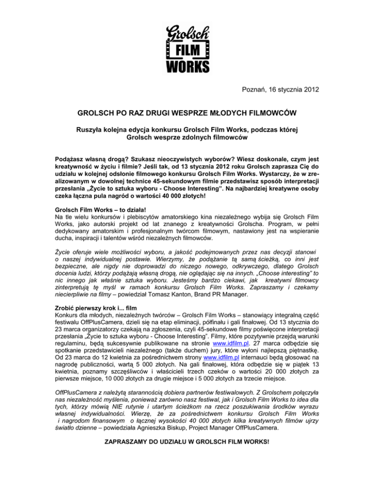 Poznań, 16 stycznia 2012 GROLSCH PO RAZ DRUGI WESPRZE MŁODYCH FILMOWCÓW Ruszyła kolejna edycja konkursu Grolsch Film Works, podczas której Grolsch wesprze zdolnych filmowców Podążasz własną drogą? Szukasz nieoczywistych wyborów? Wiesz doskonale, czym jest kreatywność w życiu i filmie? Jeśli tak, od 13 stycznia 2012 roku Grolsch zaprasza Cię do udziału w kolejnej odsłonie filmowego konkursu Grolsch Film Works. Wystarczy, że w zrealizowanym w dowolnej technice 45-sekundowym filmie przedstawisz sposób interpretacji przesłania „Życie to sztuka wyboru - Choose Interesting”. Na najbardziej kreatywne osoby czeka łączna pula nagród o wartości 40 000 złotych! Grolsch Film Works – to działa! Na tle wielu konkursów i plebiscytów amatorskiego kina niezależnego wybija się Grolsch Film Works, jako autorski projekt od lat znanego z kreatywności Grolscha. Program, w pełni dedykowany amatorskim i profesjonalnym twórcom filmowym, nastawiony jest na wspieranie ducha, inspiracji i talentów wśród niezależnych filmowców. Życie oferuje wiele możliwości wyboru, a jakość podejmowanych przez nas decyzji stanowi o naszej indywidualnej postawie. Wierzymy, że podążanie tą samą ścieżką, co inni jest bezpieczne, ale nigdy nie doprowadzi do niczego nowego, odkrywczego, dlatego Grolsch docenia ludzi, którzy podążają własną drogą, nie oglądając się na innych. „Choose interesting” to nic innego jak właśnie sztuka wyboru. Jesteśmy bardzo ciekawi, jak kreatywni filmowcy zinterpretują tę myśl w ramach konkursu Grolsch Film Works. Zapraszamy i czekamy niecierpliwie na filmy – powiedział Tomasz Kanton, Brand PR Manager. Zrobić pierwszy krok i... film Konkurs dla młodych, niezależnych twórców – Grolsch Film Works – stanowiący integralną część festiwalu OffPlusCamera, dzieli się na etap eliminacji, półfinału i gali finałowej. Od 13 stycznia do 23 marca organizatorzy czekają na zgłoszenia, czyli 45-sekundowe filmy poświęcone interpretacji przesłania „Życie to sztuka wyboru - Choose Interesting”. Filmy, które pozytywnie przejdą warunki regulaminu, będą sukcesywnie publikowane na stronie www.idfilm.pl. 27 marca odbędzie się spotkanie przedstawicieli niezależnego (także duchem) jury, które wyłoni najlepszą piętnastkę. Od 23 marca do 12 kwietnia za pośrednictwem strony www.idfilm.pl internauci będą głosować na nagrodę publiczności, wartą 5 000 złotych. Na gali finałowej, która odbędzie się w piątek 13 kwietnia, poznamy szczęśliwców i właścicieli trzech czeków o wartości 20 000 złotych za pierwsze miejsce, 10 000 złotych za drugie miejsce i 5 000 złotych za trzecie miejsce. OffPlusCamera z należytą starannością dobiera partnerów festiwalowych. Z Grolschem połączyła nas niezależność myślenia, ponieważ zarówno nasz festiwal, jak i Grolsch Film Works to idea dla tych, którzy mówią NIE rutynie i utartym ścieżkom na rzecz poszukiwania środków wyrazu własnej indywidualności. Wierzę, że za pośrednictwem konkursu Grolsch Film Works i nagrodom finansowym o łącznej wysokości 40 000 złotych kilka kreatywnych filmów ujrzy światło dzienne – powiedziała Agnieszka Biskup, Project Manager OffPlusCamera. ZAPRASZAMY DO UDZIAŁU W GROLSCH FILM WORKS! Szczegóły i regulamin na www.idfilm.pl, www.grolsch.pl oraz na http://www.facebook.com/Grolsch.Polska *** Grolsch. Idziesz własną drogą? Grolsch to wyjątkowa, marka piwa dla ludzi niezależnych duchem, podążających własną drogą, którzy doceniają nie tylko jego wyśmienity smak ale przede wszystkim jego oryginalność i zaangażowanie. Grolsch powstaje w jednym z najnowocześniejszych i najbardziej ekologicznych browarów w Europie, w holenderskim mieście Enschede. Swój doskonały smak zawdzięcza unikalnej technice warzenia w niskiej temperaturze. Grolsch to najwyższej jakości holenderskie piwo typu lager, zawierające 5% alkoholu i 11,3% ekstraktu. Najlepiej smakuje podawane w temperaturze 6-8 C. Grolsch to marka dystrybuowana przez Kompanię Piwowarską od sierpnia 2009 roku. Grolsch w Polsce patronuje niezależnym wydarzeniom artystycznym, angażując się także w działania, których celem jest wspieranie niestandardowego sposobu myślenia. Kompania Piwowarska - Lider branży piwowarskiej w Polsce Kompania Piwowarska jest największym przedsiębiorstwem piwowarskim w Polsce. Kilkusetletnie doświadczenia w warzeniu piwa, nowoczesne technologie i rygorystyczne przestrzeganie zasad produkcji na światowym poziomie gwarantują najwyższą jakość naszych produktów. Do portfela marek KP należą najpopularniejsze polskie piwa - m.in. Tyskie, Żubr, Lech, Dębowe Mocne, Redd's, a także międzynarodowe marki premium: Pilsner Urquell, Grolsch oraz Peroni Nastro Azzurro. Kompania Piwowarska (utworzona w 1999 roku) posiada trzy browary (w Tychach, Poznaniu i Białymstoku) oraz czternaście oddziałów handlowych na terenie całego kraju. Kompania Piwowarska prowadzi także działalność społeczną nastawioną na walkę z wykluczeniem społecznym na tle ubóstwa oraz programy edukacyjne popularyzujące odpowiedzialność i umiar w konsumowaniu alkoholu. Wielkość sprzedaży osiągniętej przez KP w roku finansowym zakończonym 31 marca 2010 r. wyniosła 14,6 mln hektolitrów piwa. SABMiller – jeden z największych na świecie producentów piwa Kompania Piwowarska jest częścią jednego z największych na świecie producentów piwa - SABMiller plc. Grupa produkuje lub dystrybuuje piwo na sześciu kontynentach, a jej ogólnoświatowy portfel obejmuje międzynarodowe piwa premium, takie jak Grolsch, Miller Genuine Draft, Peroni Nastro Azzurro czy Pilsner Urquell oraz czołowe marki lokalne, takie jak Aquila, Castle, Miller Lite, Snow czy Tyskie. SABMiller jest jedną z największych na świecie (poza USA) firm rozlewających produkty Coca-Coli. W roku finansowym zakończonym 31 marca 2009 SABMiller osiągn
