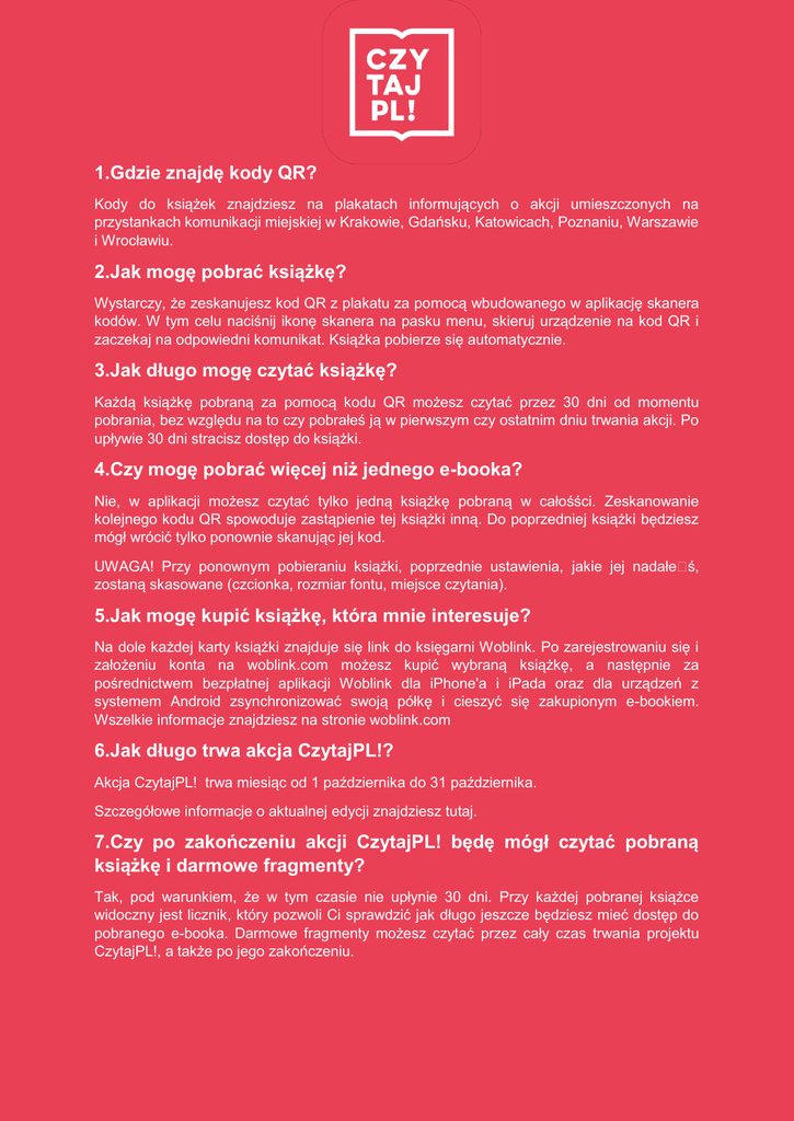 1.Gdzie znajdę kody QR? Kody do książek znajdziesz na plakatach informujących o akcji umieszczonych na przystankach komunikacji miejskiej w Krakowie, Gdańsku, Katowicach, Poznaniu, Warszawie i Wrocławiu. 2.Jak mogę pobrać książkę? Wystarczy, że zeskanujesz kod QR z plakatu za pomocą wbudowanego w aplikację skanera kodów. W tym celu naciśnij ikonę skanera na pasku menu, skieruj urządzenie na kod QR i zaczekaj na odpowiedni komunikat. Książka pobierze się automatycznie. 3.Jak długo mogę czytać książkę? Każdą książkę pobraną za pomocą kodu QR możesz czytać przez 30 dni od momentu pobrania, bez względu na to czy pobrałeś ją w pierwszym czy ostatnim dniu trwania akcji. Po upływie 30 dni stracisz dostęp do książki. 4.Czy mogę pobrać więcej niż jednego e-booka? Nie, w aplikacji możesz czytać tylko jedną książkę pobraną w całośści. Zeskanowanie kolejnego kodu QR spowoduje zastąpienie tej książki inną. Do poprzedniej książki będziesz mógł wrócić tylko ponownie skanując jej kod. UWAGA! Przy ponownym pobieraniu książki, poprzednie ustawienia, jakie jej nadałeś, zostaną skasowane (czcionka, rozmiar fontu, miejsce czytania). 5.Jak mogę kupić książkę, która mnie interesuje? Na dole każdej karty książki znajduje się link do księgarni Woblink. Po zarejestrowaniu się i założeniu konta na woblink.com możesz kupić wybraną książkę, a następnie za pośrednictwem bezpłatnej aplikacji Woblink dla iPhone'a i iPada oraz dla urządzeń z systemem Android zsynchronizować swoją półkę i cieszyć się zakupionym e-bookiem. Wszelkie informacje znajdziesz na stronie woblink.com 6.Jak długo trwa akcja CzytajPL!? Akcja CzytajPL! trwa miesiąc od 1 października do 31 października. Szczegółowe informacje o aktualnej edycji znajdziesz tutaj. 7.Czy po zakończeniu akcji CzytajPL! będę mógł czytać pobraną książkę i darmowe fragmenty? Tak, pod warunkiem, że w tym czasie nie upłynie 30 dni. Przy każdej pobranej książce widoczny jest licznik, który pozwoli Ci sprawdzić jak długo jeszcze będziesz mieć dostęp do pobranego e-booka. Darmowe fragmenty możesz czytać przez cały czas trwania projektu CzytajPL!, a także po jego zakończeniu.