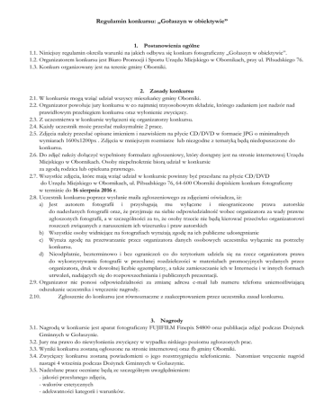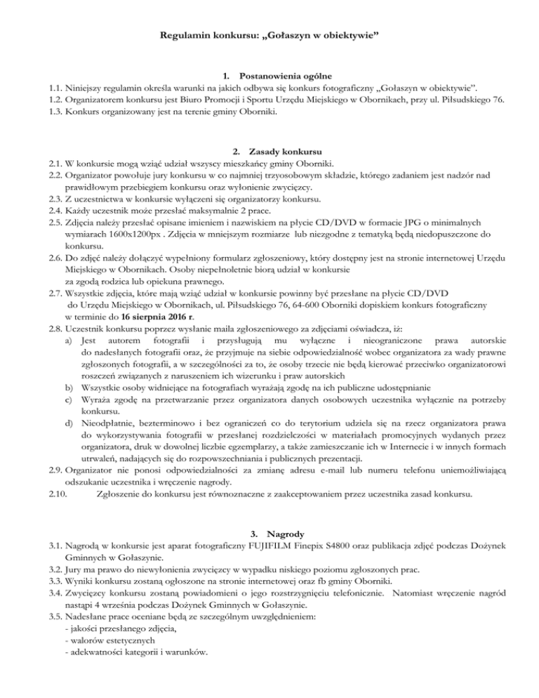 Regulamin konkursu: „Gołaszyn w obiektywie” 1. Postanowienia ogólne 1.1. Niniejszy regulamin określa warunki na jakich odbywa się konkurs fotograficzny „Gołaszyn w obiektywie”. 1.2. Organizatorem konkursu jest Biuro Promocji i Sportu Urzędu Miejskiego w Obornikach, przy ul. Piłsudskiego 76. 1.3. Konkurs organizowany jest na terenie gminy Oborniki. 2. Zasady konkursu 2.1. W konkursie mogą wziąć udział wszyscy mieszkańcy gminy Oborniki. 2.2. Organizator powołuje jury konkursu w co najmniej trzyosobowym składzie, którego zadaniem jest nadzór nad prawidłowym przebiegiem konkursu oraz wyłonienie zwycięzcy. 2.3. Z uczestnictwa w konkursie wyłączeni się organizatorzy konkursu. 2.4. Każdy uczestnik może przesłać maksymalnie 2 prace. 2.5. Zdjęcia należy przesłać opisane imieniem i nazwiskiem na płycie CD/DVD w formacie JPG o minimalnych wymiarach 1600x1200px . Zdjęcia w mniejszym rozmiarze lub niezgodne z tematyką będą niedopuszczone do konkursu. 2.6. Do zdjęć należy dołączyć wypełniony formularz zgłoszeniowy, który dostępny jest na stronie internetowej Urzędu Miejskiego w Obornikach. Osoby niepełnoletnie biorą udział w konkursie za zgodą rodzica lub opiekuna prawnego. 2.7. Wszystkie zdjęcia, które mają wziąć udział w konkursie powinny być przesłane na płycie CD/DVD do Urzędu Miejskiego w Obornikach, ul. Piłsudskiego 76, 64-600 Oborniki dopiskiem konkurs fotograficzny w terminie do 16 sierpnia 2016 r. 2.8. Uczestnik konkursu poprzez wysłanie maila zgłoszeniowego za zdjęciami oświadcza, iż: a) Jest autorem fotografii i przysługują mu wyłączne i nieograniczone prawa autorskie do nadesłanych fotografii oraz, że przyjmuje na siebie odpowiedzialność wobec organizatora za wady prawne zgłoszonych fotografii, a w szczególności za to, że osoby trzecie nie będą kierować przeciwko organizatorowi roszczeń związanych z naruszeniem ich wizerunku i praw autorskich b) Wszystkie osoby widniejące na fotografiach wyrażają zgodę na ich publiczne udostępnianie c) Wyraża zgodę na przetwarzanie przez organizatora danych osobowych uczestnika wyłącznie na potrzeby konkursu. d) Nieodpłatnie, bezterminowo i bez ograniczeń co do terytorium udziela się na rzecz organizatora prawa do wykorzystywania fotografii w przesłanej rozdzielczości w materiałach promocyjnych wydanych przez organizatora, druk w dowolnej liczbie egzemplarzy, a także zamieszczanie ich w Internecie i w innych formach utrwaleń, nadających się do rozpowszechniania i publicznych prezentacji. 2.9. Organizator nie ponosi odpowiedzialności za zmianę adresu e-mail lub numeru telefonu uniemożliwiającą odszukanie uczestnika i wręczenie nagrody. 2.10. Zgłoszenie do konkursu jest równoznaczne z zaakceptowaniem przez uczestnika zasad konkursu. 3. Nagrody 3.1. Nagrodą w konkursie jest aparat fotograficzny FUJIFILM Finepix S4800 oraz publikacja zdjęć podczas Dożynek Gminnych w Gołaszynie. 3.2. Jury ma prawo do niewyłonienia zwycięzcy w wypadku niskiego poziomu zgłoszonych prac. 3.3. Wyniki konkursu zostaną ogłoszone na stronie internetowej oraz fb gminy Oborniki. 3.4. Zwycięzcy konkursu zostaną powiadomieni o jego rozstrzygnięciu telefonicznie. Natomiast wręczenie nagród nastąpi 4 września podczas Dożynek Gminnych w Gołaszynie. 3.5. Nadesłane prace oceniane będą ze szczególnym uwzględnieniem: - jakości przesłanego zdjęcia, - walorów estetycznych - adekwatności kategorii i warunków. OŚWIADCZENIE, KARTA ZGŁOSZENIOWA DLA UCZESTNIKÓW KONKURSU „GOŁASZYN W OBIEKTYWIE” IMIĘ I NAZWISKO: …………………………………………………………………………………………... ADRES: ………………………………………………………………………………………………………… NUMER TELEFONU: ……………………………………………………………………………………….... ADRES E-MAIL: ………………………………………………………………………………………………… Oświadczam, że zapoznałem(am) się z Regulaminem – KONKURSU FOTOGRAFICZNEGO GOŁASZYN W OBIEKTYWIE organizowanym przez Biuro Promocji i Sportu Urzędu Miejskiego w Obornikach. Oświadczam, że jestem autorem nadesłanych prac i mam do nich prawo autorskie. Wyrażam zgodę na przetwarzanie i udostępnianie moich danych osobowych na potrzeby przeprowadzenia konkursu przez Urząd Miejski w Obornikach zgodnie z Ustawą o ochronie danych osobowych z dnia 29 sierpnia 1997 roku, Dz. U. Nr 133, poz. 833, z późniejszymi zmianami. IMIĘ I NAZWISKO RODZICA/OPIEKUNA: ………………………………………………………………………… ADRES: ………………………………………………………………………………………………………………….. NUMER TELEFONU: ………………………………………………………………………………………………….. OŚWIADCZENIE RODZICA, OPIEKUNA PRAWNEGO OSOBY NIEPEŁNOLETNIEJ Wyrażam zgodę na udział dziecka ……………………………………………………………………………………………………………………………, (imię i nazwisko dziecka) którego jestem rodzicem/opiekunem prawnym, na udział w Konkursie Fotograficznym Gołaszyn w obiektywie organizowanym przez Urząd Miejski w Obornikach. …………………………………. (miejscowość i data) ……………………………… (podpis)