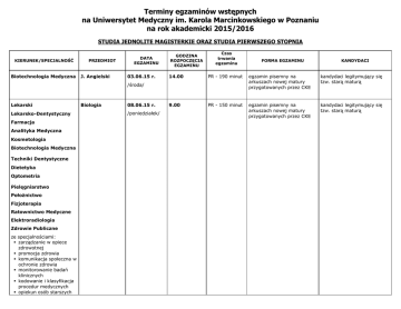Terminy egzaminów wstępnych na Uniwersytet Medyczny im. Karola Marcinkowskiego w Poznaniu na rok akademicki 2015/2016 STUDIA JEDNOLITE MAGISTERKIE ORAZ STUDIA PIERWSZEGO STOPNIA KIERUNEK/SPECJALNOŚĆ Biotechnologia Medyczna PRZEDMIOT J. Angielski DATA EGZAMINU 03.06.15 r. GODZINA ROZPOCZĘCIA EGZAMINU Czas trwania egzaminu Lekarsko-Dentystyczny Farmacja Analityka Medyczna Kosmetologia Biotechnologia Medyczna Techniki Dentystyczne Dietetyka Optometria Pielęgniarstwo Położnictwo Fizjoterapia Ratownictwo Medyczne Elektroradiologia Zdrowie Publiczne ze specjalnościami: zarządzanie w opiece zdrowotnej promocja zdrowia komunikacja społeczna w ochronie zdrowia monitorowanie badań klinicznych kodowanie i klasyfikacja procedur medycznych opiekun osób starszych Biologia 08.06.15 r. /poniedziałek/ KANDYDACI 14.00 PR - 190 minut egzamin pisemny na arkuszach nowej matury przygotowanych przez CKE kandydaci legitymujący się tzw. starą maturą 9.00 PR - 150 minut egzamin pisemny na arkuszach nowej matury przygotowanych przez CKE kandydaci legitymujący się tzw. starą maturą /środa/ Lekarski FORMA EGZAMINU higiena dentystyczna Terapia Zajęciowa Zdrowie Publiczne Historia ze specjalnościami: zarządzanie w opiece zdrowotnej promocja zdrowia komunikacja społeczna w ochronie zdrowia monitorowanie badań klinicznych kodowanie i klasyfikacja procedur medycznych opiekun osób starszych 12.06.15 r. 14.00 PR - 180 minut 9.00 PR - 180 minut 9.00 PR - 150 minut egzamin pisemny na arkuszach nowej matury przygotowanych przez CKE kandydaci legitymujący się tzw. starą maturą, którzy wybrali chemię jako przedmiot egzaminacyjny 9.00 PR - 150 minut egzamin pisemny na arkuszach nowej matury przygotowanych przez CKE kandydaci legitymujący się tzw. starą maturą 14.00 PR - 150 minut egzamin pisemny na arkuszach nowej matury przygotowanych przez CKE kandydaci legitymujący się tzw. starą maturą, którzy wybrali fizykę jako przedmiot egzaminacyjny /piątek/ egzamin pisemny na arkuszach nowej matury przygotowanych przez CKE kandydaci legitymujący się tzw. starą maturą Terapia Zajęciowa Zdrowie Publiczne Wiedza o ze specjalnościami: zarządzanie w opiece społeczeństwie zdrowotnej promocja zdrowia komunikacja społeczna w ochronie zdrowia monitorowanie badań klinicznych kodowanie i klasyfikacja procedur medycznych opiekun osób starszych 05.06.15 r. kandydaci legitymujący się tzw. starą maturą /piątek/ Terapia Zajęciowa Lekarski Chemia Lekarsko-Dentystyczny Farmacja 10.06.15 r. /środa/ Chemia Analityka Medyczna 10.06.15 r. /środa/ Kosmetologia Biotechnologia Medyczna Dietetyka Lekarski Lekarsko-Dentystyczny Fizyka 5.06.15 r. /piątek/ Optometria Elektroradiologia Techniki Dentystyczne 15.07.2015 r /środa/ PR - Poziom Rozszerzony 9.00 180 min. egzamin praktyczny /rysunek ołówkiem, rzeźba w glinie/ kandydaci legitymujący się tzw. starą maturą, nową maturą, maturą europejską EB i maturą międzynarodową IB STUDIA DRUGIEGO STOPNIA Kosmetologia SDS 21.08.15 r. 10.00 180 min. test z przedmiotów wymienionych w treści /piątek/ aktualnie obowiązujących kandydaci legitymujący się dyplomem licencjata uzyskanym na kierunku kosmetologia standardów nauczania na kierunku kosmetologia I stopnia (grupa treści podstawowych i kierunkowych) Biotechnologia SDS 26.08.2015 r. Dietetyka SDS /środa/ Protetyka słuchu SDS 27.08.2015 r. 10.00 120 min. test z zakresu studiów I stopnia kandydaci legitymujący się odpowiednio dyplomem licencjata biotechnologii lub dietetyki 10.00 120 min. test z przedmiotów kierunkowych kandydaci legitymujący się odpowiednio dyplomem pierwszego lub drugiego stopnia z zakresu nauk medycznych, przyrodniczych, ścisłych lub technicznych 10.00 120 min test z zakresu studiów I stopnia specjalności optyka okularowa kandydaci legitymujący się dyplomem licencjata lub inżyniera z zakresu optyki okularowej /czwartek/ Optometria SDS 28.08.2015 r. / piątek/ SDS - Studia Drugiego Stopnia