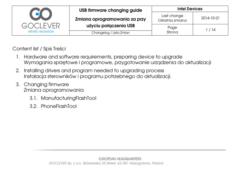 Intel Devices USB firmware changing guide Zmiana oprogramowania za przy użyciu połączenia USB Last change Ostatnia zmiana 2014-10-21 Page Strona 1 / 14 Changelog / Lista Zmian Content list / Spis Treści 1. Hardware and software requirements, preparing device to upgrade Wymagania sprzętowe i programowe, przygotowanie urządzenia do aktualizacji 2. Installing drivers and program needed to upgrading process Instalacja sterowników i programu potrzebnego do aktualizacji. 3. Changing firmware Zmiana oprogramowania 3.1. ManufacturingFlashTool 3.2. PhoneFlashTool EUROPEAN HEADQUARTERS GOCLEVER Sp. z o.o. Skórzewska 35 Street, 62-081 Wysogotowo, Poland Intel Devices USB firmware changing guide Zmiana oprogramowania za przy użyciu połączenia USB Last change Ostatnia zmiana 2014-10-21 Page Strona 2 / 14 Changelog / Lista Zmian 1. Hardware and software requirements, preparing device to upgrade Wymagania sprzętowe i programowe, przygotowanie urządzenia do aktualizacji Upgrading procedure requires PC computer with Windows XP/7 operating system and USB port. Some points can request administration rights. To connect device to PC use only good quality USB cable. Before changing firmware charge device battery. Changing firmware will erase all data from device Proces zmiany oprogramowania wymaga komputera klasy PC z zainstalowanym systemem operacyjnym Windows XP/7 oraz portem USB. Niektóre czynności związane ze zmianą oprogramowania mogą wymagać praw administratora systemu. Do podłączenia urządzenia z komputerem używaj przewodu USB dobrej jakości. Przed zmianą oprogramowania naładuj baterię urządzenia. Zmiana oprogramowania usunie wszystkie dane z urządzenia. EUROPEAN HEADQUARTERS GOCLEVER Sp. z o.o. Skórzewska 35 Street, 62-081 Wysogotowo, Poland Intel Devices USB firmware changing guide Zmiana oprogramowania za przy użyciu połączenia USB Last change Ostatnia zmiana 2014-10-21 Page Strona 3 / 14 Changelog / Lista Zmian 2. Installing drivers needed to upgrading process Instalacja sterowników potrzebnych do aktualizacji. Before installing drivers turn off automatic driver searching from windows update service. Needed drivers are not available on windows update, online searching takes a lot time. Our device can change mode in this time, and driver will not be installed correctly. You can enable this service after you change firmware successfully first time. In Windows 7 option can be enabled/disabled in Control panel/System/Additional System Settings/Devices/Installing Devices setttings/ Przed instalacją sterowników wyłącz usługę automatycznego wyszukiwania sterowników z witryny Windows Update. Potrzebne sterowniki nie są dostępne w tym serwisie, a ich szukanie spowoduje zwłokę podczas której podłączone urządzenie zmieni tryb pracy. Może to spowodować problemy z instalacją sterowników. Usługę można włączyć po pierwszej udanej zmianie oprogramowania W Windows 7 opcja dostępna jest w Panelu sterowania/System/Zaawansowane Ustawienia Systemu/Sprzęt/Ustawienia Instalacji urządzeń EUROPEAN HEADQUARTERS GOCLEVER Sp. z o.o. Skórzewska 35 Street, 62-081 Wysogotowo, Poland Intel Devices USB firmware changing guide Zmiana oprogramowania za przy użyciu połączenia USB Last change Ostatnia zmiana 2014-10-21 Page Strona 4 / 14 Changelog / Lista Zmian EUROPEAN HEADQUARTERS GOCLEVER Sp. z o.o. Skórzewska 35 Street, 62-081 Wysogotowo, Poland Intel Devices USB firmware changing guide Zmiana oprogramowania za przy użyciu połączenia USB Last change Ostatnia zmiana 2014-10-21 Page Strona 5 / 14 Changelog / Lista Zmian Install following packs with drivers: Zainstaluj następujące paczki ze sterownikami: o .NETFX3.5 SP1 Full o Intel Android Drv Setup o iSOC USB Driver Setup Install one of app needed change firmware upgrade app on PC. Zainstaluj jedną z aplikacji do aktualizacji urządzenia. o ManufacturingFlashTool o PhoneFlashTool Reboot PC Zrestartuj komputer EUROPEAN HEADQUARTERS GOCLEVER Sp. z o.o. Skórzewska 35 Street, 62-081 Wysogotowo, Poland Intel Devices USB firmware changing guide Zmiana oprogramowania za przy użyciu połączenia USB Last change Ostatnia zmiana 2014-10-21 Page Strona 6 / 14 Changelog / Lista Zmian 3. Changing firmware Zmiana oprogramowania Use one of following programs to change firmware. For customers we recommend Manufacturing flash tool. This tool is simplier. Phone flash tool has advanced options which can damage your device. Damages caused by unauthorized attempts to use advanced features of program are not covered by the warranty Użyj jednego z poniższych programów do zmiany oprogramowania. Dla klientów końcowych zalecamy program Manufacturing flash tool, który jest prostszy w obsłudze. Phone flash tool jest bardziej skomplikowany i zawiera opcje, które mogą uszkodzić urządzenie. Informujemy że uszkodzenia powstałe na skutek samowolnego używania opcji nieopisanych w poniższej instrukcji nie będą usuwane w ramach obsługi gwarancyjnej. EUROPEAN HEADQUARTERS GOCLEVER Sp. z o.o. Skórzewska 35 Street, 62-081 Wysogotowo, Poland Intel Devices USB firmware changing guide Zmiana oprogramowania za przy użyciu połączenia USB Last change Ostatnia zmiana 2014-10-21 Page Strona 7 / 14 Changelog / Lista Zmian 3.1. ManufacturingFlashTool Copy fastboot.exe from archive to path of Manufacturing Flash Tool installation directory (default C:/Program Files/Intel/Manufacturing Flash Tool), replace the old version fastboot.exe which exists in directory. This operation must be done only one time, before first changing firmware. Skopiuj plik fastboot.exe znajdujący się w archiwum z programem do katalogu w którym zainstalowano program ManufacturingFlashTool (domyślnie C:/Program Files/Intel/Manufacturing Flash Tool). Zastąp znajdującą się już tam inną wersję tego pliku. Czynność należy wykonać jednorazowo, przed pierwszą próbą zmiany oprogramowania. EUROPEAN HEADQUARTERS GOCLEVER Sp. z o.o. Skórzewska 35 Street,