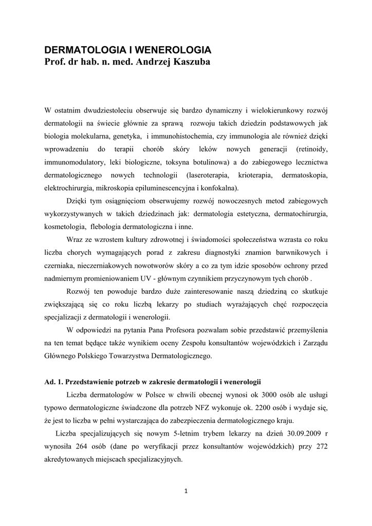DERMATOLOGIA I WENEROLOGIA Prof. dr hab. n. med. Andrzej Kaszuba W ostatnim dwudziestoleciu obserwuje się bardzo dynamiczny i wielokierunkowy rozwój dermatologii na świecie głównie za sprawą rozwoju takich dziedzin podstawowych jak biologia molekularna, genetyka, i immunohistochemia, czy immunologia ale również dzięki wprowadzeniu do terapii chorób skóry leków nowych generacji (retinoidy, immunomodulatory, leki biologiczne, toksyna botulinowa) a do zabiegowego lecznictwa dermatologicznego nowych technologii (laseroterapia, krioterapia, dermatoskopia, elektrochirurgia, mikroskopia epiluminescencyjna i konfokalna). Dzięki tym osiągnięciom obserwujemy rozwój nowoczesnych metod zabiegowych wykorzystywanych w takich dziedzinach jak: dermatologia estetyczna, dermatochirurgia, kosmetologia, flebologia dermatologiczna i inne. Wraz ze wzrostem kultury zdrowotnej i świadomości społeczeństwa wzrasta co roku liczba chorych wymagających porad z zakresu diagnostyki znamion barwnikowych i czerniaka, nieczerniakowych nowotworów skóry a co za tym idzie sposobów ochrony przed nadmiernym promieniowaniem UV - głównym czynnikiem przyczynowym tych chorób . Rozwój ten powoduje bardzo duże zainteresowanie naszą dziedziną co skutkuje zwiększającą się co roku liczbą lekarzy po studiach wyrażających chęć rozpoczęcia specjalizacji z dermatologii i wenerologii. W odpowiedzi na pytania Pana Profesora pozwalam sobie przedstawić przemyślenia na ten temat będące także wynikiem oceny Zespołu konsultantów wojewódzkich i Zarządu Głównego Polskiego Towarzystwa Dermatologicznego. Ad. 1. Przedstawienie potrzeb w zakresie dermatologii i wenerologii Liczba dermatologów w Polsce w chwili obecnej wynosi ok 3000 osób ale usługi typowo dermatologiczne świadczone dla potrzeb NFZ wykonuje ok. 2200 osób i wydaje się, że jest to liczba w pełni wystarczająca do zabezpieczenia dermatologicznego kraju. Liczba specjalizujących się nowym 5-letnim trybem lekarzy na dzień 30.09.2009 r wynosiła 264 osób (dane po weryfikacji przez konsultantów wojewódzkich) przy 272 akredytowanych miejscach specjalizacyjnych. 1 Specjalizację 3-letnią w trybie rekrutacji przez Wojewódzkie Centra Zdrowia Publicznego (Działy Doskonalenia Kadr Medycznych) kontynuuje ok. 8 osób. Natomiast ok. 50 lekarzy specjalizuje się w trybie poza rekrutacyjnym za zgodą Ministerstwa Zdrowia. Są w naszym kraju regiony gdzie dominują specjaliści z II stopniem specjalizacji lub po specjalizacji jednostopniowej ale w takich regionach jak lubelskie, podlaskie, śląskie przeważają specjaliści co prawda dysponujący dużym doświadczeniem ale po I stopniu specjalizacji uzyskanym wg starego trybu. Część tych lekarzy chętnie podjęłaby starania uzyskania specjalizacji w pełnym wymiarze na określonych przez MZ zasadach głównie ze względu na trudności z kontraktowaniem ich usług przez NFZ i brak możliwości pracy na zajmowanych dotychczas stanowiskach. Do głównych obecnych problemów i wynikających z tego potrzeb naszej specjalności w porównaniu do lat 2005-2008, z których w niedalekiej przyszłości mogą wyniknąć kłopoty z zabezpieczeniem dermatologicznym kraju (brak miejsc szkoleniowych) zaliczyłbym: • Problem kurczenia się bazy szkoleniowej wynikający z faktu zamykania oddziałów dermatologicznych i zmniejszania liczby łóżek w klinikach dermatologicznych np. w Gdańsku, Szczecinie i w Łodzi. • Nierównomierne rozmieszczenie oddziałów dermatologicznych na terenie kraju • Propozycje NFZ znacznego zmniejszenia kontraktów dla dermatologii szpitalnej i ambulatoryjnej na rok 2010 • Niska wycena procedur dermatologicznych – brak opłacalności prowadzenia oddziałów dla dyrekcji szpitali (z tego powodu zamknięto w tym miesiącu jedyny szpitalny oddział dermatologiczny na terenie województwa Lubuskiego w Zielonej Górze) • Zbyt mała liczba miejsc rezydenckich • Zła sytuacja finansowa lekarzy w ośrodkach klinicznych • Zanik relacji Mistrz-Uczeń Najgorsza sytuacja pod względem zabezpieczenia miejsc szkoleniowych istnieje w województwie świętokrzyskim i opolskim głównie ze względu na brak ośrodków akademickich (w istniejących oddziałach nie ma żadnego miejsca szkoleniowego) oraz w województwie podlaskim gdzie w jedynym poza Białymstokiem oddziale dermatologicznym Samodzielnego Publicznego Szpitala Wojewódzkiego w Suwałkach nie ma miejsc szkoleniowych. W pozostałych województwach miejsca szkoleniowe znajdowały się 2 dotychczas jedynie w ośrodkach akademickich co w ciągu najbliższych latach na skutek starzenia się personelu może doprowadzić do zamykania oddziałów na terenie wielu województw. Ad. 2. Poziom wyszkolenia specjalistów Poziom wyszkolenia specjalistów w dziedzinie dermatologii i wenerologii oceniam wysoko. Pod względem fachowym opieka dermatologiczna w Polsce jest na bardzo dobrym poziomie. Na podstawie opinii konsultantów wojewódzkich wydaje się, iż istnieje pilna potrzeba zwiększenia ilości miejsc rezydenckich w naszej specjalizacji. Planowane jest uruchomienie nowych miejsc w ośrodkach pozaakademickich głównie w istniejących oddziałach dermatologicznych spełniających warunki konieczne do akredytacji szczególnie w takich województwach jak podkarpackie, warmińsko-mazurskie, podlaskie. W chwili obecnej wnioski z oddziałów zakwalifikowanych przez specjalistów wojewódzkich stopniowo spływają do Komisji Akredytacyjnej przy Polskim Towarzystwie Dermatologicznym. W najbliższym czasie istniejący program specjalizacji a w tym zabezpieczenie w kursy niezbędne do specjalizacji oraz obowiązkowe staże powinien zostać przeredagowany. Obecnie trwają prace Komisji ZG PTD do przeprowadzenia zmian i aktualizacji programu specjalizacji zgodnie ze współczesnymi wymogami. Przewiduje się ograniczenie liczby kursów obowiązkowych, zmodyfikowanie istniejących staży specjalizacyjnych a także poprawę w zakres