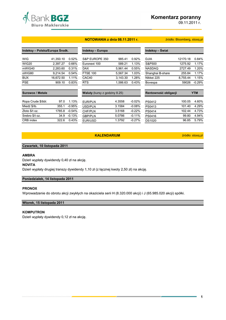 Komentarz poranny 09.11.2011 r. NOTOWANIA z dnia 08.11.2011 r. Indeksy – Polska/Europa Środk. WIG Indeksy – Europa źródło: Bloomberg, stooq.pl Indeksy – Świat 41,350.10 0.52% S&P EUROPE 350 985.41 0.92% DJIA WIG20 2,397.27 0.66% Euronext 100 589.21 1.13% S&P500 1275.92 1.17% mWIG40 2,283.60 0.31% DAX 5,961.44 0.55% NASDAQ 2727.49 1.20% 255.84 1.17% 8,755.44 1.15% 9,214.54 0.54% FTSE 100 5,567.34 1.03% Shanghai B-share BUX 16,672.50 1.11% CAC40 3,143.30 1.28% Nikkei 225 PSE 909.10 0.83% RTS 1,586.63 0.43% Bovespa sWIG80 Surowce / Metale Ropa Crude $/bbl. Waluty (kursy z godziny 8.25) 0.84% 59026 -0.29% Rentowność obligacji YTM 1.13% EUR/PLN 4.3558 -0.02% PS0412 100.05 4.60% Miedź $/lb. 355.1 -0.95% USD/PLN 3.1584 -0.08% PS0413 101.40 4.29% Złoto $/t oz. 1785.8 -0.54% CHF/PLN 3.5168 -0.22% PS0414 102.44 4.73% GBP/PLN 5.0786 -0.11% PS0416 99.80 4.94% EUR/USD 1.3792 -0.27% DS1020 96.85 5.79% Srebro $/t oz. CRB index 97.0 12170.18 34.9 -0.13% 322.6 0.43% KALENDARIUM źródło: stooq.pl Czwartek, 10 listopada 2011 AMBRA Dzień wypłaty dywidendy 0,40 zł na akcję. NOVITA Dzień wypłaty drugiej transzy dywidendy 1,10 zł (z łącznej kwoty 2,50 zł) na akcję. Poniedziałek, 14 listopada 2011 PRONOX Wprowadzenie do obrotu akcji zwykłych na okaziciela serii H (8.320.000 akcji) i J (65.985.020 akcji) spółki. Wtorek, 15 listopada 2011 KOMPUTRON Dzień wypłaty dywidendy 0,12 zł na akcję. 1 NEUCA Publikacja raportu rocznego za 2008 rok oraz skonsolidowanego raportu rocznego za 2008 rok. Komentarz poranny, 22.04.2009 Komentarz poranny, 09.11.2011 r. ANALIZA TECHNICZNA Marcin Lachowski WIG20 Od dwóch tygodni WIG20 konsoliduje się nad wsparciem wyznaczonym przez lukę hossy, której dolne ograniczenie znajduje się na poziomie 2308. Zamknięcie poniŜej tego poziomu byłoby negatywnym sygnałem. Pozytywną wymowę miałoby wybicie górą. OstrzeŜeniem, Ŝe coś się dzieje byłoby wyjście ponad krótkoterminową niebieską linię, która w środę będzie się znajdowała na poziomie 2415. Potwierdzonym sygnałem byłoby zamknięcie powyŜej szczytu z 31 sierpnia na poziomie 2452. WIG20 2800 2800 2750 2750 2700 2700 2650 2650 2600 2600 WYKRES DZIENNY SKALA ARYTMETYCZNA 2550 2550 2500 2500 2450 2450 2400 2400 2350 2350 2300 2300 2250 2250 2200 2200 2150 2150 2100 2100 2050 2050 2000 2000 25 1 8 August 16 22 29 5 12 September 19 26 3 10 October 17 24 31 7 November mWIG40 MWIG40 wygląda znacznie gorzej od WIGu20. Linia trendu wzrostowego została przełamana, luka bessy oznaczona czerwoną linią stanowi skuteczny opór, a w horyzoncie średnioterminowym na wykresie tworzy się formacja RGR z szyją na poziomie 2230. MWIG40 2450 2450 2400 2400 G 2350 2350 R R? 2300 2300 WYKRES DZIENNY SKALA LOGARYTMICZNA 2250 2250 2200 2200 2150 2150 2100 2100 2050 2050 22 29 5 12 September 19 26 3 10 October 17 24 31 7 14 November 2 Komentarz poranny, 22.04.2009 Komentarz poranny, 09.11.2011 r. ANALIZA TECHNICZNA Marcin Lachowski KONTRAKTY NA S&P500 Kontrakty na S&P500 odbiły się od szyi formacji podwójnego dna. Jest to argument za wzrostem. NajbliŜszy opór znajduje się na poziomie 1289. Spodziewam się jego testowania, a szanse na przełamanie są duŜe. S&P500 FUTURE 1370 1360 1350 1340 1330 1320 1310 1300 1290 1280 1270 1260 1250 1240 1230 1220 1210 1200 1190 1180 1170 1160 1150 1140 1130 1120 1110 1100 1090 1080 1070 1060 1050 1370 1360 1350 1340 1330 1320 1310 1300 1290 1280 1270 1260 1250 1240 1230 1220 1210 1200 1190 1180 1170 1160 1150 1140 1130 1120 1110 1100 1090 1080 1070 1060 1050 WYKRES DZIENNY SKALA ARYTMETYCZNA July August September October November KONTRAKTY NA DAX Kontrakty na DAX znajdują się nad wsparciem w przedziale 5700 – 5750. Wagę tej bariery podkreśla fakt, Ŝe stanowi ona szyję formacji RGR. Wynika z tego, Ŝe spadek poniŜej niej prawdopodobnie pociąhgnąby za sobą testowanie wrześniowego dołka w okolicach 5000. DAX FUTURE 7700 7600 7500 7400 7300 7200 7100 7000 6900 6800 6700 6600 6500 6400 6300 6200 6100 6000 5900 5800 5700 5600 5500 5400 5300 WYKRES DZIENNY SKALA ARYTMETYCZNA G R R 7700 7600 7500 7400 7300 7200 7100 7000 6900 6800 6700 6600 6500 6400 6300 6200 6100 6000 5900 5800 5700 5600 5500 5400 5300 5200 5200 5100 5100 5000 5000 4900 4900 July August September October November 3 Komentarz poranny, 22.04.2009 Komentarz poranny, 09.11.2011 r. ANALIZA TECHNICZNA Marcin Lachowski Brent Oil Future Kontrakty na ropę brent przełamały górną linię spadkowego kanału trendowego. Później nastąpiło potwierdzenie w postaci przełamania następnej linii oporu na poziomie 113,5. Droga w górę została otwarta, a sądząc po rozmiarach kanału wzrost moŜe sięgnąć 135. Po drodze jest opór na 120. BRENT OIL FUTURE 129 128 127 126 125 124 123 122 121 120 119 118 117 116 115 114 113 112 111 110 109 108 107 106 105 104 103 102 101 100 99 98 97 129 128 127 126 125 124 123 122 121 120 119 118 117 116 115 114 113 112 111 110 109 108 107 106 105 104 103 102 101 100 99 98 97 WYKRES DZIENNY SKALA LOGARYTMICZNA April May June July August September November Miedź Pod koniec października miedź wybiła się dołem z formacji podwójnego dna. Później nastąpił ruch powrotny, ale szyja zadziałała jak wsparcie. Jest to argument za wzrostem. Późniejsze wahania niczego nie zmieniły. COPPER FUTURE 430 425 420 415 410 405 400 395 390 385 380 375 370 365 360 355 350 345 340 335 330 325 320 315 310 305 300 295 290 430 425 420 415 410 405 400 395 390 385 380 375 370 365 360 355 350 345 340 335 330 325 320 315 310 305 300 295 290 WYKRES DZIENNY SKALA ARYTMETYCZNA 15 22 29 5 S 12 19 26 3 O 10 17 24 31 N 7 14 4 Komentarz poranny, 22.04.2009 Komentarz poranny, 09.11.2011 r. ANALIZA TECHNICZNA Marcin Lachowski Złoto Złoto wybiło się górą ze wzrostowego kanału trendowego. Jest to pozytywny sygnał, a sądząc po rozmiarach kanału moŜliwy jest wzrost nawet do 1920. Powrót do wnętrza kanału byłby negatywnym sygnałem. 1950 1950 GOLD FUTURE 1900 1900 1
