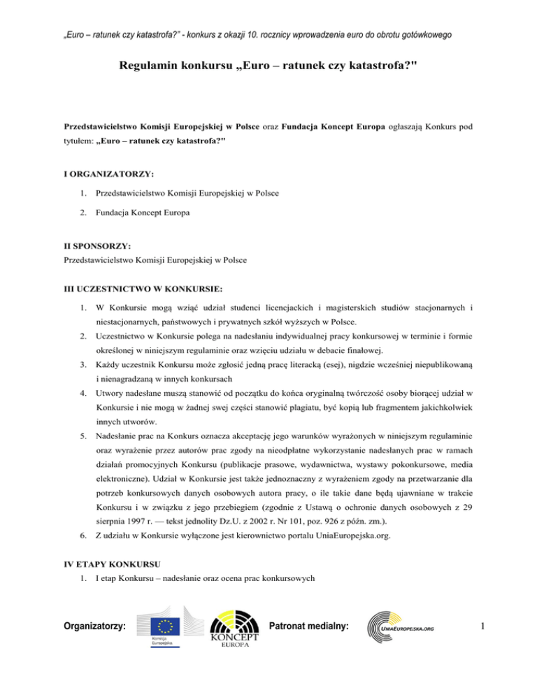 „Euro – ratunek czy katastrofa?” - konkurs z okazji 10. rocznicy wprowadzenia euro do obrotu gotówkowego Regulamin konkursu „Euro – ratunek czy katastrofa?" Przedstawicielstwo Komisji Europejskiej w Polsce oraz Fundacja Koncept Europa ogłaszają Konkurs pod tytułem: „Euro – ratunek czy katastrofa?" I ORGANIZATORZY: 1. Przedstawicielstwo Komisji Europejskiej w Polsce 2. Fundacja Koncept Europa II SPONSORZY: Przedstawicielstwo Komisji Europejskiej w Polsce III UCZESTNICTWO W KONKURSIE: 1. W Konkursie mogą wziąć udział studenci licencjackich i magisterskich studiów stacjonarnych i niestacjonarnych, państwowych i prywatnych szkół wyższych w Polsce. 2. Uczestnictwo w Konkursie polega na nadesłaniu indywidualnej pracy konkursowej w terminie i formie określonej w niniejszym regulaminie oraz wzięciu udziału w debacie finałowej. 3. Każdy uczestnik Konkursu może zgłosić jedną pracę literacką (esej), nigdzie wcześniej niepublikowaną i nienagradzaną w innych konkursach 4. Utwory nadesłane muszą stanowić od początku do końca oryginalną twórczość osoby biorącej udział w Konkursie i nie mogą w żadnej swej części stanowić plagiatu, być kopią lub fragmentem jakichkolwiek innych utworów. 5. Nadesłanie prac na Konkurs oznacza akceptację jego warunków wyrażonych w niniejszym regulaminie oraz wyrażenie przez autorów prac zgody na nieodpłatne wykorzystanie nadesłanych prac w ramach działań promocyjnych Konkursu (publikacje prasowe, wydawnictwa, wystawy pokonkursowe, media elektroniczne). Udział w Konkursie jest także jednoznaczny z wyrażeniem zgody na przetwarzanie dla potrzeb konkursowych danych osobowych autora pracy, o ile takie dane będą ujawniane w trakcie Konkursu i w związku z jego przebiegiem (zgodnie z Ustawą o ochronie danych osobowych z 29 sierpnia 1997 r. — tekst jednolity Dz.U. z 2002 r. Nr 101, poz. 926 z późn. zm.). 6. Z udziału w Konkursie wyłączone jest kierownictwo portalu UniaEuropejska.org. IV ETAPY KONKURSU 1. I etap Konkursu – nadesłanie oraz ocena prac konkursowych Organizatorzy: Patronat medialny: 1 „Euro – ratunek czy katastrofa?” - konkurs z okazji 10. rocznicy wprowadzenia euro do obrotu gotówkowego 2. II etap Konkursu – debata finałowa i rozstrzygnięcie Konkursu V TEMATYKA PRAC KONKURSOWYCH: 1. Praca konkursowa powinna argumentować na rzecz jednej z dwóch tez: a. Nie będzie Unii Europejskiej bez wspólnej waluty. Obecne problemy w strefie euro wynikają z niedostatecznego poziomu integracji państw tworzących strefę. Jedyny sposób na wyjście z kryzysu to wejście na wyższy poziom współpracy gospodarczej i politycznej - w tym, zwłaszcza w zakresie kontroli finansów publicznych. b. Integracja walutowa to największy błąd Unii Europejskiej, a samo euro jest czynnikiem destabilizującym i staje się główną przyczyną sporów zarówno między państwami strefy, jak i między strefą a pozostałymi krajami UE. Recepta na kryzys to powrót do walut narodowych i wzmocniona integracja w pozostałych dziedzinach. 2. Wybór treści pozostawiony jest autorowi pracy w ramach tematu Konkursu. VI FORMA PRAC KONKURSOWYCH: 1. Objętość pracy konkursowej nie powinna być mniejsza niż 10 000 znaków i nie większa niż 25 000 znaków ( znaki liczone są ze spacjami, czcionka Times New Roman, wielkość czcionki 12, interlinia: 1,5). 2. Prace należy dostarczyć w plikach o formacie doc. i pdf. 3. Prace należy dostarczyć organizatorom Konkursu w formie elektronicznej na adres [email protected] VII KRYTERIA OCENY PRAC KONKURSOWYCH: 1. Interesujące spojrzenie autora na tematykę Konkursu – 15 pkt. 2. Walory literackie nadesłanej pracy – 10 pkt. 3. Wiedza i zainteresowanie autora tematyką, o której pisze – 10 pkt. 4. Bibliografia – 10 pkt. 5. Jasna i logiczna struktura tekstu - 10 pkt. 6. Osobiste oczekiwania / sugestie autora w wybranym temacie – 15 pkt. VIII OCENA PRAC Oceny prac dokona komisja konkursowa powołana przez organizatorów Konkursu. Decyzje komisji są nieodwołalne i niezaskarżalne. Organizatorzy: Patronat medialny: 2 „Euro – ratunek czy katastrofa?” - konkurs z okazji 10. rocznicy wprowadzenia euro do obrotu gotówkowego IX DEBATA FINAŁOWA 1. Na debatę końcową zaproszonych zostanie 5 autorów, którzy otrzymają największą liczbę punktów w pierwszym etapie Konkursu. 2. Osoby, które w pierwszym etapie Konkursu zajmą miejsca od 6. do 10., zostaną zaproszone na finał w charakterze gości – bez prawa czynnego uczestnictwa w debacie finałowej. 3. Wystąpienia uczestników debaty ocenia komisja konkursowa powołana przez organizatorów konkursu. 4. Decyzje komisji są nieodwołalne i niezaskarżalne. X KRYTERIA OCENY WYSTĄPIEŃ UCZESTNIKÓW DEBATY FINAŁOWEJ 1. Wiedza uczestników – 10 pkt. 2. Interesujące spojrzenie i umiejętność wzbudzenia zainteresowania słuchaczy – 10 pkt. 3. Umiejętności retoryczne – 10 pkt. XI LAUREACI I FINALIŚCI KONKURSU 1. Laureatami Konkursu jest 5 pierwszych osób, które zdobędą największą sumę punktów z pracy konkursowej i debaty finałowej. 2. Finalistami Konkursu są autorzy prac konkursowych, które zajmą miejsca od 6. do 10. XII NAGRODY: 1. Nagrody dla Laureatów Konkursu: 1. miejsce — tablet, aparat fotograficzny, czytnik e-book 2. miejsce — tablet, odtwarzacz mp3 3. miejsce — netbook, odtwarzacz mp3 4. miejsce – netbook 5. miejsce – aparat fotograficzny 2. Wszyscy Laureaci i Finaliści Konkursu otrzymają nagrody książkowe oraz pamiątkowe dyplomy. XIII TERMINARZ KONKURSU: 1. Prace należy dostarczyć na adres: [email protected] do dnia 16.03.2012 r. Organizatorzy: Patronat medialny: 3 „Euro – ratunek czy katastrofa?” - konkurs z okazji 10. rocznicy wprowadzenia euro do obrotu gotówkowego 2. Rozstrzygnięcie I etapu Konkursu nastąpi do dnia 2.04.2012 r. (laureaci o wynikach zostaną poinformowani poprzez wysłanie wiadomości na adres e-mailowy, z którego został