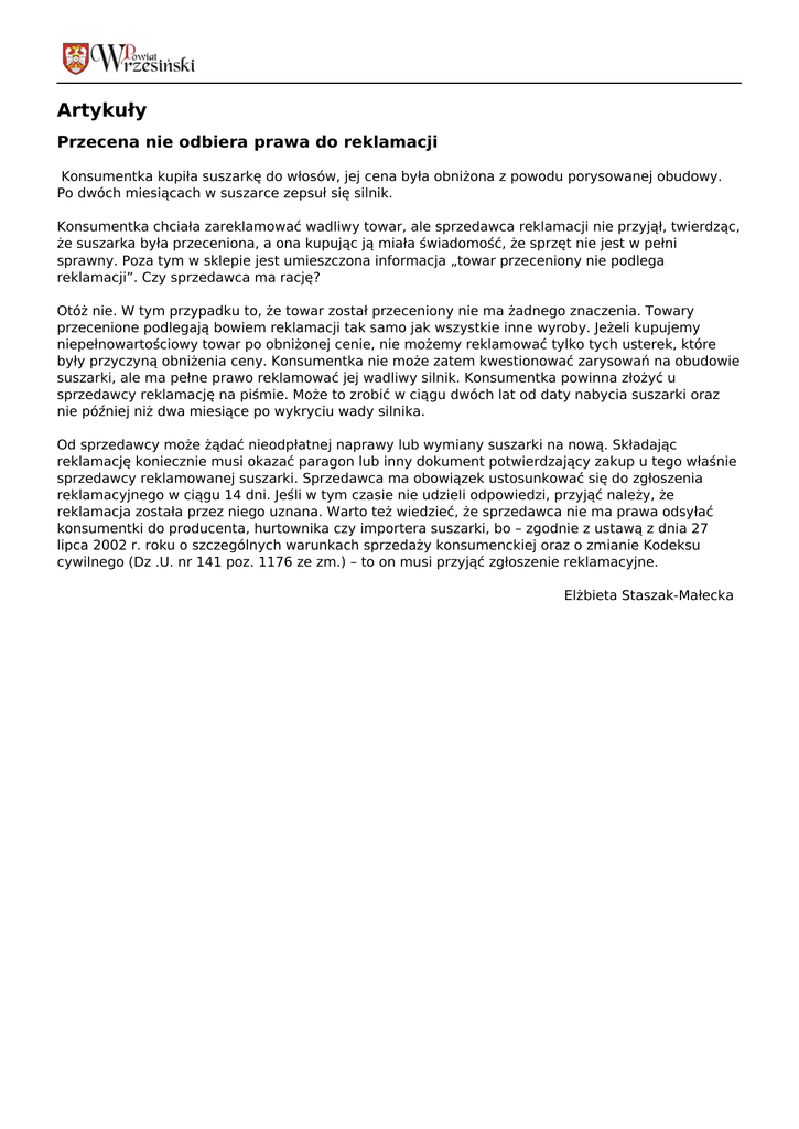 Artykuły Przecena nie odbiera prawa do reklamacji Konsumentka kupiła suszarkę do włosów, jej cena była obniżona z powodu porysowanej obudowy. Po dwóch miesiącach w suszarce zepsuł się silnik. Konsumentka chciała zareklamować wadliwy towar, ale sprzedawca reklamacji nie przyjął, twierdząc, że suszarka była przeceniona, a ona kupując ją miała świadomość, że sprzęt nie jest w pełni sprawny. Poza tym w sklepie jest umieszczona informacja „towar przeceniony nie podlega reklamacji”. Czy sprzedawca ma rację? Otóż nie. W tym przypadku to, że towar został przeceniony nie ma żadnego znaczenia. Towary przecenione podlegają bowiem reklamacji tak samo jak wszystkie inne wyroby. Jeżeli kupujemy niepełnowartościowy towar po obniżonej cenie, nie możemy reklamować tylko tych usterek, które były przyczyną obniżenia ceny. Konsumentka nie może zatem kwestionować zarysowań na obudowie suszarki, ale ma pełne prawo reklamować jej wadliwy silnik. Konsumentka powinna złożyć u sprzedawcy reklamację na piśmie. Może to zrobić w ciągu dwóch lat od daty nabycia suszarki oraz nie później niż dwa miesiące po wykryciu wady silnika. Od sprzedawcy może żądać nieodpłatnej naprawy lub wymiany suszarki na nową. Składając reklamację koniecznie musi okazać paragon lub inny dokument potwierdzający zakup u tego właśnie sprzedawcy reklamowanej suszarki. Sprzedawca ma obowiązek ustosunkować się do zgłoszenia reklamacyjnego w ciągu 14 dni. Jeśli w tym czasie nie udzieli odpowiedzi, przyjąć należy, że reklamacja została przez niego uznana. Warto też wiedzieć, że sprzedawca nie ma prawa odsyłać konsumentki do producenta, hurtownika czy importera suszarki, bo – zgodnie z ustawą z dnia 27 lipca 2002 r. roku o szczególnych warunkach sprzedaży konsumenckiej oraz o zmianie Kodeksu cywilnego (Dz .U. nr 141 poz. 1176 ze zm.) – to on musi przyjąć zgłoszenie reklamacyjne. Elżbieta Staszak-Małecka