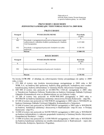 48 Załącznik nr 4 uchwały Rady Gminy Święta Katarzyna w sprawie budŜetu gminy na rok 2009 PRZYCHODY I ROZCHODY JEDNOSTKI SAMORZĄDU TERYTORIALNEGO NA 2009 ROK PRZYCHO DY Paragraf 1. 903 952 WYSZCZEGÓLNIENIE 2. Przychody z zaciągniętych poŜyczek na finansowanie zadań realizowanych z udziałem środków pochodzących z budŜetu Unii Europejskiej Przychody z zaciągniętych poŜyczek i kredytów na rynku krajowym Razem Przychody ( w zł ) 3. 5 672 000 8 128 192 13 800 192 ROZCHODY Paragraf WYSZCZEGÓLNIENIE 1. 2. 992 Rozchody ( w zł ) 3. Spłaty otrzymanych krajowych poŜyczek i kredytów 2 178 192 Razem 2 178 192 Na kwotę 2 178 192 zł składają się zobowiązania Gminy przypadające do spłaty w 2009 roku, w tym: 1. 272 000 zł (cztery raty kredytu inwestycyjnego zaciągniętego w 2003 roku w BZ WBK S.A. na budowę hali sportowej, budowę dróg gminnych, rozbudowę sieci wodnokanalizacyjnej, budowę infrastruktury w Gminnej Strefie Aktywności Gospodarczej), 2. 600 000 zł (cztery raty poŜyczki nr 62/2001/Wn 1/OZ-sk/ zaciągniętej w 2001 roku w Narodowym Funduszu Ochrony Środowiska na budowę Gminnego Zakładu Utylizacji Odpadów Komunalnych wraz ze składowiskiem we wsi Sulęcin I etap), 3. 19 200 zł (cztery raty poŜyczki nr 4/OW/WR/2003 zaciągniętej w 2003 roku w WFOŚiGW na budowę kanalizacji sanitarnej i deszczowej Świętej Katarzynie – etap III), 4. 65 200 zł (cztery raty poŜyczki nr 5/0Z/WR/03 zaciągniętej w 2003 roku w WFOŚiGW na budowę Gminnego Zakładu Utylizacji Odpadów Komunalnych w Sulęcinie), 5. 52 600 zł (cztery raty poŜyczki nr 34/OW/WR/03 zaciągniętej w 2003 roku w WFOŚiGW na budowę kanalizacji sanitarnej i deszczowej w Radwanicach –etap IX oraz w Świętej Katarzynie –etap IV), 6. 16 000 zł (cztery raty poŜyczki nr 36/OW/WR/03 zaciągniętej w 2003 roku w WFOŚiGW na budowę infrastruktury w zakresie gospodarki ściekowej w Gminnej Strefie Aktywności Gospodarczej Siechnice – I etap), 7. 15 000 zł (cztery raty poŜyczki nr 11/OW/WR/05 zaciągniętej w 2005 roku w WFOŚiGW na budowę kanalizacji sanitarnej na osiedlu mieszkaniowym w Radwanicach – rejon ulic Wrocławska, Kolejowa, Sportowa i Pogodna), 49 8. 16 000 zł (cztery raty poŜyczki nr 06/GW/WR/05 zaciągniętej w 2005 roku w WFOŚiGW na Modernizację Stacji Uzdatniania Wody w Świętej Katarzynie), 9. 16 500 zł (cztery raty poŜyczki nr 21/GW/WR/O5 zaciągniętej w 2005 roku w WFOŚiGW na budowę sieci wodociągowej dla miejscowości Radomierzyce –Etap I), 10. 151 352 zł ( cztery raty kredytu inwestycyjnego nr 05/1211 zaciągniętego w 2005 roku w Banku Gospodarstwa Krajowego na sfinansowanie inwestycji drogowych i budowę obiektów oświatowo-sportowych na terenie Gminy Święta Katarzyna), 11. 43 240 zł (cztery raty kredytu nr 593/001/2005 zaciągniętego w 2005 roku w Banku Spółdzielczym w Oławie na sfinansowanie zadań inwestycyjnych realizowanych w 2005 roku), 12. 14 800 zł (cztery raty poŜyczki nr 3/OW/WR/06 zaciągniętej w 2006 roku w WFOŚiGW na budowę kanalizacji sanitarnej i deszczowej w ul. Jesionowej, Akacjowej i Lipowej w Świętej Katarzynie), 13. 19 000 zł (cztery raty poŜyczki nr 4/GW/WR/06 zaciągniętej w 2006 roku w WFOŚiGW na budowę sieci wodociągowej w ul. Henryka III i wzdłuŜ Strefy Aktywności Gospodarczej w Siechnicach – I etap), 14. 100 000 zł (cztery raty kredytu nr 1/JST/2006 zaciągniętego w 2006 roku w Banku Spółdzielczym w Oleśnicy na finansowanie i zrefundowanie rozchodów poniesionych przez Gminę w 2006 roku), 15. 26 000 zł (cztery raty poŜyczki nr 08/OW/WR/07 zaciągniętej w 2007 roku w WFOŚiGW na budowę kanalizacji sanitarnej w ulicy Dąbrowskiego, Nowej, Polnej i Kolejowej w Świętej Katarzynie ), 16. 21 500 zł (cztery raty poŜyczki nr 31/OW/07zaciągniętej w 2007 roku w WFOŚiGW na budowę kanalizacji sanitarnej w miejscowości Święta Katarzyna w rejonie ulic Słoneczna, Wiśniowa, RóŜana, Orzechowa, Leszczynowa, Aroniowa, Kalinowa, Bukowa, Brzoskwiniowa, Morelowa, Jabłeczna, Malinowa, Agrestowa), 17. 38 000 zł (cztery raty poŜyczki nr 05/OW/WR/08 zaciągniętej w 2008 roku w WFOŚiGW na budowę kanalizacji sanitarnej w rejonie ulic: Bzowa, Starowiejska, Stawowa, Polna w Radwanicach), 18. 31 800 zł (cztery raty poŜyczki nr 06/OW/WR/08 zaciągniętej w 2008 roku w WFOŚiGW na budowę kanalizacji sanitarnej w rejonie ulicy Henryka III w Siechnicach), 19. 640 000 zł (cztery raty kredytu inwestycyjnego nr 1/JST/2008 zaciągniętego w Banku Spółdzielczym w Oleśnicy Oddział Święta Katarzyna na sfinansowanie deficytu budŜetowego powstałego w związku z wykonywaniem zadań inwestycyjnych poniesionych przez gminę w 2008 roku), 20. 20 000 zł (dwie raty poŜyczki nr 18/OW/WR/08 zaciągniętej w 2008 roku w WFOŚiGW na budowę kanalizacji sanitarnej w rejonie ulic: Topolowej, Głównej, Lipowej i Nowej w Świętej Katarzynie).