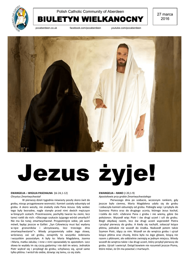 Polish Catholic Community of Aberdeen BIULETYN WIELKANOCNY pccaberdeen.co.uk facebook.com/pccaberdeen 27 marca 2016 youtube.com/pccaberdeen Jezus żyje! EWANGELIA – WIGILIA PASCHALNA (Łk 24,1-12) Chrystus Zmartwychwstał W pierwszy dzień tygodnia niewiasty poszły skoro świt do grobu, niosąc przygotowane wonności. Kamień zastały odsunięty od grobu. A skoro weszły, nie znalazły ciała Pana Jezusa. Gdy wobec tego były bezradne, nagle stanęło przed nimi dwóch mężczyzn w lśniących szatach. Przestraszone, pochyliły twarze ku ziemi, lecz tamci rzekli do nich: «Dlaczego szukacie żyjącego wśród umarłych? Nie ma Go tutaj; zmartwychwstał. Przypomnijcie sobie, jak wam mówił, będąc jeszcze w Galilei: „Syn Człowieczy musi być wydany w ręce grzeszników i ukrzyżowany, lecz trzeciego dnia zmartwychwstanie”». Wtedy przypomniały sobie Jego słowa, wróciwszy zaś od grobu, oznajmiły to wszystko Jedenastu i wszystkim pozostałym. A były to: Maria Magdalena, Joanna i Maria, matka Jakuba; i inne z nimi opowiadały to apostołom. Lecz słowa te wydały im się czczą gadaniną i nie dali im wiary. Jednakże Piotr wybrał się i przybiegł do grobu; schyliwszy się, ujrzał same tylko płótna. I wrócił do siebie, dziwiąc się temu, co się stało. EWANGELIA – RANO (J 20,1-9) Apostołowie przy grobie Zmartwychwstałego Pierwszego dnia po szabacie, wczesnym rankiem, gdy jeszcze było ciemno, Maria Magdalena udała się do grobu i zobaczyła kamień odsunięty od grobu. Pobiegła więc i przybyła do Szymona Piotra oraz do drugiego ucznia, którego Jezus kochał, i rzekła do nich: «Zabrano Pana z grobu i nie wiemy, gdzie Go położono». Wyszedł więc Piotr i ów drugi uczeń i szli do grobu. Biegli obydwaj razem, lecz ów drugi uczeń wyprzedził Piotra i przybył pierwszy do grobu. A kiedy się nachylił, zobaczył leżące płótna, jednakże nie wszedł do środka. Nadszedł potem także Szymon Piotr, idący za nim. Wszedł on do wnętrza grobu i ujrzał leżące płótna oraz chustę, która była na Jego głowie, leżącą nie razem z płótnami, ale oddzielnie zwiniętą w jednym miejscu. Wtedy wszedł do wnętrza także i ów drugi uczeń, który przybył pierwszy do grobu. Ujrzał i uwierzył. Dotąd bowiem nie rozumieli jeszcze Pisma, które mówi, że On ma powstać z martwych. 28 marca – 2 kwietnia OKTAWA WIELKANOCY To ośmiodniowe przedłużenie Niedzieli Zmartwychwstania, całotygodniowe świętowanie. Nie ma jednak obowiązku uczestniczenia we mszy św. W Poniedziałek Wielkanocny nie ma mszy po polsku. W Piątek Wielkanocny nie ma postu. Msze w Katedrze po angielsku 1230 WTOREK CZWARTEK 1900 PONIEDZIAŁEK ŚRODA PIĄTEK W Oktawie Wielkanocy nie ma mszy 700 rano. Spotkanie z uczniami w Emaus EWANGELIA – WIECZOREM (Łk 24,13-35) Poznali Chrystusa przy łamaniu chleba W pierwszy dzień tygodnia dwaj uczniowie Jezusa byli w drodze do wsi, zwanej Emaus, oddalonej o sześćdziesiąt stadiów od Jeruzalem. Rozmawiali oni z sobą o tym wszystkim, co się wydarzyło. Gdy tak rozmawiali i rozprawiali z sobą, sam Jezus przybliżył się i szedł z nimi. Lecz oczy ich były jakby przesłonięte, tak że Go nie poznali. On zaś ich zapytał: «Cóż to za rozmowy prowadzicie z sobą w drodze?» Zatrzymali się smutni. A jeden z nich, imieniem Kleofas, odpowiedział Mu: «Ty jesteś chyba jedynym z przebywających w Jerozolimie, który nie wie, co się tam w tych dniach stało». Zapytał ich: «Cóż takiego?» Odpowiedzieli Mu: «To, co się stało z Jezusem Nazarejczykiem, który był prorokiem potężnym w czynie i słowie wobec Boga i całego ludu; jak arcykapłani i nasi przywódcy wydali Go na śmierć i ukrzyżowali. A my spodziewaliśmy się, że On właśnie miał wyzwolić Izraela. Ale po tym wszystkim dziś już trzeci dzień, jak się to stało. Nadto, jeszcze niektóre z naszych kobiet przeraziły nas: były rano u grobu, a nie znalazłszy Jego ciała, wróciły i opowiedziały, że miały widzenie aniołów, którzy zapewniają, iż On żyje. Poszli niektórzy z naszych do grobu i zastali wszystko tak, jak kobiety opowiadały, ale Jego nie widzieli». Na to On rzekł do nich: «O, nierozumni, jak nieskore są wasze serca do wierzenia we wszystko, co powiedzieli prorocy! Czyż Mesjasz nie miał tego cierpieć, aby wejść do swej chwały?» I zaczynając od Mojżesza, poprzez wszystkich proroków, wykładał im, co we wszystkich Pismach odnosiło się do Niego. Tak przybliżyli się do wsi, do której zdążali, a On okazywał, jakoby miał iść dalej. Lecz przymusili Go, mówiąc: «Zostań z nami, gdyż ma się ku wieczorowi i dzień się już nachylił». Wszedł więc, aby zostać wraz z nimi. Gdy zajął z nimi miejsce u stołu, wziął chleb, odmówił błogosławieństwo, połamał go i dawał im. Wtedy otworzyły się im oczy i poznali Go, lecz On zniknął im z oczu. I mówili między sobą: «Czy serce nie pałało w nas, kiedy rozmawiał z nami w drodze i Pisma nam wyjaśniał?» W tej samej godzinie zabrali się i wrócili do Jeruzalem. Tam zastali zebranych Jedenastu, a z nimi innych, którzy im oznajmili: «Pan rzeczywiście zmartwychwstał i ukazał się Szymonowi». Oni również opowiadali, co ich spotkało w drodze i jak Go poznali przy łamaniu chleba. CODZIENNE ŚNIADANIE ZE SŁOWEM BOŻYM Piotr i Jan biegną do grobu ŚWIĘTO MIŁOSIERDZIA BOŻEGO REKOLEKCJE MIŁOSIERDZIA 1-4 kwietnia Prowadzi KATEDRA MARCIN ZIELIŃSKI lider Wspólnoty „Głos Pana” w Skierniewicach, głosi liczne rekolekcje i posługuje darem modlitwy uzdrowienia piątek 1 kwietnia 1900 MSZA O UZDROW niedziela 3 kwietnia 1430 MSZA MIŁOSIERDZIA poniedz 4 kwietnia 1930 WIECZÓR CHWAŁY Świadectwa z posługi Marcina do obejrzenia na stronie PCC EKSTREMALNA KĄPIEL ZEMSTA SPRAWIEDLIWOŚĆ MIŁOSIERDZIE W Wielki Piątek w Watykanie zgodnie ze zwyczajem kazanie pasyjne wygłosił papieski kaznodzieja o. RANIERO CANTALAMESSA OFMCap. Tematem kazania by