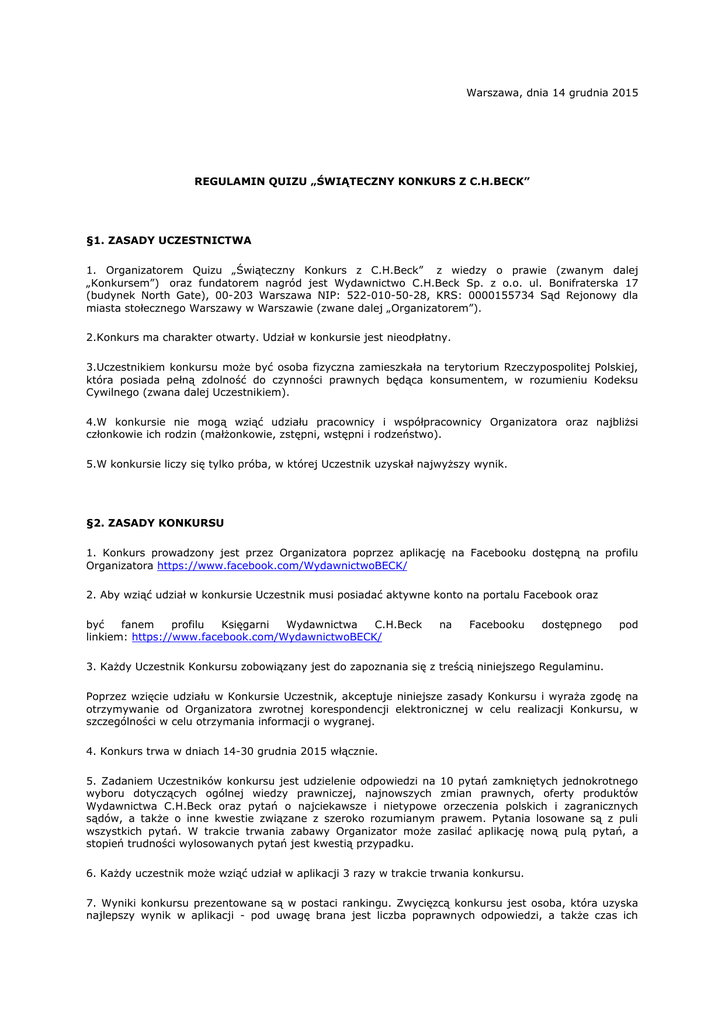 Warszawa, dnia 14 grudnia 2015 REGULAMIN QUIZU „ŚWIĄTECZNY KONKURS Z C.H.BECK” §1. ZASADY UCZESTNICTWA 1. Organizatorem Quizu „Świąteczny Konkurs z C.H.Beck” z wiedzy o prawie (zwanym dalej „Konkursem”) oraz fundatorem nagród jest Wydawnictwo C.H.Beck Sp. z o.o. ul. Bonifraterska 17 (budynek North Gate), 00-203 Warszawa NIP: 522-010-50-28, KRS: 0000155734 Sąd Rejonowy dla miasta stołecznego Warszawy w Warszawie (zwane dalej „Organizatorem”). 2.Konkurs ma charakter otwarty. Udział w konkursie jest nieodpłatny. 3.Uczestnikiem konkursu może być osoba fizyczna zamieszkała na terytorium Rzeczypospolitej Polskiej, która posiada pełną zdolność do czynności prawnych będąca konsumentem, w rozumieniu Kodeksu Cywilnego (zwana dalej Uczestnikiem). 4.W konkursie nie mogą wziąć udziału pracownicy i współpracownicy Organizatora oraz najbliżsi członkowie ich rodzin (małżonkowie, zstępni, wstępni i rodzeństwo). 5.W konkursie liczy się tylko próba, w której Uczestnik uzyskał najwyższy wynik. §2. ZASADY KONKURSU 1. Konkurs prowadzony jest przez Organizatora poprzez aplikację na Facebooku dostępną na profilu Organizatora https://www.facebook.com/WydawnictwoBECK/ 2. Aby wziąć udział w konkursie Uczestnik musi posiadać aktywne konto na portalu Facebook oraz być fanem profilu Księgarni Wydawnictwa C.H.Beck linkiem: https://www.facebook.com/WydawnictwoBECK/ na Facebooku dostępnego pod 3. Każdy Uczestnik Konkursu zobowiązany jest do zapoznania się z treścią niniejszego Regulaminu. Poprzez wzięcie udziału w Konkursie Uczestnik, akceptuje niniejsze zasady Konkursu i wyraża zgodę na otrzymywanie od Organizatora zwrotnej korespondencji elektronicznej w celu realizacji Konkursu, w szczególności w celu otrzymania informacji o wygranej. 4. Konkurs trwa w dniach 14-30 grudnia 2015 włącznie. 5. Zadaniem Uczestników konkursu jest udzielenie odpowiedzi na 10 pytań zamkniętych jednokrotnego wyboru dotyczących ogólnej wiedzy prawniczej, najnowszych zmian prawnych, oferty produktów Wydawnictwa C.H.Beck oraz pytań o najciekawsze i nietypowe orzeczenia polskich i zagranicznych sądów, a także o inne kwestie związane z szeroko rozumianym prawem. Pytania losowane są z puli wszystkich pytań. W trakcie trwania zabawy Organizator może zasilać aplikację nową pulą pytań, a stopień trudności wylosowanych pytań jest kwestią przypadku. 6. Każdy uczestnik może wziąć udział w aplikacji 3 razy w trakcie trwania konkursu. 7. Wyniki konkursu prezentowane są w postaci rankingu. Zwycięzcą konkursu jest osoba, która uzyska najlepszy wynik w aplikacji - pod uwagę brana jest liczba poprawnych odpowiedzi, a także czas ich udzielenia - im większa liczba poprawnych odpowiedzi i im krótszy czas ich udzielenia, tym wyższy wynik. Jeżeli wyniki będą identyczne, wówczas decyduje pierwszeństwo zgłoszenia do konkursu. 8. Nagrody za najwięcej poprawnych odpowiedzi udzielonych w najkrótszym czasie są następujące: Miejsce 1. - 12-miesięczny dostęp do Systemu Informacji Prawnej Legalis Compact Plus o wartości 2214zł brutto oraz dodatkowa nagroda pieniężna w wysokości odpowiadającej równowartości 10% zryczałtowanego podatku dochodowego należnego od łącznej wartości nagród w zaokrągleniu do pełnych złotych. Organizator jako płatnik potrąci 10% zryczałtowanego podatku dochodowy i pobrany podatek przekaże na rachunek bankowy właściwego urzędu skarbowego zgodnie z Art.41 ust.7 ustawy o podatku dochodowym od osób fizycznych. Miejsce 2. - Tablet Apple iPad Mini o wartości 750zł brutto. Miejsce 3. - Voucher Beck Akademia na szkolenie dla praktyków o wartości do 700zł do zrealizowania w pierwszym kwartale 2016 roku. Pełna lista seminariów będzie pojawiać się na stronie: http://akademia.beck.pl/kategoria/3-praktyk Miejsce od 4. do 14. - Gabinetowy Kalendarz Prawnika 2016, torba i długopis Miejsce od 15. do 25.- Zestaw świąteczny, czyli czerwona lub niebieska torba z napisem, notatnik i długopis 9. Uczestnicy, którzy w aplikacji zajęli miejsca powyżej 25. otrzymają kody o wartości 20zł brutto każdy do zrealizowania w księgarni przy zamówieniach powyżej 100zł. Kod nie obejmuje wartości przesyłki oraz nie łączy się z innymi promocjami. 10. Uczestnikom Konkursu nie przysługuje prawo do zastrzeżenia szczególnych cech nagród rzeczowych, ani ich wyboru, a także nie przysługuje prawo do otrzymania ich ekwiwalentu (pieniężnego, rzeczowego). W przypadku wygrania vouchera na szkolenie dla praktyków, Zwycięzcy nie przysługuje prawo otrzymania zwrotu różnicy pomiędzy kosztem seminarium, a wartością vouchera. 11. Z osobami, które w ramach aplikacji zajęły miejsca 1-25. będziemy kontaktować się mailowo (na adresy mailowe przypisane do kont na Facebooku). Vouchery i kody rabatowe do księgarni http://ksiegarnia.beck.pl zostaną przesłane w formie elektronicznej drogą mailową (na adresy mailowe przypisane do kont Uczestników na Facebooku). 12. Organizator nie odpowiada za podanie przez Uczestnika Konkursu nieaktualnego/błędnego adresu email, który uniemożliwi skontaktowanie się ze zwycięzcą/osobą wyróżnioną/ składającą reklamację. 13.W celu otrzymania nagrody nr 1 i 2, zwycięzca będzie proszony o podanie swoich aktualnych danych do korespondencji wraz z numerem telefonu oraz danych potrzebnych do rozliczenia podatku od nagrody (dane właściwiego urzędu skarbowego). 14. Ogłoszenie wyników konkursu nastąpi: 31.12.2015. adresem: https://www.facebook.com/WydawnictwoBECK/ na fanpage’u Organizatora dostępnym pod 15. Organizator pobierze wartość podatku i jako płatnik przekaże pobrany zryczałtowany podatek dochodowy na rachunek bankowy właściwego organu podatkowego, na co Uczestnik wyraża zgodę. 16. Reklamacje związane z Konkursem Uczestnik może złożyć za pośrednictwem poczty elektronicznej na adres email [email protected] przez cały okres jego trwa