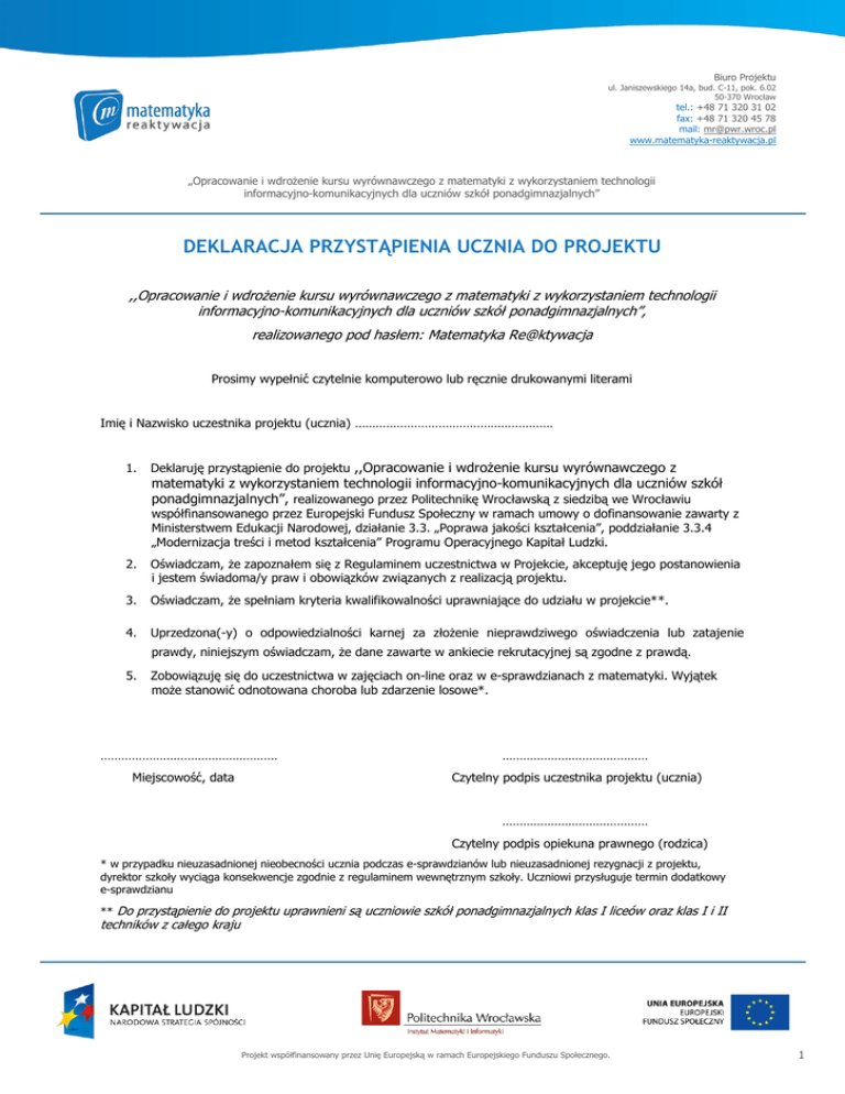 Biuro Projektu ul. Janiszewskiego 14a, bud. C-11, pok. 6.02 50-370 Wrocław tel.: +48 71 320 31 02 fax: +48 71 320 45 78 mail: [email protected] www.matematyka-reaktywacja.pl „Opracowanie i wdrożenie kursu wyrównawczego z matematyki z wykorzystaniem technologii informacyjno-komunikacyjnych dla uczniów szkół ponadgimnazjalnych” DEKLARACJA PRZYSTĄPIENIA UCZNIA DO PROJEKTU ,,Opracowanie i wdrożenie kursu wyrównawczego z matematyki z wykorzystaniem technologii informacyjno-komunikacyjnych dla uczniów szkół ponadgimnazjalnych”, realizowanego pod hasłem: Matematyka Re@ktywacja Prosimy wypełnić czytelnie komputerowo lub ręcznie drukowanymi literami Imię i Nazwisko uczestnika projektu (ucznia) ………………………………………………… 1. Deklaruję przystąpienie do projektu ,,Opracowanie i wdrożenie kursu wyrównawczego z matematyki z wykorzystaniem technologii informacyjno-komunikacyjnych dla uczniów szkół ponadgimnazjalnych”, realizowanego przez Politechnikę Wrocławską z siedzibą we Wrocławiu współfinansowanego przez Europejski Fundusz Społeczny w ramach umowy o dofinansowanie zawarty z Ministerstwem Edukacji Narodowej, działanie 3.3. „Poprawa jakości kształcenia”, poddziałanie 3.3.4 „Modernizacja treści i metod kształcenia” Programu Operacyjnego Kapitał Ludzki. 2. Oświadczam, że zapoznałem się z Regulaminem uczestnictwa w Projekcie, akceptuję jego postanowienia i jestem świadoma/y praw i obowiązków związanych z realizacją projektu. 3. Oświadczam, że spełniam kryteria kwalifikowalności uprawniające do udziału w projekcie**. 4. Uprzedzona(-y) o odpowiedzialności karnej za złożenie nieprawdziwego oświadczenia lub zatajenie prawdy, niniejszym oświadczam, że dane zawarte w ankiecie rekrutacyjnej są zgodne z prawdą. 5. Zobowiązuję się do uczestnictwa w zajęciach on-line oraz w e-sprawdzianach z matematyki. Wyjątek może stanowić odnotowana choroba lub zdarzenie losowe*. …………………………………………… Miejscowość, data …………………………………… Czytelny podpis uczestnika projektu (ucznia) …………………………………… Czytelny podpis opiekuna prawnego (rodzica) * w przypadku nieuzasadnionej nieobecności ucznia podczas e-sprawdzianów lub nieuzasadnionej rezygnacji z projektu, dyrektor szkoły wyciąga konsekwencje zgodnie z regulaminem wewnętrznym szkoły. Uczniowi przysługuje termin dodatkowy e-sprawdzianu ** Do przystąpienie do projektu uprawnieni są uczniowie szkół ponadgimnazjalnych klas I liceów oraz klas I i II techników z całego kraju Projekt współfinansowany przez Unię Europejską w ramach Europejskiego Funduszu Społecznego. 1 Biuro Projektu ul. Janiszewskiego 14a, bud. C-11, pok. 6.02 50-370 Wrocław tel.: +48 71 320 31 02 fax: +48 71 320 45 78 mail: [email protected] www.matematyka-reaktywacja.pl „Opracowanie i wdrożenie kursu wyrównawczego z matematyki z wykorzystaniem technologii informacyjno-komunikacyjnych dla uczniów szkół ponadgimnazjalnych” ANKIETA REKRUTACYJNA - DANE UCZESTNIKA PROJEKTU – UCZNIA SZKOŁY – KTÓRY OTRZYMUJE WSPARCIE W RAMACH EFS DANE Uczestnika LP NAZWA 1 Imię (imiona) 2 Nazwisko 3 Płeć 4 Wiek (w chwili przystąpienia do projektu) 5 PESEL 6 Nazwa/nr szkoły 7 Wykształcenie 8 Ulica 9 Nr domu 10 Nr lokalu 11 Kod pocztowy/Miejscowość 12 Powiat 13 Województwo 14 Telefon stacjonarny 15 Telefon komórkowy 16 Adres poczty elektronicznej 17 Rodzaj przyznanego wsparcia 18 Wykorzystanie we wsparciu technik: e-learning/blended learning 19 Data rozpoczęcia udziału w projekcie (ucznia) Dane kontaktowe (ucznia) Dane dodatkowe Gimnazjalne Projekt współfinansowany przez Unię Europejską w ramach Europejskiego Funduszu Społecznego. 2 Biuro Projektu ul. Janiszewskiego 14a, bud. C-11, pok. 6.02 50-370 Wrocław tel.: +48 71 320 31 02 fax: +48 71 320 45 78 mail: [email protected] www.matematyka-reaktywacja.pl „Opracowanie i wdrożenie kursu wyrównawczego z matematyki z wykorzystaniem technologii informacyjno-komunikacyjnych dla uczniów szkół ponadgimnazjalnych” DANE Dane kontaktowe prawnego opiekuna ucznia (rodzica) LP NAZWA 20 Data zakończenia udziału w projekcie 21 Zakończenie udziału osoby we wsparciu zgodnie z zaplanowaną dla niej ścieżką uczestnictwa 22 Imię 23 Nazwisko 24 Telefon stacjonarny 25 Telefon komórkowy 26 Adres poczty elektronicznej 27 Godziny, w którym można się kontaktować 28 Adres do korespondencji …………………………………………… Miejscowość, data …………………………………… Czytelny podpis uczestnika projektu (ucznia) …………………………………… Czytelny podpis opiekuna prawnego (rodzica) Projekt współfinansowany przez Unię Europejską w ramach Europejskiego Funduszu Społecznego. 3 Biuro Projektu ul. Janiszewskiego 14a, bud. C-11, pok. 6.02 50-370 Wrocław tel.: +48 71 320 31 02 fax: +48 71 320 45 78 mail: [email protected] www.matematyka-reaktywacja.pl „Opracowanie i wdrożenie kursu wyrównawczego z matematyki z wykorzystaniem technologii informacyjno-komunikacyjnych dla uczniów szkół ponadgimnazjalnych” OŚWIADCZENIE UCZESTNIKA PROJKETU O WYRAŻENIU ZGODY NA PRZETWARZANIE DANYCH OSOBOWYCH W związku z przystąpieniem do Projektu ,,Opracowanie i wdrożenie kursu wyrównawczego z matematyki z wykorzystaniem technologii informacyjno-komunikacyjnych dla uczniów szkół ponadgimnazjalnych”, realizowanego w ramach Programu Operacyjnego Kapitał Ludzki wyrażam zgodę na przetwarzanie moich danych osobowych. Oświadczam, iż przyjmuję do wiadomości, że: 1. administratorem tak zebranych danych osobowych jest Ministerstwo Rozwoju Regionalnego pełniące funkcję Instytucji Zarządzającej dla programu Operacyjnego Kapitał Ludzki; 2. moje dane osobowe będą przetwarzane wyłącznie w celu udzielenia wsparcia, realizacji projektu ,,Opracowanie i wdrożenie kursu wyrównawczego z matematyki z wykor