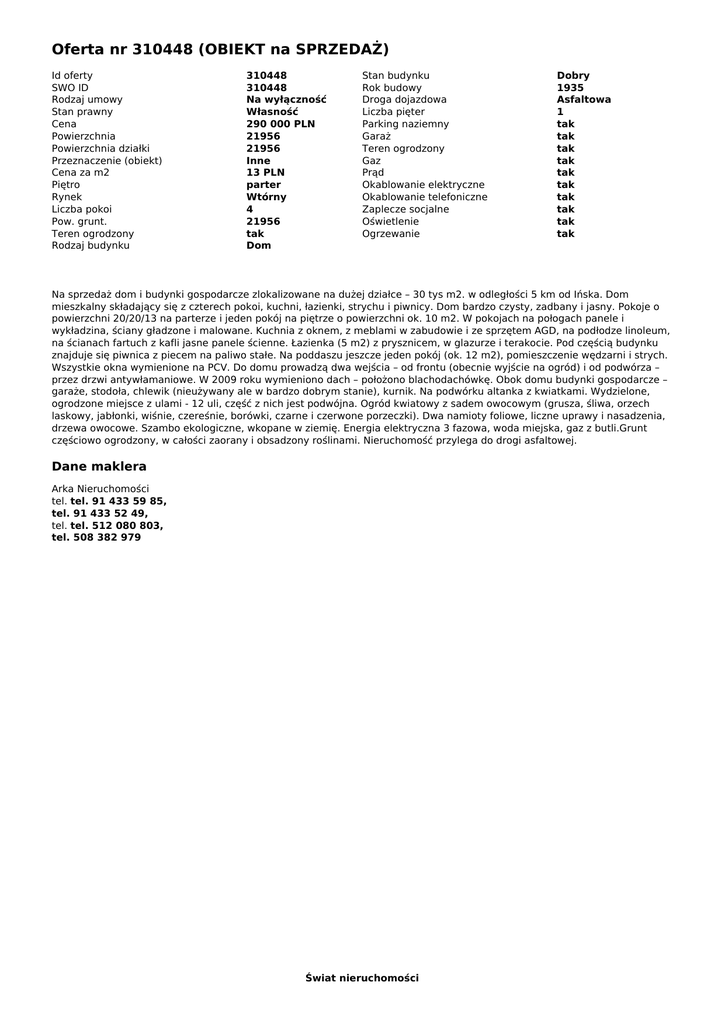 Oferta nr 310448 (OBIEKT na SPRZEDAŻ)