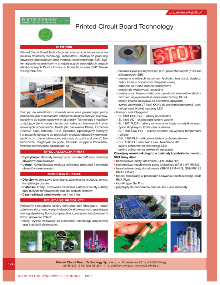pcb.elektronikab2b.pl Printed Circuit Board Technology OFIRMIE Printed Circuit Board Technology jest znanym icenionym na rynku polskim dostawcą technologii, materiałów imaszyn do produkcji obwodów drukowanych oraz montażu elektronicznego SMT. Systematycznie uczestniczymy wnajwiększych europejskich targach elektronicznych Productronica w Monachium oraz SMT Messe wNorymberdze. Bazując na wieloletnim doświadczeniu oraz gwarantując pełny profesjonalizm wkontaktach iobsłudze maszyn naszych klientów, należymy do ścisłej czołówki wtej branży. Technologie imateriały znajdujące się wnaszej ofercie pochodzą od światowych irenomowanych producentów, takich jak: Lackwerke Peters, Ormecon Chemie, Almit, Enthone, P.S.E, Excelltec. Sprzedajemy maszyny iurządzenia używane do produkcji imontażu obwodów drukowanych. m. in.: piece lutownicze, automaty do „pick and place”, fale lutownicze, magazynki na płytki, trawiarki, stripperki fotorezistu, wiertarki numeryczne, szczotkarki itp. SPECJALIZACJA FIRMY Dystrybucja: Materiały imaszyny do montażu SMT oraz produkcji obwodów drukowanych Usługi: Kompleksowa obsługa zakładów produkcji i montażu obwodów drukowanych OBSŁUGA KLIENTA Oferujemy: doradztwo techniczne, szkolenia, konsultacje, serwis, kompletację dostaw Płatności: kredyt, możliwość rozłożenia płatności na raty irabaty przy dużych zamówieniach oraz dla stałych klientów Czas realizacji zamówienia: od 1 do 2 dni – na bazie żywic epoksydowych (EP), poliuretanowych (PUR) lub silikonowych (SIR) – dostępne wróżnych wariantach lepkości, twardości, elastyczności, koloru iodporności temperaturowej – odporne na trudne warunki klimatyczne – doskonałe właściwości izolacyjne – zwiększona niezawodność oraz żywotność elementów elektronicznych najwyższa klasa niepalności V-0 wg UL 94 – masy iżywice zalewowe do elektroniki optycznej – żywica zalewowa VT 3402 KK-NV do elektroniki optycznej itechnologii czujnikowej, systemy LED lakiery zserii Elpeguard: – SL 1301 ECO-FLZ – lakiery uniwersalne – SL 1305 AQ – ekologiczne lakiery wodne – SL 1307 FLZ/2 – lakiery ochronne na bazie zmodyfikowanych żywic akrylowych, krótki czas suszenia – SL 1400 ECO-FLZ – lakiery odporne na wysoką temperaturę iwilgoć – DSL 1706 FLZ – silikonowe lakiery grubowarstwowe – DSL 1600 FLZ serii Twin-Cure utwardzane UV – lakiery ochronne do technologii LED – lakiery ochronne do elektroniki optycznej Oferujemy również ekologiczne materiały iprodukty do montażu SMT firmy Almit: bezołowiowe pasty lutownicze (LFM-48TM HP) niskotopliwe bezołowiowe pasty lutownicze (LFM-31W MHS32) bezołowiowe druty do lutowania (SR-37 LFM-48 S, GUMMIX SB RMA LFM-48) topniki stosowane wprocesach lutowania bezołowiowego (BM1 RMA Flux) topniki typu Gel Flux przyrządy do nanoszenia past na sito iinne materiały POLECANE PRODUKTY Polecamy ekologiczne lakiery ochronne serii Elpeguard i masy zalewowe do zmontowanych obwodów drukowanych, spełniające wymogi dyrektywy RoHs, kompatybilne zprocesami bezołowiowymi firmy Lackwerke Peters: masy iżywice zalewowe do elektroniki, technologii czujnikowej oraz inżynierii elektrycznej: 174 Printed Circuit Board Technology Sp. z o.o., ul. Królewiecka 221 a, 82-300 Elbląg tel. 55 236 15 03, faks 55 234 14 10, [email protected], www.pcb.elblag.pl I N F O R M AT O R R Y N KO W Y E L E K T R O N I K I 2011