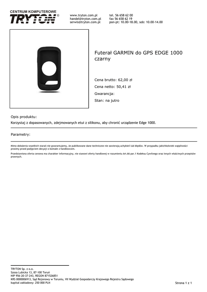 www.tryton.com.pl [email protected] [email protected] tel. 56 658 62 00 fax 56 658 62 19 pon-pt: 10.00-18.00, sob: 10.00-14.00 Futerał GARMIN do GPS EDGE 1000 czarny Cena brutto: 62,00 zł Cena netto: 50,41 zł Gwarancja: Stan: na jutro Opis produktu: Korzystaj z dopasowanych, zdejmowanych etui z silikonu, aby chronić urządzenie Edge 1000. Parametry: Mimo dołożenia wszelkich starań nie gwarantujemy, że publikowane dane techniczne nie zawierają uchybień lub błędów. W przypadku jakichkolwiek wątpliwości prosimy przed podjęciem decyzji o kontakt z handlowcem. Przedstawiona oferta cenowa ma charakter informacyjny, nie stanowi oferty handlowej w rozumieniu Art.66 par.1 Kodeksu Cywilnego oraz innych właściwych przepisów prawnych. TRYTON Sp. z o.o. Szosa Lubicka 13, 87-100 Toruń NIP 956-20-37-243, REGON 871526851 KRS 0000006913, Sąd Rejonowy w Toruniu, VII Wydział Gospodarczy Krajowego Rejestru Sądowego kapitał zakładowy: 250 000 PLN Strona 1 z 1