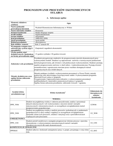 PROGNOZOWANIE PROCESÓW EKONOMICZNYCH SYLABUS A. Informacje ogólne Elementy składowe sylabusu Nazwa jednostki prowadzącej kierunek Nazwa kierunku studiów Poziom kształcenia Profil studiów Forma studiów Kod przedmiotu Język przedmiotu Rodzaj przedmiotu Rok studiów /semestr Wymagania wstępne (tzw. sekwencyjny system zajęć i egzaminów) Liczba godzin zajęć dydaktycznych z podziałem na formy prowadzenia zajęć Opis Wydział Ekonomiczno-Informatyczny w Wilnie Ekonomia Studia drugiego stopnia Ogólnoakademicki stacjonarne 1000-ES2-2PPE Język polski obowiązkowy Rok 2/ semestr III Znajomość zagadnień ekonometrii 15 godzin wykładu i 30 godzin ćwiczeń Przedmiot przygotowuje studentów do prognozowania zjawisk ekonomicznych przy wykorzystaniu modeli. Studenci są zapoznawani zarówno z teoretycznymi podstawami metod prognozowania, jak również z ich praktycznym wykorzystaniem. Studenci poznają Założenia i cele przedmiotu aspekty prognozowania zarówno w skali mikro- i makroekonomicznej. Poznają również uwarunkowania i ograniczenia stawiane przez wachlarz dostępnych metod prognostycznych oraz źródeł danych. Metody dydaktyczne oraz ogólna forma zaliczenia przedmiotu Symbol efektu przedmiotowego Metody podające (wykład z wykorzystaniem prezentacji w Power Point), metody praktyczne oraz aktywizujące (rozwiązywanie zadań z wykorzystaniem programu Microsoft Excel, praca w grupach). Przygotowania i zaprezentowania referatów z wykorzystaniem prezentacji multimedialnych i materiałów pomocniczych (praca w grupach). Ogólna forma zaliczenia przedmiotu: zaliczenie ćwiczeń + egzamin. Efekty kształcenia1 Odniesienie do kierunkowych efektów kształcenia WIEDZA 2PPE_W06 2PPE_W08 Student ma pogłębioną wiedzę w zakresie pozyskiwania, analizy i prezentacji danych statystycznych i ich wykorzystania z użyciem metod i narzędzi statystycznych i ekonometrycznych, ze szczególnym uwzględnieniem metod prognozowania gospodarczego. Student ma pogłębioną wiedzę o analizie procesów zachodzących w podmiotach gospodarczych ze sfery realnej i regulacji ze szczególnym uwzględnieniem dynamiki zmian tych procesów, struktur i instytucji oraz o prawidłowościach rządzących tymi procesami. E2W06 E2_W08 UMIEJĘTNOŚCI Student potrafi modelować a następnie prognozować złożone procesy i zjawiska ekonomiczne z wykorzystaniem zaawansowanych metod i narzędzi charakterystycznych dla nauk ekonomicznych. KOMPETENCJE SPOŁECZNE Student nabywa i doskonali umiejętności pracy w grupie, przyjmując w niej różne 2PPEK02 role. 3PPE_U04 E2_U04 E2_K02 Punkty ECTS 6 Liczba godzin Rodzaj aktywności studenta Bilans nakładu pracy studenta1 Udział w wykładach Udział w ćwiczeniach Przygotowanie do egzaminu końcowego 15 30 20 Przygotowanie się do ćwiczeń (w tym przygotowanie referatów) 55 Przygotowanie do zaliczenia ćwiczeń 30 1 Wskaźniki ilościowe Data opracowania: Nakład pracy studenta związany z za jęciami : wymagającymi bezpośredniego udziału nauczyciela o charakterze praktycznym 28.09.2015 Koordynator przedmiotu: Liczba godzin 45 105 Punkty ECTS 2 4 Dr Elżbieta Misiewicz SYLABUS B. Informacje szczegółowe Elementy składowe sylabusu Opis Nazwa przedmiotu Prognozowanie procesów ekonomicznych Kod przedmiotu Nazwa kierunku 1000-ES2-2PPE Ekonomia Nazwa jednostki prowadzącej Wydział Ekonomiczno-Informatyczny w Wilnie kierunek Język przedmiotu Język polski Rok studiów/ semestr Liczba godzin zajęć dydaktycznych oraz forma prowadzenia zajęć Liczba punktów ECTS Rok 2/ semestr III Prowadzący Elżbieta Misiewicz, dr Treści merytoryczne przedmiotu Efekty kształcenia wraz ze sposobem ich weryfikacji 15 godzin wykładu 6 Klasyfikacja, funkcje i etapy prognozowania. Prognozy na podstawie modeli jednorównaniowych oraz szeregów czasowych. Metody naiwne. Metody średniej ruchomej. Metody wygładzania wykładniczego. Modele tendencji rozwojowej. Modele składowej periodycznej. Heurystyczne metody prognozowania. Prognozowanie ostrzegawcze. Wybrane zastosowania prognozowania w przedsiębiorstwach. Efekt kształcenia 2PPE W06 2PPE W08 Egzamin końcowy X X Do egzaminu dopuszczeni zostają studenci posiadający zaliczenie z ćwiczeń, egzamin w formie pisemnej (teoria i zadania). Kryteria ocen (w %): <95-100> bdb <90–95) db+ <80–90) db <65–80) dst+ <50–65) dst Forma i warunki zaliczenia przedmiotu Wykaz literatury podstawowej i uzupełniającej 1. Barteczko Krzysztof, Bocian Andrzej F., Prognozowanie i symulacje procesów gospodarczych, Wyd. UwB, Białystok 2010. 2. Cieślak Maria (red.), Prognozowanie gospodarcze. Metody i zastosowanie, PWN, Warszawa 2008. 3. Gajda Jan, Prognozowanie i symulacja a decyzje gospodarcze, C.H. Beck, Warszawa 2001. 4. Nowak Edward, Zarys metod ekonometrii, PWN, Warszawa 2006. ………………………………. podpis osoby składającej sylabus SYLABUS S Y Elementy składowe sylabusu L A Nazwa przedmiotu B Kod przedmiotu U S Nazwa kierunku B. Informacje szczegółowe Opis Prognozowanie procesów ekonomicznych 1000-ES2-2PPE Ekonomia Nazwa jednostki prowadzącej Wydział Ekonomiczno-Informatyczny w Wilnie kierunek Język przedmiotu Język polski Rok studiów/ semestr Liczba godzin zajęć dydaktycznych oraz forma prowadzenia zajęć Liczba punktów ECTS Prowadzący Treści merytoryczne przedmiotu Efekty kształcenia wraz ze sposobem ich weryfikacji Rok 2/ semestr III 30 godzin ćwiczeń 6 Jacek Marcinkiewicz, dr; Elżbieta Misiewicz, dr 1. Model, modelowanie ekonomiczne, prognozowanie. 2. Wyznaczanie prognoz na podstawie modeli jednorównaniowych. 3. Wyznaczanie prognoz na podstawie szeregów czasowych, przy wykorzystaniu: a) metod naiwnych; b) metody średniej ruchomej; c) wygładzania wykładniczego; d) modeli tendencji rozwojowej; e) modeli składowej periodycznej; 4. Metody heurystyczne prognozowania. 5. Prognozowanie ostrzegawcze. Efekt kształcenia Ocena aktywności w Kolokwium Przygotowanie i prezentacja referatu trakcie