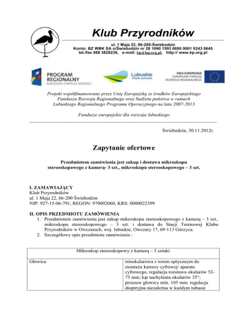Klub Przyrodników ul. 1 Maja 22, 66-200-Świebodzin Konto: BZ WBK SA o/Świebodzin nr 28 1090 1593 0000 0001 0243 0645 tel./fax 068 3828236, e-mail: [email protected], http:// www.kp.org.pl Projekt współfinansowany przez Unię Europejską ze środków Europejskiego Funduszu Rozwoju Regionalnego oraz budżetu państwa w ramach Lubuskiego Regionalnego Programu Operacyjnego na lata 2007-2013 Fundusze europejskie dla rozwoju lubuskiego ___________________________________________________________________________ Świebodzin, 30.11.2012r. Zapytanie ofertowe Przedmiotem zamówienia jest zakup i dostawa mikroskopu stereoskopowego z kamerą- 3 szt., mikroskopu stereoskopowego – 3 szt. I. ZAMAWIAJĄCY Klub Przyrodników ul. 1 Maja 22, 66-200 Świebodzin NIP: 927-15-06-791, REGON: 970002060, KRS: 0000022399 II. OPIS PRZEDMIOTU ZAMÓWIENIA 1. Przedmiotem zamówienia jest zakup mikroskopu stereoskopowego z kamerą – 3 szt., mikroskopu stereoskopowego – 3 szt. i dostawa do Stacji Terenowej Klubu Przyrodników w Owczarach, woj. lubuskie, Owczary 17, 69-113 Górzyca. 2. Szczegółowy opis przedmiotu zamówienia : Mikroskop stereoskopowy z kamerą – 3 sztuki Głowica trinokularowa z torem optycznym do montażu kamery cyfrowej/ aparatu cyfrowego, regulacja rozstawu okularów 5275 mm; kąt nachylenia okularów 35°; przesuw głowicy min. 105 mm; regulacja dioptryjna niezależna w każdym tubusie Obiektyw Oświetlenie Stolik Kamera Wyposażenie Akcesoria Narzędzia Gwarancja okularowym Planchromatyczny 4x, 10x, 40x, 100x LED do obserwacji w świetle przechodzącym i odbitym płaski 3,0 MP; rozdzielczość 2048x1635; kolorowa złącze USB 2.0; kompatybilność z systemem Windows 7, Windows XP; w zestawie płyta CD z oprogramowaniem i sterownikami; oprogramowanie w j. polskim kabel zasilający; pokrowiec przeciwkurczowy; zapasowe bezpieczniki; instrukcja w j. polskim szkiełko podstawowe (200szt.); szkiełko nakrywkowe (200szt); pudełko na min. 10 szt. preparatów zestaw narzędzi preparacyjnych w etui (pęseta prosta, igła preparacyjna prosta, igła preparacyjna zakrzywiona, lancet, pipeta, probówka do pobierania preparatów wodnych) Min. 24 miesiące Mikroskop stereoskopowy– 3 sztuki Głowica Obiektyw Oświetlenie Stolik Wyposażenie Akcesoria Narzędzia Gwarancja Binokularowa, regulacja rozstawu okularów 52-75 mm, kąta nachylenia okularów 35°, przesuw głowicy min. 105 mm, regulacja dioptryjna niezależna w każdym tubusie okularowym 4x, 10x, 40x, 100x LED do obserwacji w świetle przechodzącym i odbitym płaski kabel zasilający, pokrowiec przeciwkurzowy, zapasowe bezpieczniki, instrukcja w j. polskim szkiełko podstawowe (200szt.); szkiełko nakrywkowe (200szt); pudełko na min. 10 szt. preparatów zestaw narzędzi preparacyjnych w etui (pęseta prosta, igła preparacyjna prosta, igła preparacyjna zakrzywiona, lancet, pipeta, probówka do pobierania preparatów wodnych) Min. 24 miesiące 3. Zamawiający nie dopuszcza możliwości składania ofert częściowych. 4. Cena powinna uwzględniać sprzedaż i dostawę mikroskopów w miejsce wskazane przez Zamawiającego. 5. Zamawiający może negocjować warunki ofert, lecz jest obowiązany nie dyskryminować przy tym żadnego z oferentów. 6. Zamówienie jest realizowane z zachowaniem konkurencyjności oraz zasady oszczędnego i celowego wydatkowania środków – wybór najlepszej oferty nastąpi na podstawie rozpoznania rynku, którego elementem jest niniejsze zapytanie. Ze względu na wartość zamówienia, ustawy o zamówieniach publicznych nie stosuje się. 7. Zamówienie jest realizowane w ramach projektu „Utworzenie centrum edukacji Klubu Przyrodników w Owczarach”. III. TERMIN WYKONANIA ZAMÓWIENIA I PŁATNOŚĆ Termin wykonania przedmiotu zamówienia: do dnia 19.12.2012 r. Płatność nastąpi przelewem na konto bankowe Wykonawcy realizowanym w ciągu 21 dni od daty wystawienia faktury, poprzedzonej podpisanym przez obie strony protokołem zdawczo – odbiorczym. IV. OPIS SPOSOBU PRZYGOTOWANIA OFERTY Złożona oferta powinna zawierać : • Pełną nazwę, adres lub siedzibę dostawcy, numer telefonu oraz numer NIP i REGON. • Ofertę cenową należy podać łącznie oraz jednostkowo za poszczególne mikroskopy. • Cena za realizację zamówienia przedstawiona jako cena brutto, zawiera podatek VAT, który wykonawca jest zobowiązany obliczyć zgodnie z obowiązującymi przepisami oraz zawierać wszelkie koszty związane z realizacją zamówienia. • Termin ważności oferty. • Termin realizacji zamówienia. • Warunki dostawy. • Posiadać datę sporządzenia oferty. V. Miejsce oraz termin składania ofert 1. Oferta powinna być przesłana za pośrednictwem: poczty elektronicznej na adres: [email protected] , poczty, kuriera lub też dostarczona osobiście na adres: Stacja Terenowa Klubu Przyrodników, Owczary 17, 69-113 Górzyca, do dnia 06 grudnia 2012 r. do godz. 12:00. 2. Oferty złożone po terminie nie będą rozpatrywane 3. Oferent może przed upływem terminu składania ofert zmienić lub wycofać swoją ofertę. 4. Zapytanie ofertowe zamieszczono na stronie: www.kp.org.pl w dniu 30 listopada 2012 r. VI. Ocena ofert Zamawiający dokona oceny ważnych ofert na podstawie następujących kryteriów: Cena ofertowa – 100% Za najkorzystniejszą zostanie uznana oferta z najwyższą liczbą punktów. VII. TERMIN ZWIĄZANIA OFERTĄ Wykonawca związany jest ofertą przez okres 30 dni, licząc od dnia składania ofert. VIII. DODATKOWE INFORMACJE Dodatkowych informacji udziela pani Ewa Drewniak (tel. 95 759 12 20, email [email protected] ). IX. Załączniki 1. Wzór formularza ofertowego – załącznik nr 1. Projekt współfinansowany przez Unię Europejską ze środków Europejskiego Funduszu Rozwoju Regionalnego oraz budżetu państwa w ramach Lubuskiego Regionalnego Programu Operacyjnego na lata 2007-2013 Fundusze europejskie dla rozwoju lubuskiego ______________________________________________________________________