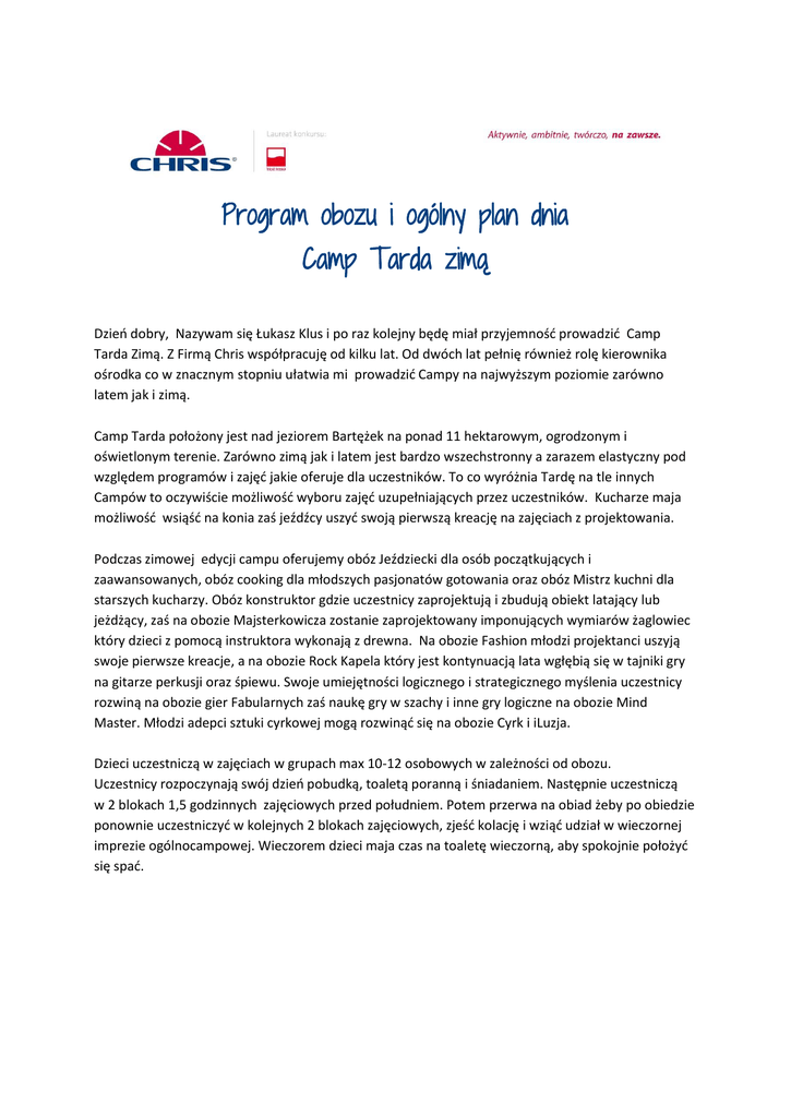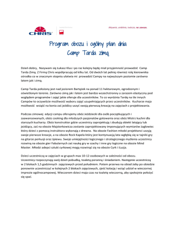 Program obozu i ogólny plan dnia Camp Tarda zimą Dzień dobry, Nazywam się Łukasz Klus i po raz kolejny będę miał przyjemność prowadzić Camp Tarda Zimą. Z Firmą Chris współpracuję od kilku lat. Od dwóch lat pełnię również rolę kierownika ośrodka co w znacznym stopniu ułatwia mi prowadzić Campy na najwyższym poziomie zarówno latem jak i zimą. Camp Tarda położony jest nad jeziorem Bartężek na ponad 11 hektarowym, ogrodzonym i oświetlonym terenie. Zarówno zimą jak i latem jest bardzo wszechstronny a zarazem elastyczny pod względem programów i zajęć jakie oferuje dla uczestników. To co wyróżnia Tardę na tle innych Campów to oczywiście możliwość wyboru zajęć uzupełniających przez uczestników. Kucharze maja możliwość wsiąść na konia zaś jeźdźcy uszyć swoją pierwszą kreację na zajęciach z projektowania. Podczas zimowej edycji campu oferujemy obóz Jeździecki dla osób początkujących i zaawansowanych, obóz cooking dla młodszych pasjonatów gotowania oraz obóz Mistrz kuchni dla starszych kucharzy. Obóz konstruktor gdzie uczestnicy zaprojektują i zbudują obiekt latający lub jeżdżący, zaś na obozie Majsterkowicza zostanie zaprojektowany imponujących wymiarów żaglowiec który dzieci z pomocą instruktora wykonają z drewna. Na obozie Fashion młodzi projektanci uszyją swoje pierwsze kreacje, a na obozie Rock Kapela który jest kontynuacją lata wgłębią się w tajniki gry na gitarze perkusji oraz śpiewu. Swoje umiejętności logicznego i strategicznego myślenia uczestnicy rozwiną na obozie gier Fabularnych zaś naukę gry w szachy i inne gry logiczne na obozie Mind Master. Młodzi adepci sztuki cyrkowej mogą rozwinąć się na obozie Cyrk i iLuzja. Dzieci uczestniczą w zajęciach w grupach max 10-12 osobowych w zależności od obozu. Uczestnicy rozpoczynają swój dzień pobudką, toaletą poranną i śniadaniem. Następnie uczestniczą w 2 blokach 1,5 godzinnych zajęciowych przed południem. Potem przerwa na obiad żeby po obiedzie ponownie uczestniczyć w kolejnych 2 blokach zajęciowych, zjeść kolację i wziąć udział w wieczornej imprezie ogólnocampowej. Wieczorem dzieci maja czas na toaletę wieczorną, aby spokojnie położyć się spać.