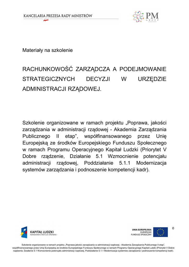Materiały na szkolenie RACHUNKOWOŚĆ ZARZĄDCZA A PODEJMOWANIE STRATEGICZNYCH DECYZJI W URZĘDZIE ADMINISTRACJI RZĄDOWEJ. Szkolenie organizowane w ramach projektu „Poprawa, jakości zarządzania w administracji rządowej - Akademia Zarządzania Publicznego II etap”, współfinansowanego przez Unię Europejską ze środków Europejskiego Funduszu Społecznego w ramach Programu Operacyjnego Kapitał Ludzki (Priorytet V Dobre rządzenie, Działanie 5.1 Wzmocnienie potencjału administracji rządowej, Poddziałanie 5.1.1 Modernizacja systemów zarządzania i podnoszenie kompetencji kadr). 0 Szkolenie organizowane w ramach projektu „Poprawa jakości zarządzania w administracji rządowej - Akademia Zarządzania Publicznego II etap”, współfinansowanego przez Unię Europejską ze środków Europejskiego Funduszu Społecznego w ramach Programu Operacyjnego Kapitał Ludzki (Priorytet V Dobre rządzenie, Działanie 5.1 Wzmocnienie potencjału administracji rządowej, Poddziałanie 5.1.1 Modernizacja systemów zarządzania i podnoszenie kompetencji kadr). 1. Rachunkowość zarządcza i rachunkowość finansowa - pojęcia ogólne. Rachunkowość (pojęcie ogólne). Rachunkowość jest procesem identyfikacji, pomiaru, przetwarzania i przekazywania informacji ekonomicznych, pozwalających na formułowanie opinii i decyzji przez uŜytkowników informacji. Informacje płynące z rachunkowości powinny umoŜliwić ich uŜytkownikom realizację dwóch podstawowych zadań: • ocena sytuacji ekonomicznej i finansowej organizacji (funkcja rachunkowości finansowej), • podejmowanie racjonalnych decyzji ekonomicznych (funkcja rachunkowości zarządczej). Ze względu na rodzaj odbiorców informacji system rachunkowości dzielimy na dwa podsystemy: • rachunkowość finansową (ze względu na odbiorców zewnętrznych), • rachunkowość zarządczą (ze względu na odbiorców wewnętrznych). Rachunkowość finansowa jest działem rachunkowości, którego zadaniem jest dostarczenie informacji uprawnionym odbiorcom zewnętrznym. Powinna być prowadzona zgodnie z zapisami wynikającymi z prawa podatkowego (ustawy o rachunkowości, rozporządzeń wykonawczych, polskich standardów rachunkowości, międzynarodowych standardów rachunkowości, wytycznych unijnych w zakresie prowadzenia rachunkowości w projektach unijnych). Podstawowym źródłem informacji są obligatoryjne sprawozdania finansowe, tj. bilans, rachunek zysków i strat, rachunek przepływów, informacja dodatkowa, zestawienia zmian w kapitale jednostki, sprawozdania z działalności jednostki. Rachunkowość zarządcza jest działem rachunkowości, którego zadaniem jest dostarczenie informacji odbiorcom wewnętrznym z Urzędu. Sposób prowadzenia rachunkowości 1 Szkolenie organizowane w ramach projektu „Poprawa jakości zarządzania w administracji rządowej - Akademia Zarządzania Publicznego II etap”, współfinansowanego przez Unię Europejską ze środków Europejskiego Funduszu Społecznego w ramach Programu Operacyjnego Kapitał Ludzki (Priorytet V Dobre rządzenie, Działanie 5.1 Wzmocnienie potencjału administracji rządowej, Poddziałanie 5.1.1 Modernizacja systemów zarządzania i podnoszenie kompetencji kadr). zarządczej zaleŜy w rachunkowości informacji dla od Kierownictwa Urzędu. Sposób zarządczej jest uwarunkowany kierownictwa są: sprawozdania przekazywania potrzebami finansowe informacji zarządzania. sporządzane Źródłami okresowo, dokumentacja i ewidencja księgowa, sprawozdania i raporty przygotowywane na bieŜąco w zaleŜności od potrzeb kierownictwa i odbiorców zewnętrznych. Celem rachunkowości zarządczej jest dostarczenie kierownictwu Urzędu informacji ekonomicznych niezbędnych do zabezpieczenia procesów zarządzania Urzędem, w tym wykonywania jego podstawowych funkcji, tj. planowania, organizowania, motywowania i kontrolowania. Rachunkowość zarządcza jest procesem identyfikacji, pomiaru, analizy, przygotowania i komunikowania informacji finansowych i niefinansowych (operacyjnych), wykorzystywanych przez kierownictwo do planowania, oceny i kontroli w ramach Urzędu w celu zapewnienia efektywnego wykorzystania chronionych zasobów, o których mowa w art. 68 ust. 2 pkt. 4.obowiązującej ustawy o finansach publicznych. Szczegółowe róŜnice między rachunkowością finansową i rachunkowością zarządczą przedstawiono w poniŜszej tabeli. Lp. Kryterium róŜnicujące Rachunkowość finansowa Rachunkowość zarządcza 1. Odbiorcy informacji Zewnętrzni Wewnętrzni 2. Zasady rachunkowości Zasada jako wiernego zasada obrazu, Zasada nadrzędna i informacji przydatności w zarządzaniu pozostałe zasady wynikające Urzędem. z ustawy o rachunkowości i międzynarodowych standardów rachunkowości. 3. Zakres uregulowań Przepisy prawa: ustawa o Sposób prowadzenia zaleŜy rachunkowości, inne akty. od priorytetów i potrzeb kierownictwa Urzędu. 4. Stopień ujednolicenia Jednolite systemy dla Zindywidualizowana, jednostek z róŜnych sektorów uzaleŜniona gospodarki narodowej. 5. Metody badawcze Metody od potrzeb Kierownictwa Urzędu. specyficzne: Metody róŜne, zaleŜnie od 2 Szkolenie organizowane w ramach projektu „Poprawa jakości zarządzania w administracji rządowej - Akademia Zarządzania Publicznego II etap”, współfinansowanego przez Unię Europejską ze środków Europejskiego Funduszu Społecznego w ramach Programu Operacyjnego Kapitał Ludzki (Priorytet V Dobre rządzenie, Działanie 5.1 Wzmocnienie potencjału administracji rządowej, Poddziałanie 5.1.1 Modernizacja systemów zarządzania i podnoszenie kompetencji kadr). bilansowa, 6. Procedura podwójnego rodzaju informacji i sytuacji zapisu. decyzyjnej. Ściśle określona. ZaleŜy od rodzaju informacji i przetwarzania sytuacji decyzyjnej. informacji 7. Zakres Obejmuje całą jednostkę. sprawozdawczości MoŜe obejmować jednostkę, całą jednostki wewnętrzne, określone zdarzenia. 8. Wymiar czasowy Informacje h
