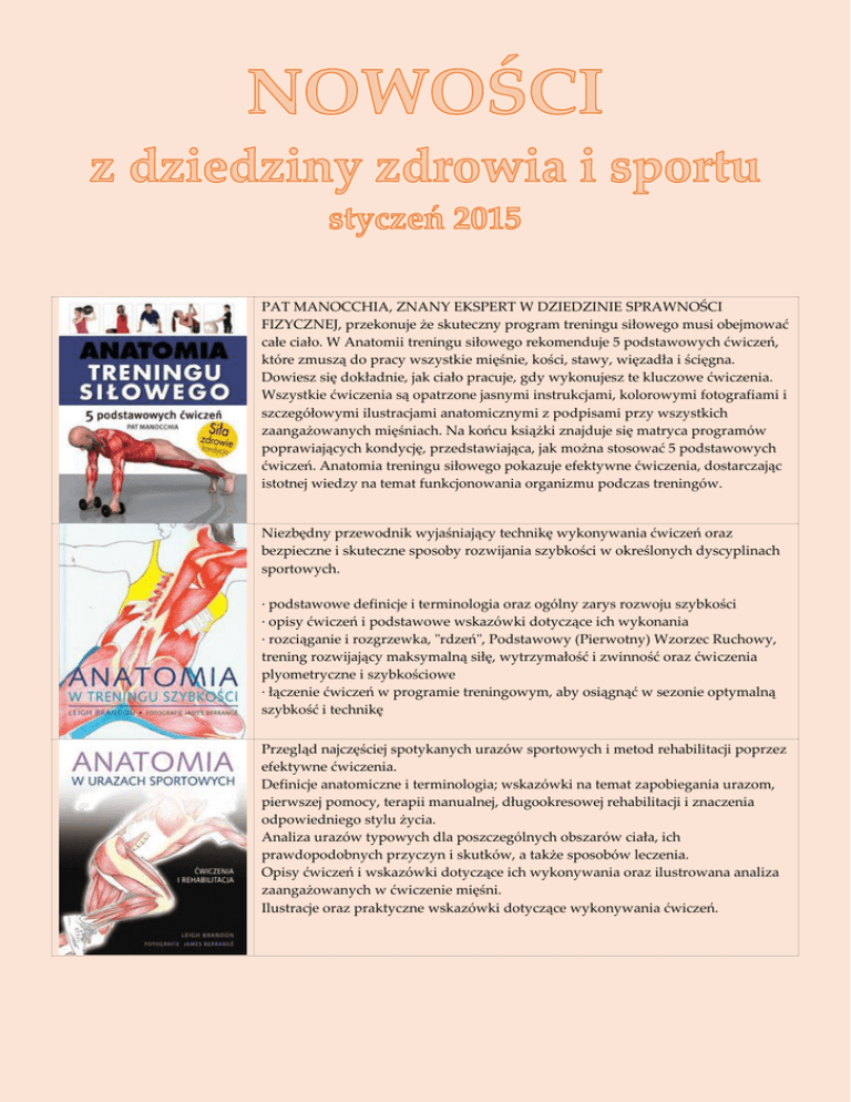 PAT MANOCCHIA, ZNANY EKSPERT W DZIEDZINIE SPRAWNOŚCI FIZYCZNEJ, przekonuje że skuteczny program treningu siłowego musi obejmować całe ciało. W Anatomii treningu siłowego rekomenduje 5 podstawowych ćwiczeń, które zmuszą do pracy wszystkie mięśnie, kości, stawy, więzadła i ścięgna. Dowiesz się dokładnie, jak ciało pracuje, gdy wykonujesz te kluczowe ćwiczenia. Wszystkie ćwiczenia są opatrzone jasnymi instrukcjami, kolorowymi fotografiami i szczegółowymi ilustracjami anatomicznymi z podpisami przy wszystkich zaangażowanych mięśniach. Na końcu książki znajduje się matryca programów poprawiających kondycję, przedstawiająca, jak można stosować 5 podstawowych ćwiczeń. Anatomia treningu siłowego pokazuje efektywne ćwiczenia, dostarczając istotnej wiedzy na temat funkcjonowania organizmu podczas treningów. Niezbędny przewodnik wyjaśniający technikę wykonywania ćwiczeń oraz bezpieczne i skuteczne sposoby rozwijania szybkości w określonych dyscyplinach sportowych. · podstawowe definicje i terminologia oraz ogólny zarys rozwoju szybkości · opisy ćwiczeń i podstawowe wskazówki dotyczące ich wykonania · rozciąganie i rozgrzewka, "rdzeń", Podstawowy (Pierwotny) Wzorzec Ruchowy, trening rozwijający maksymalną siłę, wytrzymałość i zwinność oraz ćwiczenia plyometryczne i szybkościowe · łączenie ćwiczeń w programie treningowym, aby osiągnąć w sezonie optymalną szybkość i technikę Przegląd najczęściej spotykanych urazów sportowych i metod rehabilitacji poprzez efektywne ćwiczenia. Definicje anatomiczne i terminologia; wskazówki na temat zapobiegania urazom, pierwszej pomocy, terapii manualnej, długookresowej rehabilitacji i znaczenia odpowiedniego stylu życia. Analiza urazów typowych dla poszczególnych obszarów ciała, ich prawdopodobnych przyczyn i skutków, a także sposobów leczenia. Opisy ćwiczeń i wskazówki dotyczące ich wykonywania oraz ilustrowana analiza zaangażowanych w ćwiczenie mięśni. Ilustracje oraz praktyczne wskazówki dotyczące wykonywania ćwiczeń. Książka stanowi pomoc dydaktyczną ułatwiającą przyswojenie wiadomości z zakresu motoryczności człowieka, jej struktury oraz procesu motorycznego uczenia się. W przystępny sposób przedstawiono zagadnienia związane z zależnością pomiędzy budową somatyczną i tempem wzrastania, a sprawnością fizyczną w aspekcie uwarunkowań środowiskowych, na tle długookresowych zmian. W przewodniku zamieszczono najczęściej stosowane testy pomiarowe, normy i układy odniesienia ułatwiające ocenę aktualnego potencjału motorycznego dzieci i młodzieży. Publikacja przeznaczona jest głównie dla studentów akademii wychowania fizycznego oraz kierunków pokrewnych związanych z edukacją fizyczną i zdrowotną dzieci i młodzieży. Pełni rolę notatnika przydatnego w przyszłej pracy nauczyciela wychowania fizycznego, fizjoterapeuty, instruktora czy trenera. "Jest to pierwsza na rynku polskim, stosunkowo obszerna pozycja poświęcona tylko dziedzinie aqua fitness. Wcześniejsze opracowania w większości dotyczyły zagadnień pływania sportowego, zdrowotnego, profilaktyki wad postawy. W związku z tym omawianą pracę uważam jako godną uwagi i wielce przydatną dla instruktorów aqua fitness, osób związanych z treningiem fizycznym w środowisku wodnym, w tym dla nauczycieli i trenerów pływania, ratowników, nauczycieli wychowania fizycznego i fizjoterapeutów. Książkę "Metodyczne podstawy aqua fitness" polecić muszę również uczestnikom zajęć aqua fitness, którzy chcą poznać bliżej teoretyczne podstawy tej formy rekreacji oraz zasady praktycznego jej zastosowania. Zaletą treści omawianej pracy jest to, że jej Autorki korzystały z doświadczeń światowego aqua fitness, w tym Speedo Aquatic Fitness System oraz doświadczeń najlepszych praktyków i teoretyków aqua fitness na świecie. Podnosi to wartość niniejszej pracy i przybliża ją do poziomu obecnych wymogów." Najlepszy tytuł jaki ukazał się w 2015 roku odnoszący się do jednej z najpopularniejszych dyscyplin ostatnich lat czyli biegania. Biegaj bez kontuzji to książka, która pomoże biegaczom w każdym wieku i na każdym poziomie umiejętności zrozumieć przyczyny powstawania kontuzji, jak im zapobiegać, a jeśli już się przydarzą – jak skrócić okres powrotu do zdrowia. Kontuzje są plagą większości biegaczy; rujnują plany treningowe i skracają kariery biegaczy o całe dekady, a można ich uniknąć. Autorzy Robert Foster i Roy M. Wallack wyjaśniają, w jaki sposób można ich uniknąć kontuzji, dzięki prawidłowemu treningowi, ćwiczeniom siłowym, rozciąganiu, odpowiedniej formie biegowej i strategii żywieniowej. BODY LOGISTIC SYSTEM przedstawia kompleksowe podejście do tematu kształtowania sylwetki i zdrowego odżywiania. W książce znajdziecie: setki nowatorskich pomysłów na dietetyczne posiłki dla każdego, na każdą porę dnia, dzięki którym słowo „dieta” przestanie kojarzyć się z monotonią; najnowsze doniesienia na temat zdrowego odżywiania (m.in. o żywieniu stabilizującym poziom cukru we krwi), porady dietetyczne nie tylko dla sportowców; trening Muscle Fit System – innowacyjny, dynamicznie rozwijający się system treningowy wymagający minimalnego sprzętu. Katarzyna Matella – wykładowca na szkoleniach dla instruktorów sportu i rekreacji ruchowej, współorganizator nowatorskich inicjatyw edukacyjnych z zakresu treningu i żywienia w Stowarzyszeniu Sylwetka, była zawodniczka, żywieniowiec zawodników w kulturystyce i fitness, autorka wielu publikacji z zakresu żywienia i suplementacji, sędzina klasy międzynarodowej w kulturystyce i fitness, autorka książek Supersylwetka. 100 przepisów i porad eksperta oraz Fitness. Zdrowie i uroda. Masz dosyć zbędnych kilogramów? Marzysz o płaskim brzuchu, pięknie wyrzeźbionych nogach i jędrnych pośladkach? Program Brzuch - Nogi - Pośladk
