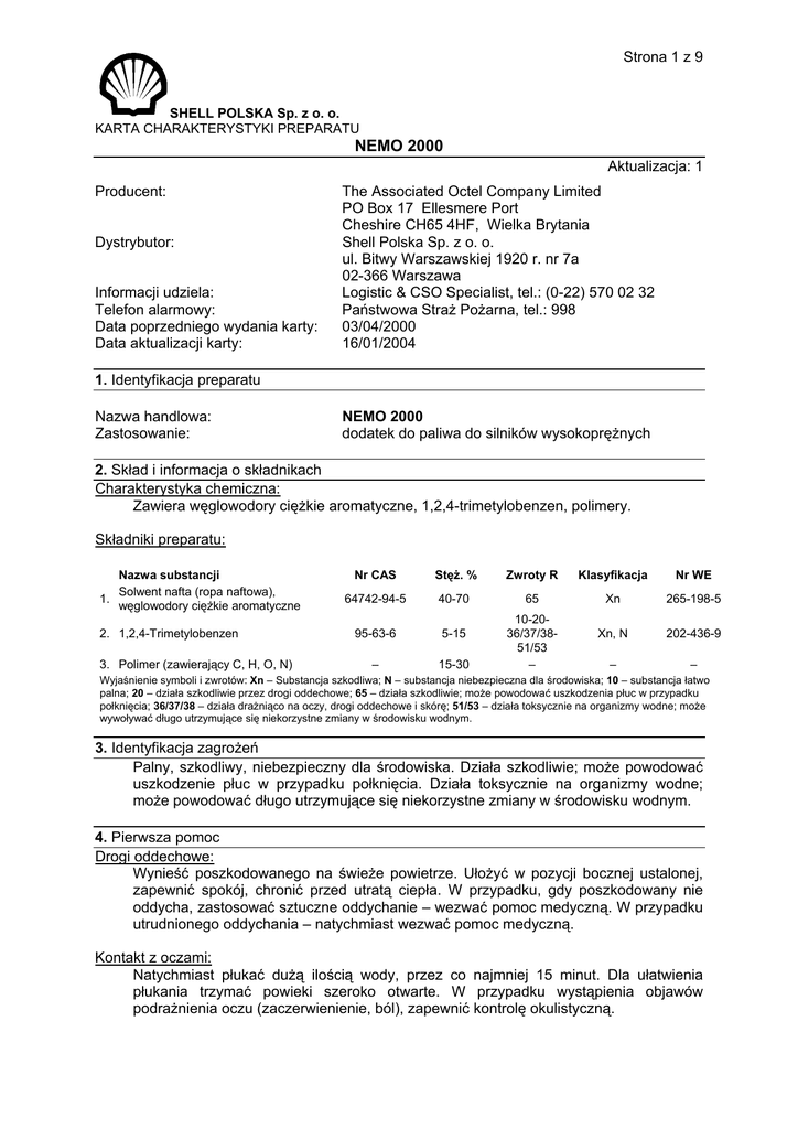 Strona 1 z 9 SHELL POLSKA Sp. z o. o. KARTA CHARAKTERYSTYKI PREPARATU NEMO 2000 Aktualizacja: 1 Producent: Dystrybutor: Informacji udziela: Telefon alarmowy: Data poprzedniego wydania karty: Data aktualizacji karty: The Associated Octel Company Limited PO Box 17 Ellesmere Port Cheshire CH65 4HF, Wielka Brytania Shell Polska Sp. z o. o. ul. Bitwy Warszawskiej 1920 r. nr 7a 02-366 Warszawa Logistic & CSO Specialist, tel.: (0-22) 570 02 32 Państwowa Straż Pożarna, tel.: 998 03/04/2000 16/01/2004 1. Identyfikacja preparatu Nazwa handlowa: Zastosowanie: NEMO 2000 dodatek do paliwa do silników wysokoprężnych 2. Skład i informacja o składnikach Charakterystyka chemiczna: Zawiera węglowodory ciężkie aromatyczne, 1,2,4-trimetylobenzen, polimery. Składniki preparatu: Nazwa substancji Solwent nafta (ropa naftowa), 1. węglowodory ciężkie aromatyczne 2. 1,2,4-Trimetylobenzen 3. Polimer (zawierający C, H, O, N) Nr CAS Stęż. % Zwroty R Klasyfikacja Nr WE 64742-94-5 40-70 65 Xn 265-198-5 95-63-6 5-15 Xn, N 202-436-9 – 15-30 – – 10-2036/37/3851/53 – Wyjaśnienie symboli i zwrotów: Xn – Substancja szkodliwa; N – substancja niebezpieczna dla środowiska; 10 – substancja łatwo palna; 20 – działa szkodliwie przez drogi oddechowe; 65 – działa szkodliwie; może powodować uszkodzenia płuc w przypadku połknięcia; 36/37/38 – działa drażniąco na oczy, drogi oddechowe i skórę; 51/53 – działa toksycznie na organizmy wodne; może wywoływać długo utrzymujące się niekorzystne zmiany w środowisku wodnym. 3. Identyfikacja zagrożeń Palny, szkodliwy, niebezpieczny dla środowiska. Działa szkodliwie; może powodować uszkodzenie płuc w przypadku połknięcia. Działa toksycznie na organizmy wodne; może powodować długo utrzymujące się niekorzystne zmiany w środowisku wodnym. 4. Pierwsza pomoc Drogi oddechowe: Wynieść poszkodowanego na świeże powietrze. Ułożyć w pozycji bocznej ustalonej, zapewnić spokój, chronić przed utratą ciepła. W przypadku, gdy poszkodowany nie oddycha, zastosować sztuczne oddychanie – wezwać pomoc medyczną. W przypadku utrudnionego oddychania – natychmiast wezwać pomoc medyczną. Kontakt z oczami: Natychmiast płukać dużą ilością wody, przez co najmniej 15 minut. Dla ułatwienia płukania trzymać powieki szeroko otwarte. W przypadku wystąpienia objawów podrażnienia oczu (zaczerwienienie, ból), zapewnić kontrolę okulistyczną. Strona 2 z 9 SHELL POLSKA Sp. z o. o. KARTA CHARAKTERYSTYKI PREPARATU NEMO 2000 Aktualizacja: 1 Kontakt ze skórą: Natychmiast zdjąć zanieczyszczoną odzież. Natychmiast przemyć skórę dużą ilością wody z mydłem. W przypadku, gdy podrażnienie skóry utrzymuje się - skontaktować się z lekarzem. Połknięcie: Przepłukać jamę ustną wodą. Osobie nieprzytomnej nie podawać niczego doustnie. Nie wywoływać wymiotów. Jeśli poszkodowany wymiotuje, pochylić głowę nisko, aby zapobiec przedostaniu się treści pokarmowej do dróg oddechowych (niebezpieczeństwo odmy płucnej i zachłystowego zapalenia płuc). Natychmiast wezwać lekarza. 5. Postępowanie w przypadku pożaru Odpowiednie środki gaśnicze: Woda – rozproszone prądy wodne, ditlenek węgla, gaśnice proszkowe, pianowe. Środki gaśnicze, których nie wolno używać ze względów bezpieczeństwa: Nie stosować zwartych strumieni wody na powierzchnię cieczy. Szczególne zagrożenia: Palna ciecz. Pary mogą tworzyć wybuchowe mieszaniny z powietrzem. Pary są cięższe od powietrza, gromadzą się przy powierzchni ziemi i w dolnych partiach pomieszczeń; mogą przemieszczać się wzdłuż podłoża na znaczne odległości. Jeżeli dotrą do źródeł zapłonu mogą spowodować wsteczny ciąg płomienia. Zbiorniki narażone na działanie ognia lub wysokiej temperatury mogą eksplodować. Niebezpieczne produkty rozkładu: Możliwe jest powstanie ditlenku węgla (CO2), tlenku węgla (CO), tlenków azotu (NOx). Specjalne wyposażenie ochronne dla strażaków: Podczas pożaru mogą powstawać substancje szkodliwe dla zdrowia. Nałożyć odzież ochronną gazoszczelną i aparat izolujący drogi oddechowe (aparat tlenowy skompletowany z maską). Inne informacje: Palące się zbiorniki lub rozlewiska gasić pianą lub rozproszonymi prądami wody; nie stosować zwartych strumieni wody na powierzchnię cieczy. Zbiorniki narażone na działanie ognia lub wysokiej temperatury chłodzić wodą z bezpiecznej odległości (groźba wybuchu), o ile to możliwe usunąć z obszaru zagrożenia. Woda skażona środkami gaśniczymi musi być usuwana jako odpad niebezpieczny. Zawiadomić otoczenie o pożarze. Usunąć z obszaru zagrożenia wszystkie osoby nie biorące udziału w likwidowaniu pożaru. Powiadomić Państwową Straż Pożarną, a w razie konieczności także Policję Państwową, najbliższe władze terenowe i najbliższą jednostkę Ratownictwa Chemicznego. 6. Postępowanie w przypadku niezamierzonego uwolnienia do środowiska Indywidualne środki ostrożności: Środki ochrony indywidualnej jak podano w punkcie 8. Strona 3 z 9 SHELL POLSKA Sp. z o. o. KARTA CHARAKTERYSTYKI PREPARATU NEMO 2000 Aktualizacja: 1 Środki ostrożności w zakresie ochrony środowiska: W przypadku awarii nie dopuszczać do zrzutów do środowiska. Zabezpieczyć produkt przed przedostaniem się do kanałów ściekowych, wód gruntowych, gleby. Próbować zebrać, jak tylko to możliwe, do odpowiednich pojemników celem dalszej utylizacji. Metody oczyszczania: Zapoznać się z informacjami podanymi w karcie dotyczącymi właściwości fizykochemicznych, zagrożeń dla zdrowia, środków ochrony indywidualnej. Przewietrzyć pomieszczenie. Usunąć osoby niezabezpieczone z zagrożonego obszaru. Usunąć źródła zapłonu (ugasić otwarty ogień, ogłosić zakaz palenia i używania narzędzi iskrzących); zabezpieczyć studzienki ściekowe; unikać bezpośredniego kontaktu z uwalniającą się substancją; unikać wdychania par. Przy duż