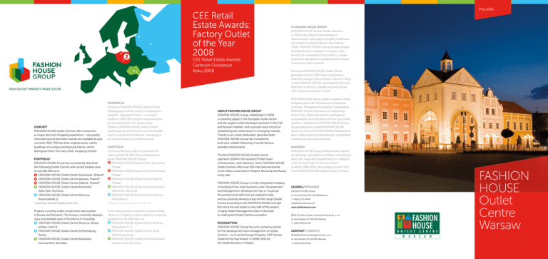 6 5 3 1 2 4 7 CONCEPT FASHION HOUSE Outlet Centres offer consumers a unique discount shopping experience – top quality international and domestic brands are available all year round for 30%-70% less than original prices, within buildings of a unique architectural theme, which distinguish them from any other shopping centres. KONCEPCJA W ofercie FASHION HOUSE Outlet Centre znajdują się produkty znanych międzynarodowych i krajowych marek – w cenach średnio o 30%-70% niższych w porównaniu do standardowych cen sklepowych. Obiekty FASHION HOUSE Outlet Centre wyróżniają się na tle innych centrów handlowych oryginalną architekturą, nawiązującą do lokalnej tradycji architektonicznej. PORTFOLIO FASHION HOUSE Group has successfully delivered the following Outlet Centres with a total lettable area of over 86,400 sq m: 1 FASHION HOUSE Outlet Centre Sosnowiec, Poland* 2 FASHION HOUSE Outlet Centre Warsaw, Poland* 3 FASHION HOUSE Outlet Centre Gdańsk, Poland* 4 FASHION HOUSE Outlet Centre Bucharest, West Park, Romania 5 FASHION HOUSE Outlet Centre Moscow, Russia (phase 1) PORTFOLIO Centra outletowe (o łącznej powierzchni najmu ponad 86 400 mkw.) zrealizowane przez FASHION HOUSE Group: 1 FASHION HOUSE Outlet Centre Sosnowiec, Polska* 2 FASHION HOUSE Outlet Centre Warszawa, Polska* 3 FASHION HOUSE Outlet Centre Gdańsk, Polska* 4 FASHION HOUSE Outlet Centre Bukareszt West Park, Rumunia 5 FASHION HOUSE Outlet Centre Moskwa, Rosja (faza 1) * owned by Polonia Property Fund II Ltd * własność Polonia Property Fund II Ltd Projects currently under construction are located in Russia and Romania. The Group is currently developing a total lettable area of 50,640 sq m including: 5 FASHION HOUSE Outlet Centre Moscow, Russia (phase 2 and 3) 6 FASHION HOUSE Outlet Centre St Petersburg, Russia 7 FASHION HOUSE Outlet Centre Bucharest, Cernica Park, Romania Firma realizuje kilka projektów na terenie Rosji i Rumunii. Projekty w trakcie realizacji (o łącznej powierzchni 50 640 mkw.) to: 5 FASHION HOUSE Outlet Centre Moskwa, Rosja (faza 2 i 3) 6 FASHION HOUSE Outlet Centre Sankt Petersburg, Rosja 7 FASHION HOUSE Outlet Centre Bukareszt Cernica Park, Rumunia CEE Retail Estate Awards: Factory Outlet of the Year 2008 CEE Retail Estate Awards: Centrum Outletowe Roku 2008 ABOUT FASHION HOUSE GROUP FASHION HOUSE Group, established in 2000, is a leading player in the European outlet sector and the largest outlet developer/operator in the CEE and Russian markets, with a proven track record of establishing the outlet sector in emerging markets. Thanks to an outlet-dedicated, specialist team, FASHION HOUSE Group has consistently built up a notable following of world-famous branded retail tenants. The first FASHION HOUSE Outlet Centre opened in 2004 in the southern Polish town of Sosnowiec, near Katowice. Now, FASHION HOUSE Outlet Centres offer over 250 international brands to 10 million customers in Poland, Romania and Russia every year. FASHION HOUSE Group is a fully integrated company consisting of two main business units: Development and Management. Development has in-house all the professional skills that are needed to fully and successfully develop a top-of-the-range Outlet Centre according to the FASHION HOUSE concept. But since the real estate is only half of the project, a highly skilled Management team is devoted to making the Outlet Centre successful. POLAND O FASHION HOUSE GROUP FASHION HOUSE Group została założona w 2000 roku. Obecnie jest wiodącym deweloperem realizującym projekty outletowe na rynkach Europy Środkowo-Wschodniej i Rosji. FASHION HOUSE Group posiada bogate doświadczenie w realizacji inwestycji outletowych na rozwijających się rynkach, a dzięki zespołowi specjalistów zyskała zaufanie marek znanych na całym świecie. Pierwsze FASHION HOUSE Outlet Centre powstało w lutym 2004 roku w Sosnowcu. Obecnie każdego roku w Polsce, Rumunii i Rosji centra FASHION HOUSE odwiedza 10 milionów klientów, na których czekają produkty ponad 250 międzynarodowych marek. FASHION HOUSE Group działa w oparciu o dwie integralne jednostki: Development (zespół ds. rozwoju) i Management (zespół ds. zarządzania). FASHION HOUSE Development dysponuje know-how i doświadczeniem niezbędnym w budowaniu wysokiej klasy centrów typu outlet, zgodnie z założeniami FASHION HOUSE Group. Wyspecjalizowany zespół FASHION HOUSE Group w ramach FASHION HOUSE Management dba o odpowiednią komercjalizację i zarządzanie obiektem po jego wybudowaniu. NAGRODY FASHION HOUSE Group zdobyła wiele nagród za realizację i zarządzanie centrami outletowymi, takich jak. nagroda EuropaProperty w kategorii „CEE Factory Outlet of the Year Award” w latach 2008-2010, dla każdego z trzech centrów FASHION HOUSE Outlet Centre w Polsce. FASHION HOUSE Outlet Centre Warsaw LEASING / WYNAJEM FASHION HOUSE Group Al. Jerozolimskie 212, 02-486 Warsaw T: +48 22 571 44 44 [email protected] www.fashionhouse.com BOIG The Blue Ocean Investment Group Sp. z o.o. al. Jana Pawła II 25, 00-854 Warsaw RECOGNITION FASHION HOUSE Group has won numerous prizes for the development and management of Outlet Centres – such as the Europa Property ‘CEE Factory Outlet of the Year Award’ in 2008-2010 for the Outlet Centres in Poland. T: +48 22 653 46 20 Contact / КОNТАКT PEAKSIDE Polonia Management Sp. z o.o. al. Jana Pawła II 29, 00-867 Warsaw T: +48 22 653 69 00 W A R S A W POLSKA FASHION HOUSE Outlet Centre warsaw FASHION HOUSE Outlet Centre Warsaw, the largest FASHION HOUSE Outlet Centre in Poland, is also one of the most successful ones, due to its prime location in the vicinity of the thriving Polish capital as well as a perfect mix of local and international high-street and luxury brands. FASHION HOUSE Outlet Centre Warszawa to nie tylko największe, lecz również jedno z najlepiej prosperujących centrów typu outlet wybudowanych przez FASHION HOUSE Group w Polsce. Sukces zawdzięcza przede wszystkim doskonałe